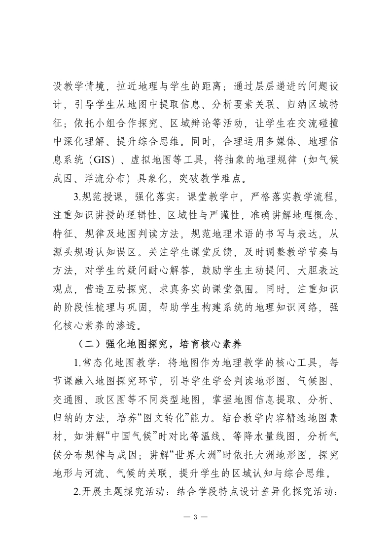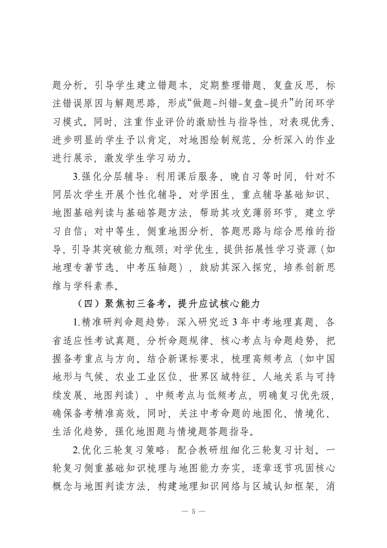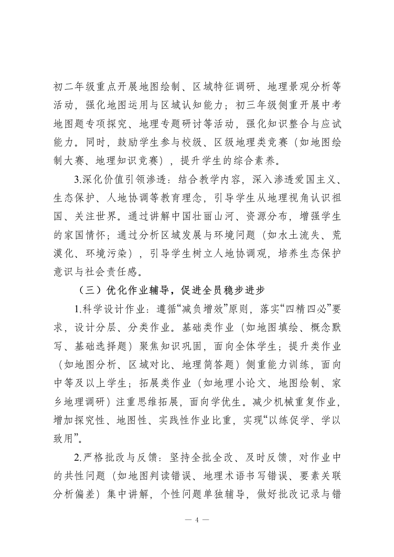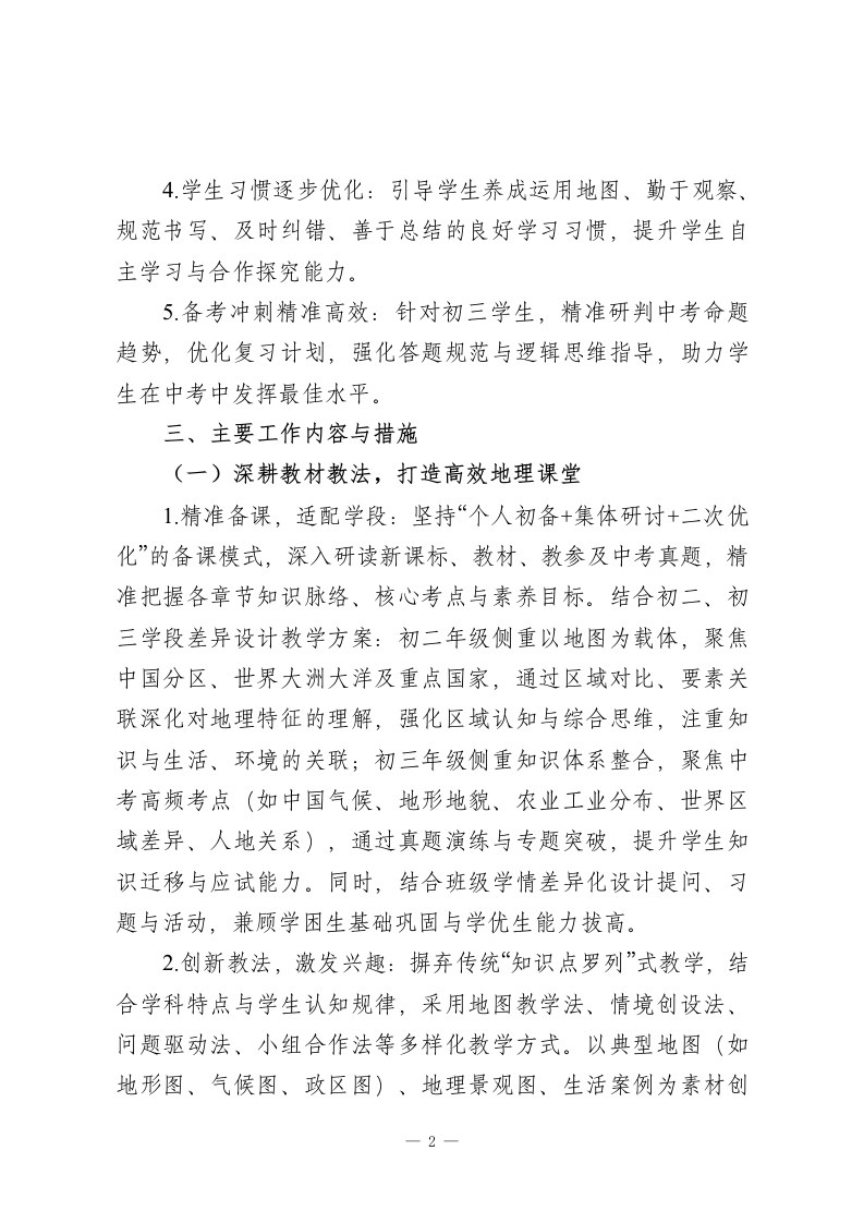 2025-2026学年春季第二学期初中地理教师工作计划:探地域之韵,育家国之心本学期,我将结合学校教学部署与学生学情,秉持“图文为基、区域为核、素养为要”的教学理念,统筹推进备课授课、地图探究、作业辅导、备考冲刺等各项工作,不断提升自身专业能力与教学质量,助力学生在地理学习中洞察地域差异、践行协调理念、拓宽全球视野。一、指导思想深化“教-学-评一致性”改革,引导学生主动运用地图工具、探究区域特征、分析人地关系,增强对祖国大好河山的热爱与对全球环境的关注,树立正确的资源观、环境观、发展观,培养担当民族复兴大任的时代新人。二、工作目标1.教学质量稳步提升:立足学段学情精准施教,确保初二学生夯实知识基础、深化区域思维,初三学生突破中考考点、提升应试能力,各学段学生地理成绩与核心素养均有显著进步。2.自身能力持续精进:积极参与教研研修与教学实践,深耕教材教法与中考备考策略,提升地图设计、课堂调控、命题评卷能力,形成兼具地理特色与亲和力的个性化教学风格。3.素养培育落地见效:将核心素养培育融入教学全过程,通过地图探究、区域分析、实践调研等方式,强化学生的区域认知、综合思维与人地协调观,引导学生学以致用。1
