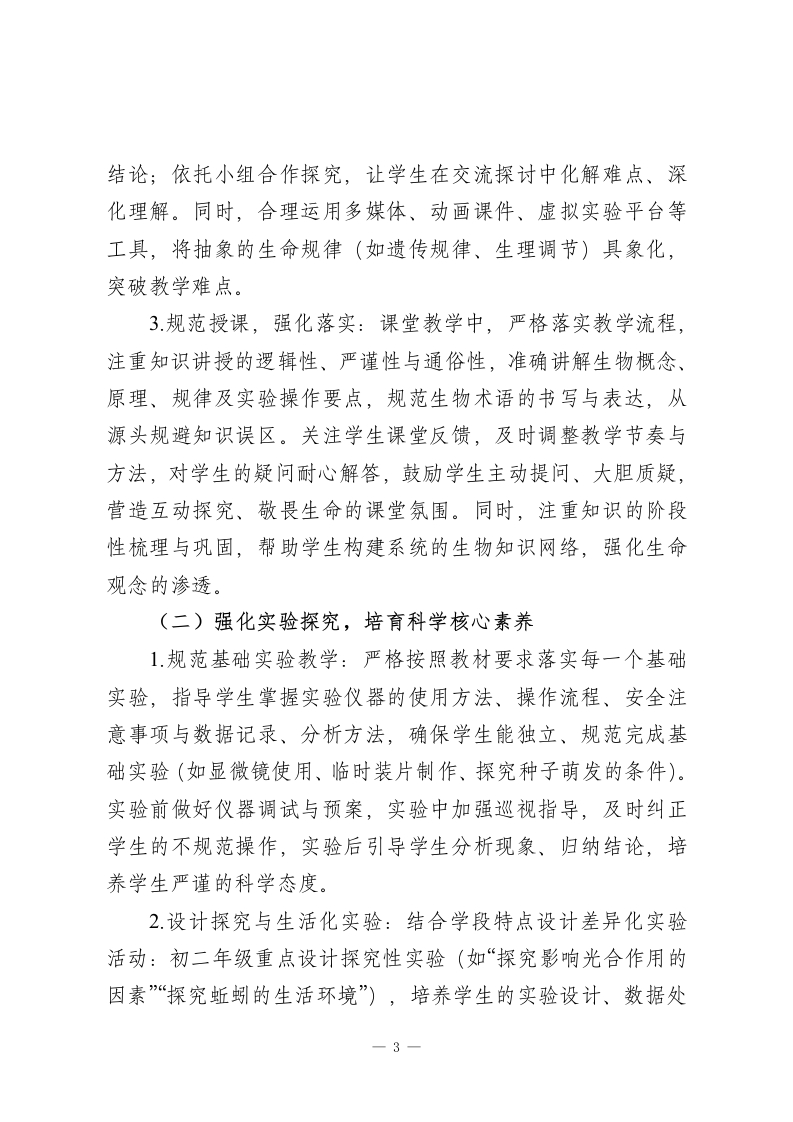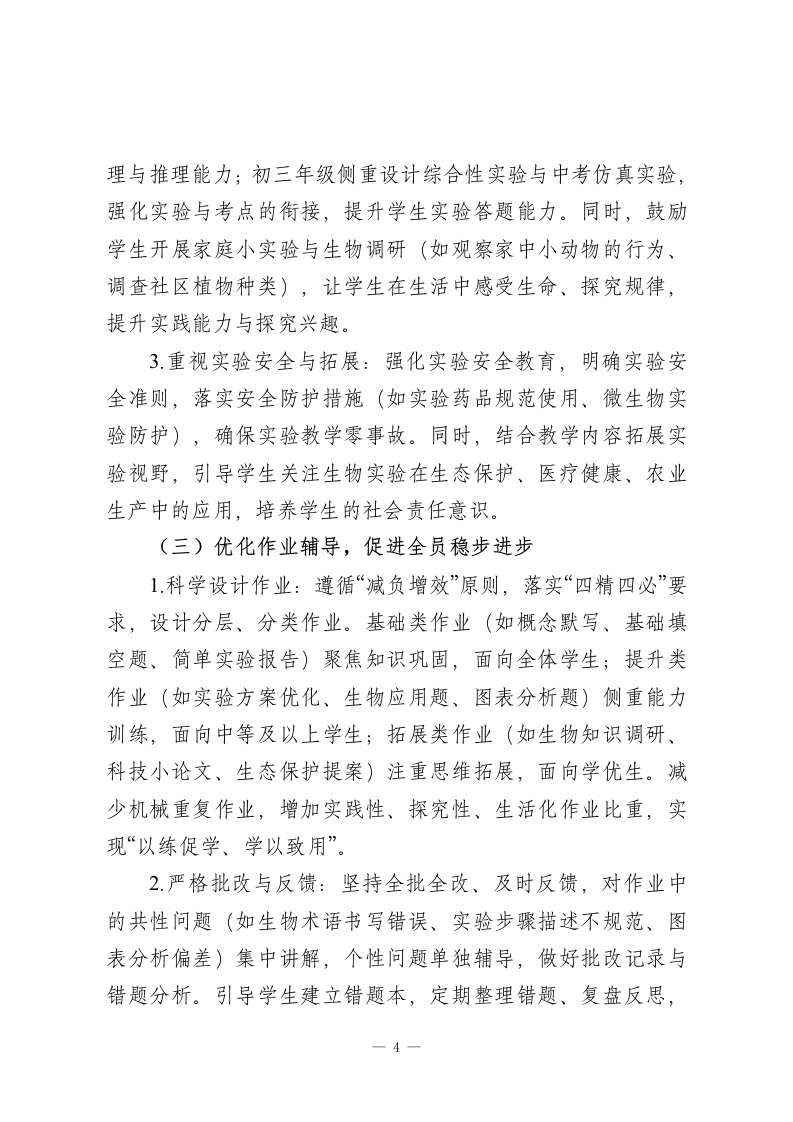 2025-2026学年春季第二学期初中生物教师工作计划:探生命奥秘,育科学素养本学期,我将统筹推进备课授课、实验教学、作业辅导、备考冲刺等各项工作,不断提升自身专业能力与教学质量,助力学生在生物学习中敬畏生命、锤炼思维、提升素养。一、指导思想坚持理论与实践相结合、知识与素养相融合,深化“教-学评一致性”改革,引导学生主动观察生命现象、探究生命规律、践行社会责任,培养学生的科学素养与人文情怀,为学生学业发展与终身成长奠定坚实基础。二、工作目标1.教学质量稳步提升:立足学段学情精准施教,确保初二学生夯实知识基础、深化生命观念,初三学生突破中考考点、提升应试能力,各学段学生生物成绩与核心素养均有显著进步。2.自身能力持续精进:积极参与教研研修与教学实践,深耕教材教法与中考备考策略,提升实验设计、课堂调控、命题评卷能力,形成适配初中学生的个性化教学风格。3.实验探究落地见效:落实新课标实验教学要求,规范基础实验操作,设计生活化、探究性实验活动,激发学生学习兴趣,培养学生的实验技能与探究思维。4.学生习惯逐步优化:引导学生养成勤于观察、主动探究、及时纠错、规范书写、善于总结的良好学习习惯,提升学生自1