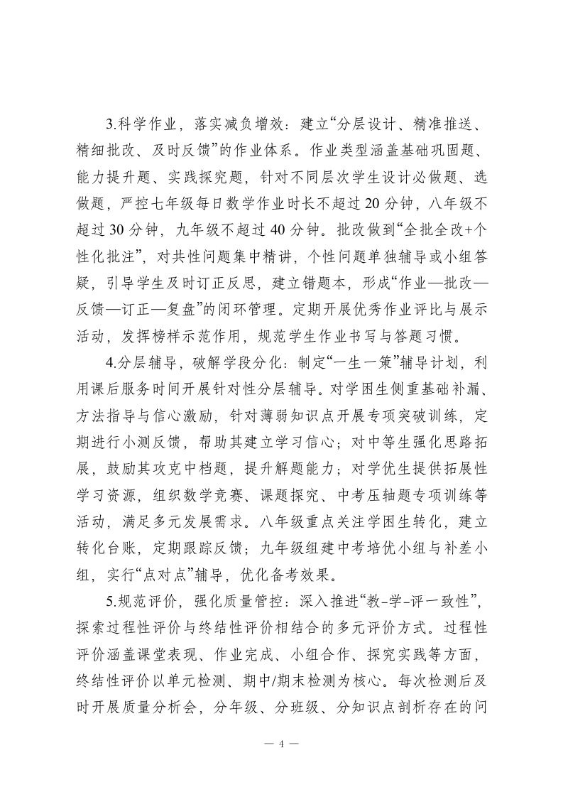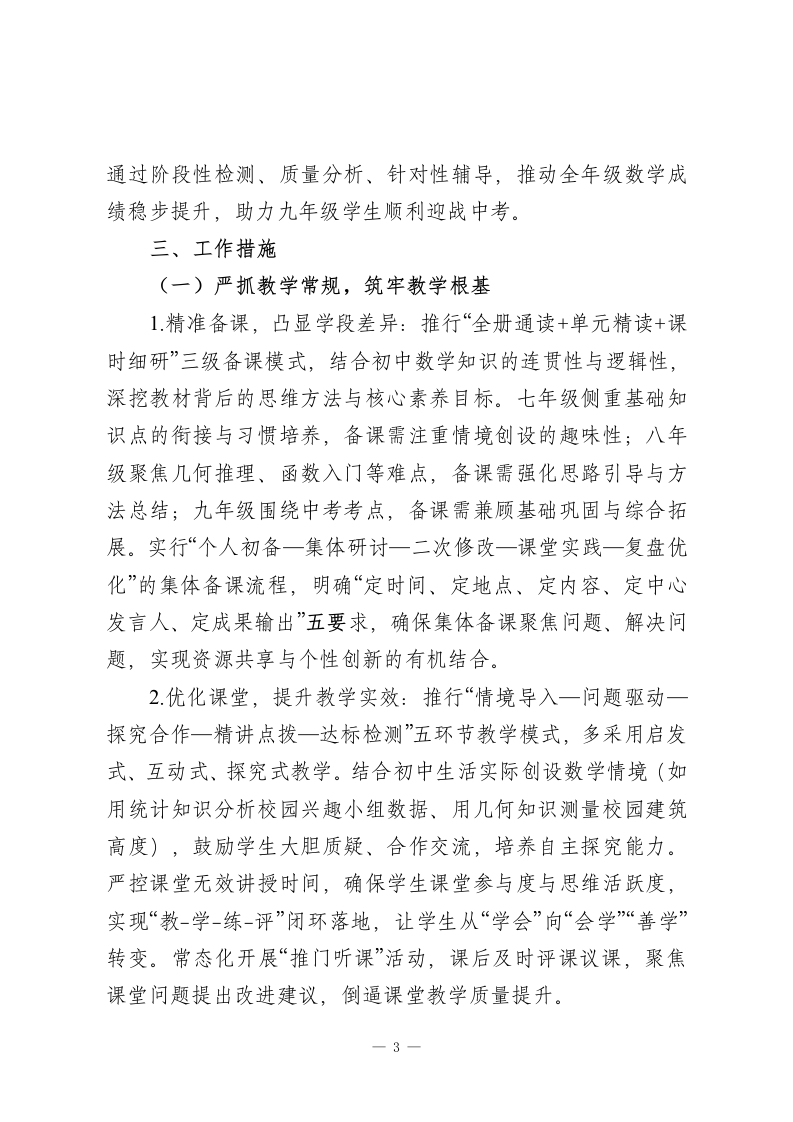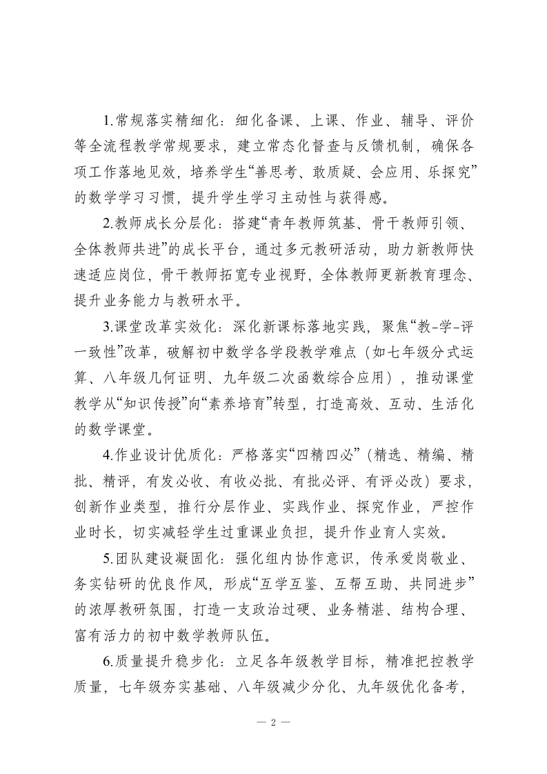 2025-2026学年春季第二学期初中数学教研组工作计划:策马研思提质,聚力素养育人教研组将以2022版数学新课标为核心纲领,紧扣“立德树人”根本任务,深度落实“双减”政策与学校整体教学部署,立足初中七、八、九年级不同学段的学情特点与教学重难点,秉持“素养导向、学生为本、教研赋能、质量为先”的工作理念。通过聚焦课堂教学改革、优化作业设计、强化师资队伍建设、深化课题研究与校本研修,推动教师专业能力迭代与学生数学核心素养双向提升,构建高效、生动、务实的初中数学教学生态,助力学校教育教学质量稳步进阶,为学生的数学学习生涯筑牢根基。一、指导思想以2022版数学新课标为行动指南,立足初中数学学科的工具性与逻辑性,结合春季学期教学进度安排(七年级夯实基础、八年级突破难点、九年级备战中考),聚焦数学核心素养(数感、运算能力、几何直观、推理能力、模型观念等)的培育。坚持以课堂为核心阵地,以教研为重要抓手,以作业改革为突破点,统筹推进教学常规落实、教师队伍建设、特色教研打造等工作,摒弃形式主义,注重实效落地,促进每位学生在数学学习中实现个性化成长,推动教研组工作再上新台阶。二、工作目标一1