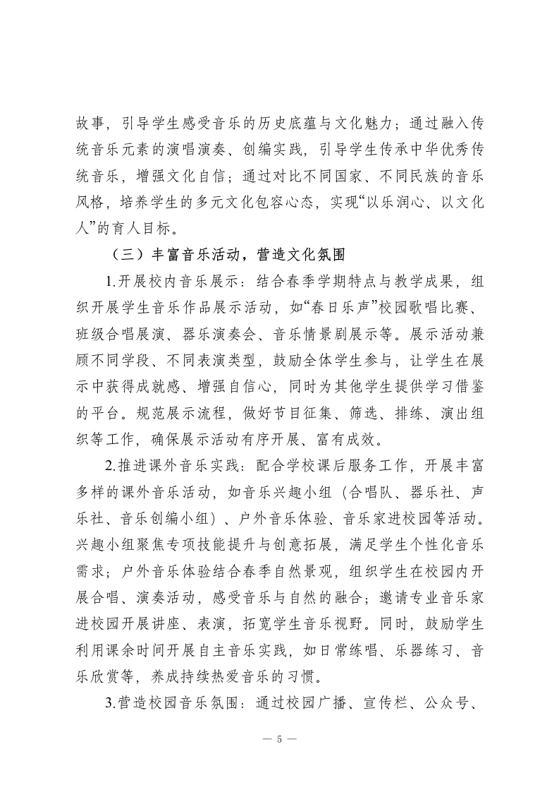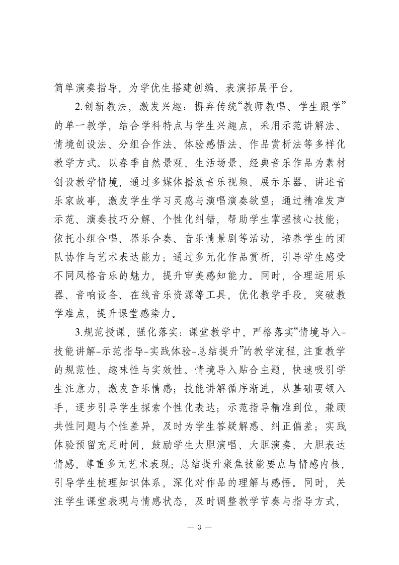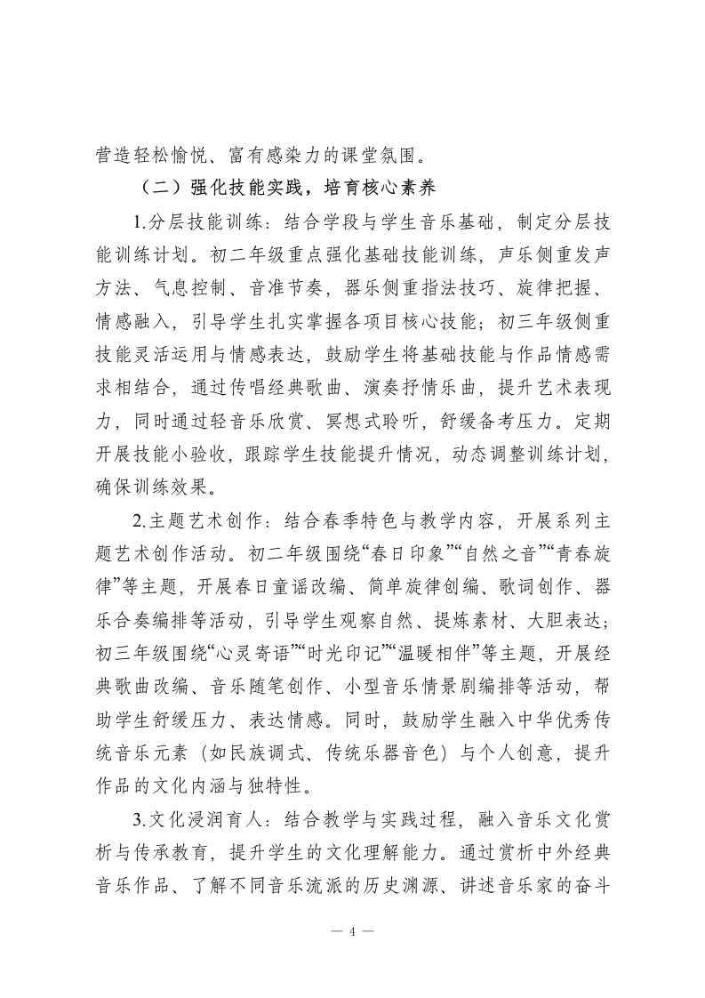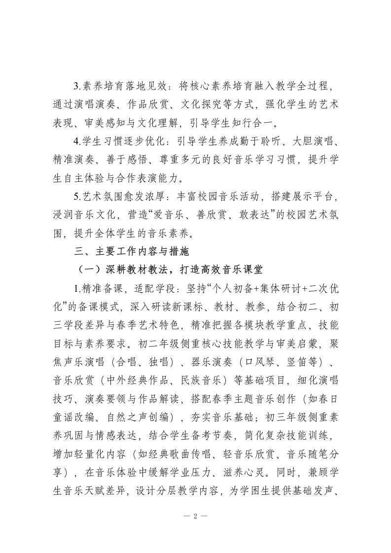 2025-2026学年春季第二学期初中音乐教师工作计划:乐润童心传雅韵,艺启芳华育新人本学期,我将秉持“以乐育人、以美启智、因材施教”的教学理念,统筹推进课堂教学、艺术实践、舞台展示、文化浸润等各项工作,不断提升自身专业能力与教学质量,助力学生在音乐学习中感受美、表达美、传承美,涵养高尚审美情趣与健全人格。一、指导思想技能培养与审美体验并重、作品欣赏与文化传承融合、普及与提升兼顾,深化“教-学-评一致性”改革,引导学生主动参与音乐实践,感受音乐魅力,传承中华优秀传统音乐与世界优秀音乐文化,树立正确的审美观、文化观,培养兼具音乐素养与人文情怀的时代新人。二、工作目标1.教学质量稳步提升:立足学段学情精准施教,确保初二学生夯实演唱演奏基础、提升审美感知能力,初三学生巩固音乐素养、激发艺术表达潜能,各学段学生音乐表现力与作品理解度均有显著进步。2.自身能力持续精进:积极参与教研研修与教学实践,深耕教材教法与音乐表演技巧,提升课堂组织、示范指导、作品解读能力,形成兼具专业性与感染力的个性化教学风格。1