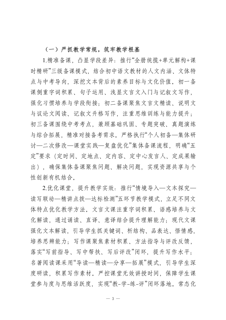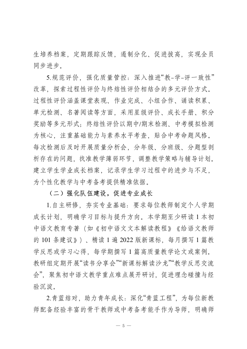 2025-2026学年春季第二学期初中语文教研组工作计划:文以载道育初心,研思赋能促提升本教研组将紧扣“立德树人”根本任务,深度落实“双减”政策与学校整体教学部署,秉持“以文育人、素养为核、教研赋能、协同共进”的工作理念,以课堂教学改革为核心,以作业优化设计为突破,以师资队伍建设为支撑,以中考备考为重点,统筹推进常规落实、教研创新、特色培育等工作,推动教师专业能力迭代与学生语文核心素养(语言建构与运用、思维发展与提升、审美鉴赏与创造、文化传承与理解)双向提升,构建厚重鲜活、务实高效的初中语文教学生态,为学生学业进阶与终身发展筑牢根基。一、指导思想初中语文的学科属性与初中生身心发展规律,结合春季学期教学节奏与中考备考节点,以核心素养培育为核心目标,紧扣各年级教学重难点与中考命题趋势。坚持以课堂为第一阵地,以教研为重要抓手,摒弃形式主义、注重实效落地,深化“教学-评一致性”改革,优化文本解读、读写融合、情境浸润的教学方法,强化组内协作与资源共建,引导学生在语言学习中感悟文化魅力、提升思维品质、树立正确价值观,助力初三学子高效冲刺中考,推动教研组工作向更高质量、更具特色方向发展。一1