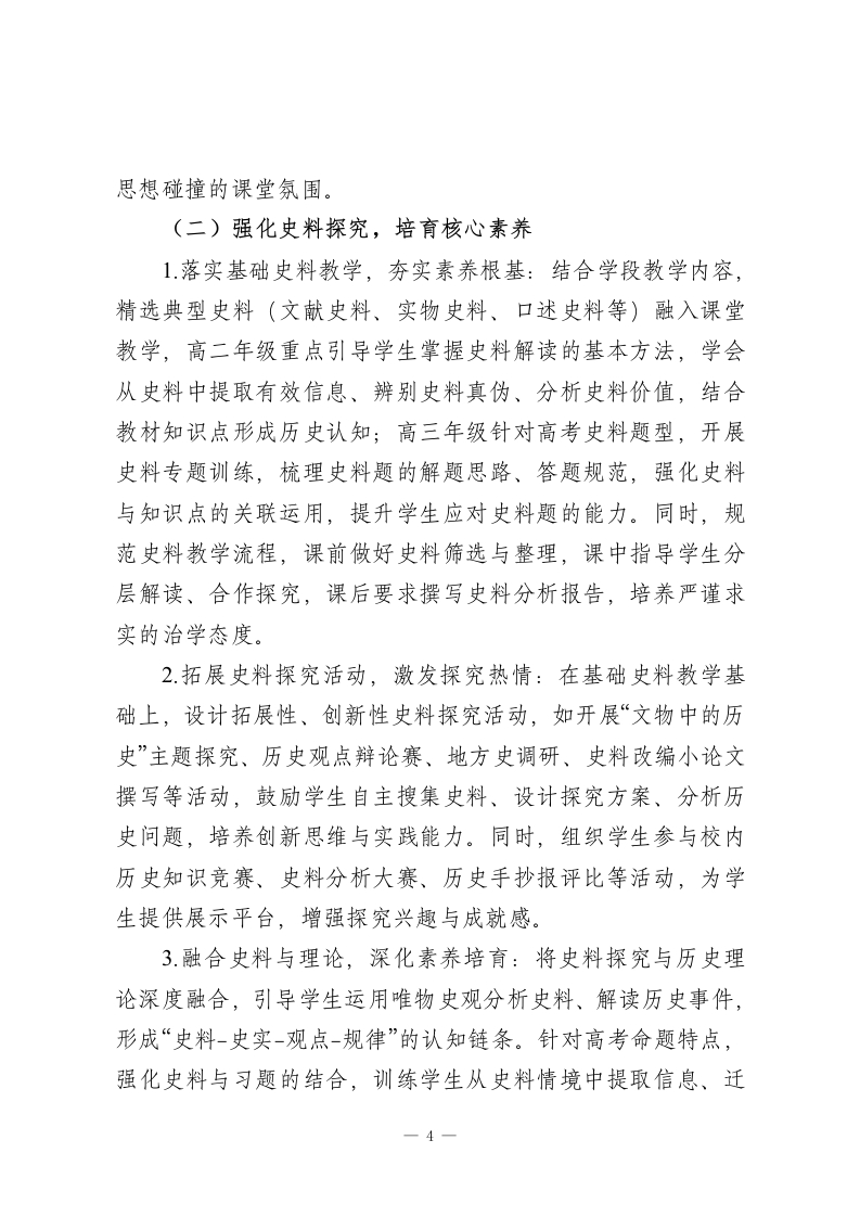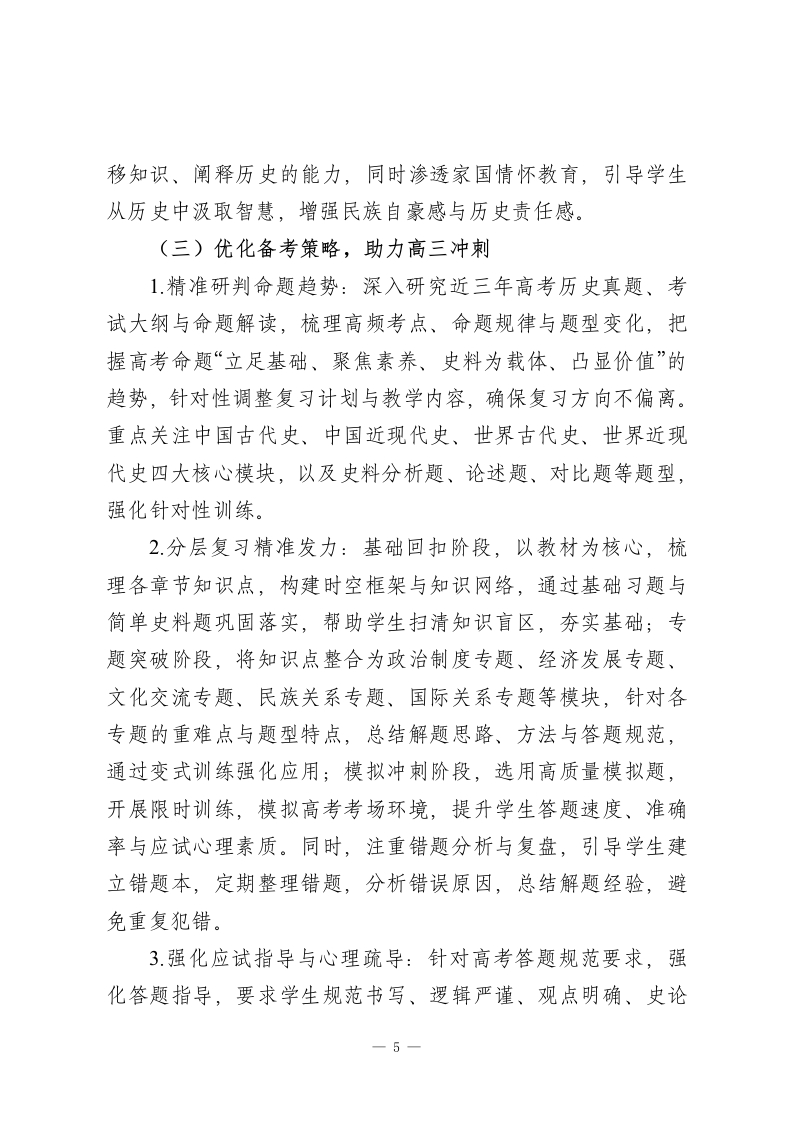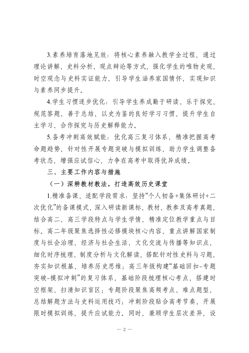 2025-2026学年春季第二学期高中历史教师工作计划:漫溯历史长河,涵养人文初心本学期,我将秉持“素养为核、史料为基、因材施教”的教学理念,统筹推进课堂教学、史料探究、备考冲刺、学情反馈等各项工作,不断精进专业能力,优化教学方法,助力学生在历史学习中明辨兴衰、汲取智慧、涵养情怀。一、指导思想理论教学与史料探究并重、基础巩固与能力提升融合、素养培育与应试备考兼顾,深化“教-学-评一致性”改革,引导学生主动研读史料、探究历史规律,学会运用历史思维分析解决实际问题,树立正确的历史观、民族观、国家观、文化观,培养兼具人文底蕴与责任担当的时代新人。二、工作目标1.教学质量精准进阶:针对高二、高三学段差异精准施教,确保高二学生夯实历史基础、深化核心素养,高三学生突破备考瓶颈、提升应试技巧,各学段学生历史成绩与综合素养均实现阶段性提升。2.专业能力持续精进:积极参与教研研修与教学实践,深耕教材教法、高考命题规律与史料解读技巧,提升课堂组织、重难点突破、学情研判与答疑解惑能力,形成兼具专业性与感染力的教学风格。1