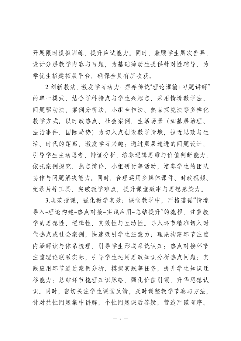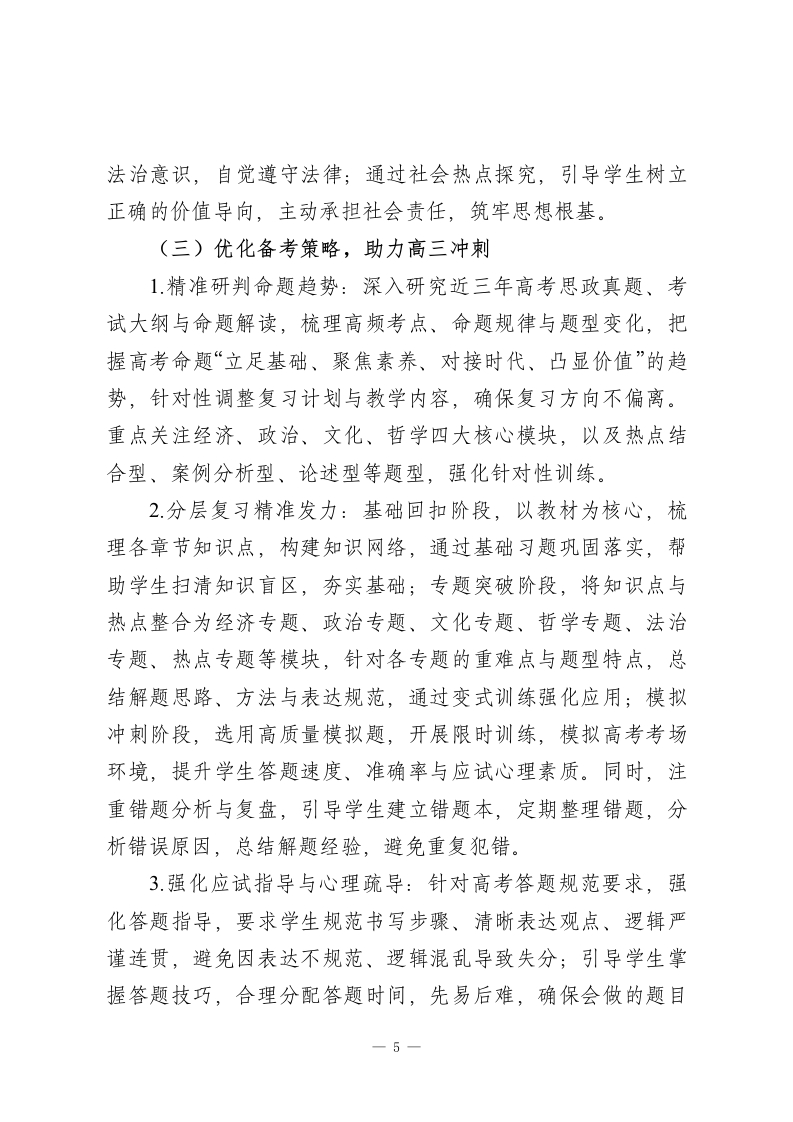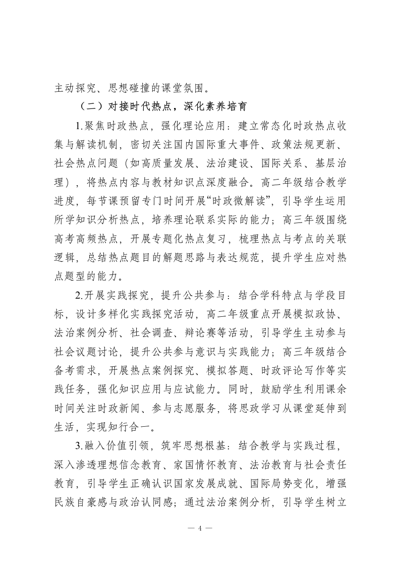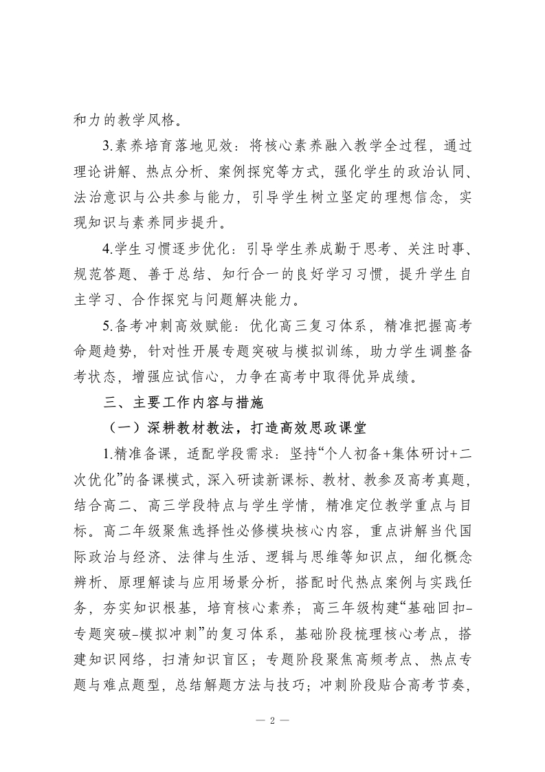 2025-2026学年春季第二学期高中思想政治教师工作计划:洞察时代脉搏,涵养家国情怀本学期,我将结合学校教学部署与学生实际情况,秉持“素养为核、时代为脉、因材施教”的教学理念,统筹推进课堂教学、热点探究、备考冲刺、学情反馈等各项工作,不断精进专业能力,优化教学方法,助力学生在思政学习中明辨是非、坚定信念、涵养情怀。一、指导思想理论教学与实践探究并重、基础巩固与能力提升融合、价值引领与应试备考兼顾,深化“教-学-评一致性”改革,引导学生主动关注时代热点,学会运用思政思维分析解决实际问题,树立正确的世界观、人生观、价值观,培养兼具家国情怀与责任担当的时代新人。二、工作目标1.教学质量精准提升:针对高二、高三学段差异精准施教,确保高二学生夯实思政基础、深化核心素养,高三学生突破备考瓶颈、提升应试技巧,各学段学生思政成绩与价值判断能力均实现阶段性进阶。2.专业能力持续精进:积极参与教研研修与教学实践,深耕教材教法、高考命题规律与热点解读技巧,提升课堂组织、重难点突破、学情研判与答疑解惑能力,形成兼具思想性与亲1