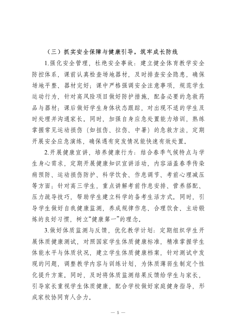 2025-2026学年春季第二学期高中体育教师工作计划:以运动赋能,赴成长之约本学期,我将秉持“健康第一、因材施教、知行合一”的教学理念,统筹推进课堂教学、专项训练、体质监测、安全保障等各项工作,不断精进教学能力,优化教学方法,助力学生在运动中强健体魄、磨砺意志、收获成长。一、指导思想技能教学与体能训练并重、健康引导与品格涵养融合、趣味体验与压力舒缓兼顾,深化“教-学-评一致性”改革,引导学生主动参与体育运动,学会科学健身方法,树立终身锻炼理念,培养兼具强健体魄、坚韧意志与良好品德的时代新人。二、工作目标1.教学质量精准落地:针对高二、高三学段差异精准施教,确保高二学生夯实体能基础、提升专项技能,高三学生缓解备考压力、保持身心状态,各学段学生体质健康水平与体育核心素养均实现稳步提升。2.专业能力持续精进:积极参与教研研修与教学实践,深耕专项教学方法、体能训练技巧与运动安全防护知识,提升课堂组织、技能指导、学情研判与应急处置能力,形成兼具专业性与亲和力的教学风格。3.素养培育贯穿全程:将核心素养融入教学全过程,通过专项训练、团队竞赛、健康宣讲等方式,强化学生的运动能力1