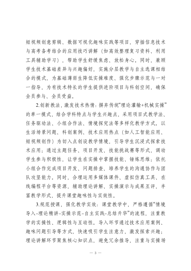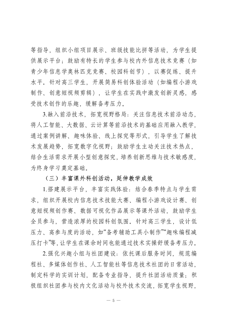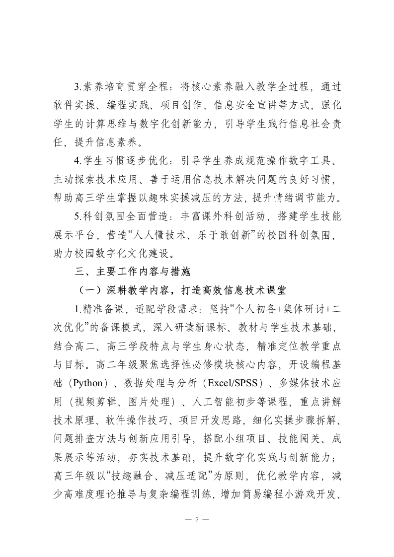2025-2026学年春季第二学期高中信息技术教师工作计划:以技为翼,点亮科创初心本学期,我将秉持“素养为核、实操为基、因材施教”的教学理念,统筹推进课堂教学、技能实训、科创实践、信息安全教育等各项工作,不断精进教学能力,优化教学方法,助力学生在数字世界中锤炼技能、开拓思维、收获成长。一、指导思想理论教学与实操训练并重、技能提升与思维培养融合、趣味实践与压力舒缓兼顾,深化“教-学-评一致性”改革,引导学生主动探索信息技术应用,学会运用数字工具解决实际问题,树立正确的信息伦理与安全观念,培养兼具数字化素养、创新思维与责任担当的时代新人。二、工作目标1.教学质量精准落地:针对高二、高三学段差异精准施教,确保高二学生夯实理论基础、提升数字化实践能力,高三学生巩固核心技能、舒缓备考压力,各学段学生信息技术核心素养均实现稳步提升。2专业能力持续精进:积极参与教研研修与教学实践,深耕软件操作、编程开发、科创指导等教学方法,提升课堂组织、技能点拨、学情研判与问题处置能力,形成兼具专业性与亲和力的教学风格。一1