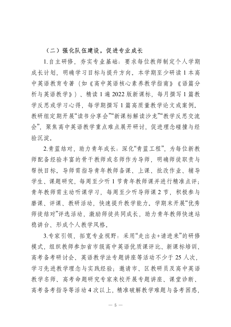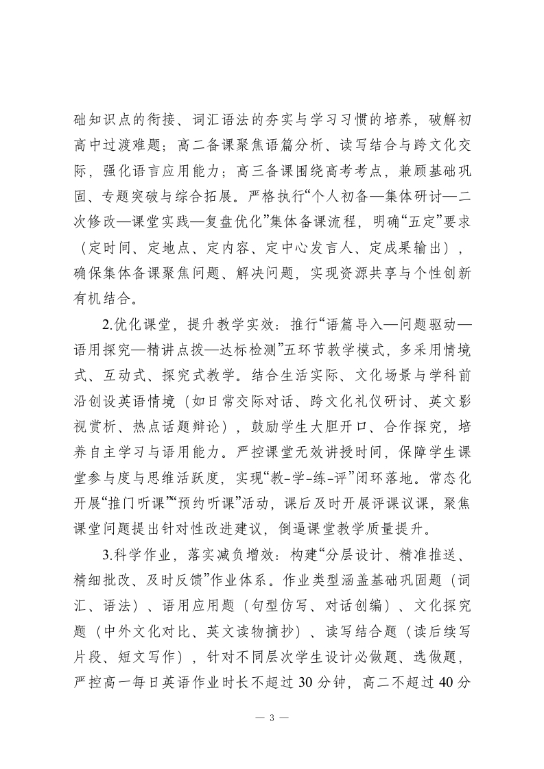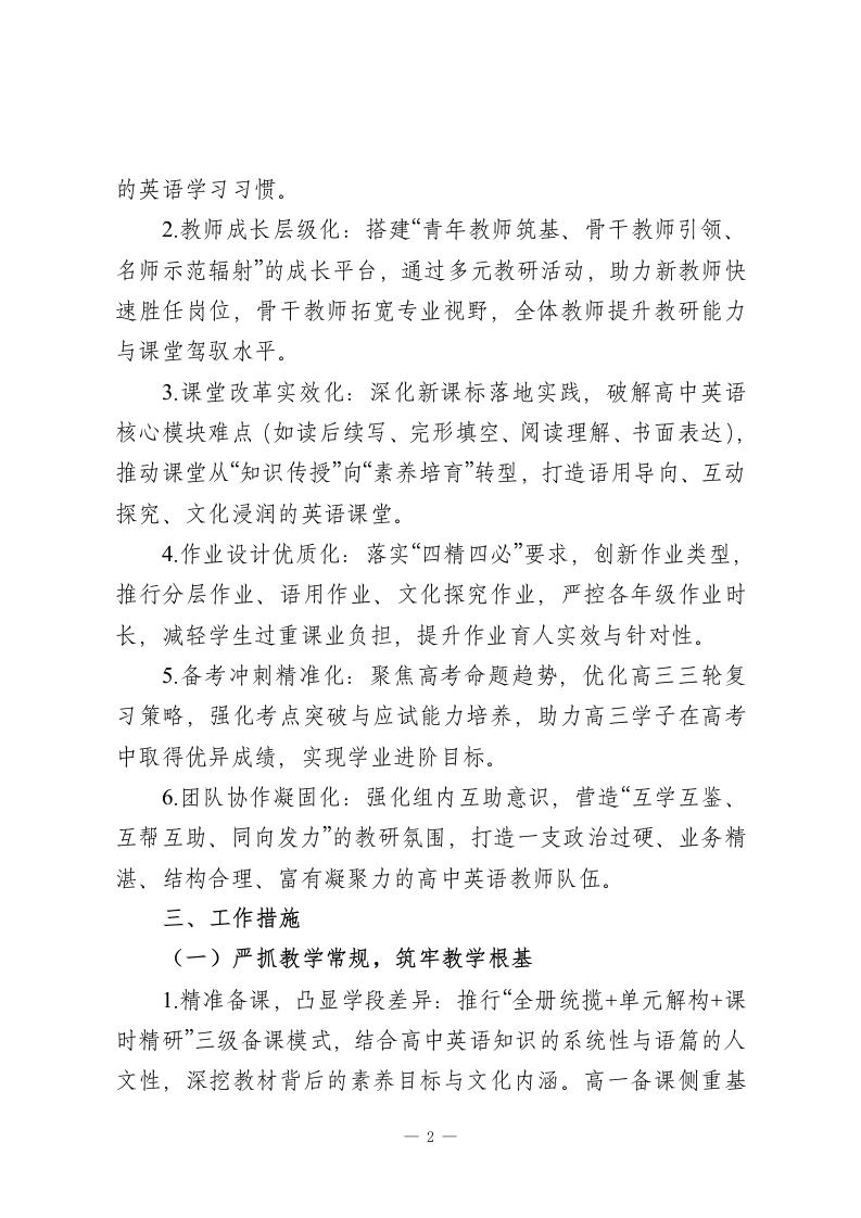 2025-2026学年春季第二学期高中英语教研组工作计划:以语育人铸素养,研教协同促提升本学期,本教研组将以课堂教学改革为核心,以作业优化设计为突破,以师资队伍建设为支撑,以高考备考为重点,统筹推进常规落实、教研创新、特色培育等工作,推动教师专业能力迭代与学生英语核心素养(语言能力、文化意识、思维品质、学习能力)双向提升,构建高效务实、富有活力的高中英语教学生态,为学生学业发展与学校教育质量提升筑牢学科根基。一、指导思想高中英语学科的工具性与人文性,以核心素养培育为核心目标,紧扣春季学期各年级教学重难点与高考备考节奏。坚持以课堂为第一阵地,以教研为重要抓手,摒弃形式主义、注重实效落地,深化“教-学-评一致性”改革,优化教学方法与备考策略,强化组内协作与资源共建,引导学生在语言学习中感悟文化魅力、提升思维能力、树立正确价值观,助力高三学子高效冲刺高考,推动教研组工作向更高质量、更具特色方向发展。二、工作目标1.常规管理精细化:细化备课、上课、作业、辅导、评价全流程要求,建立“督查-反馈-整改-复盘”闭环机制,确保教学常规落地见效,培养学生“善积累、敢表达、会应用、能思辨”1