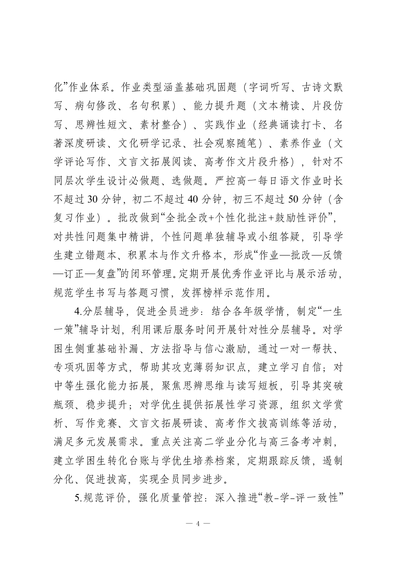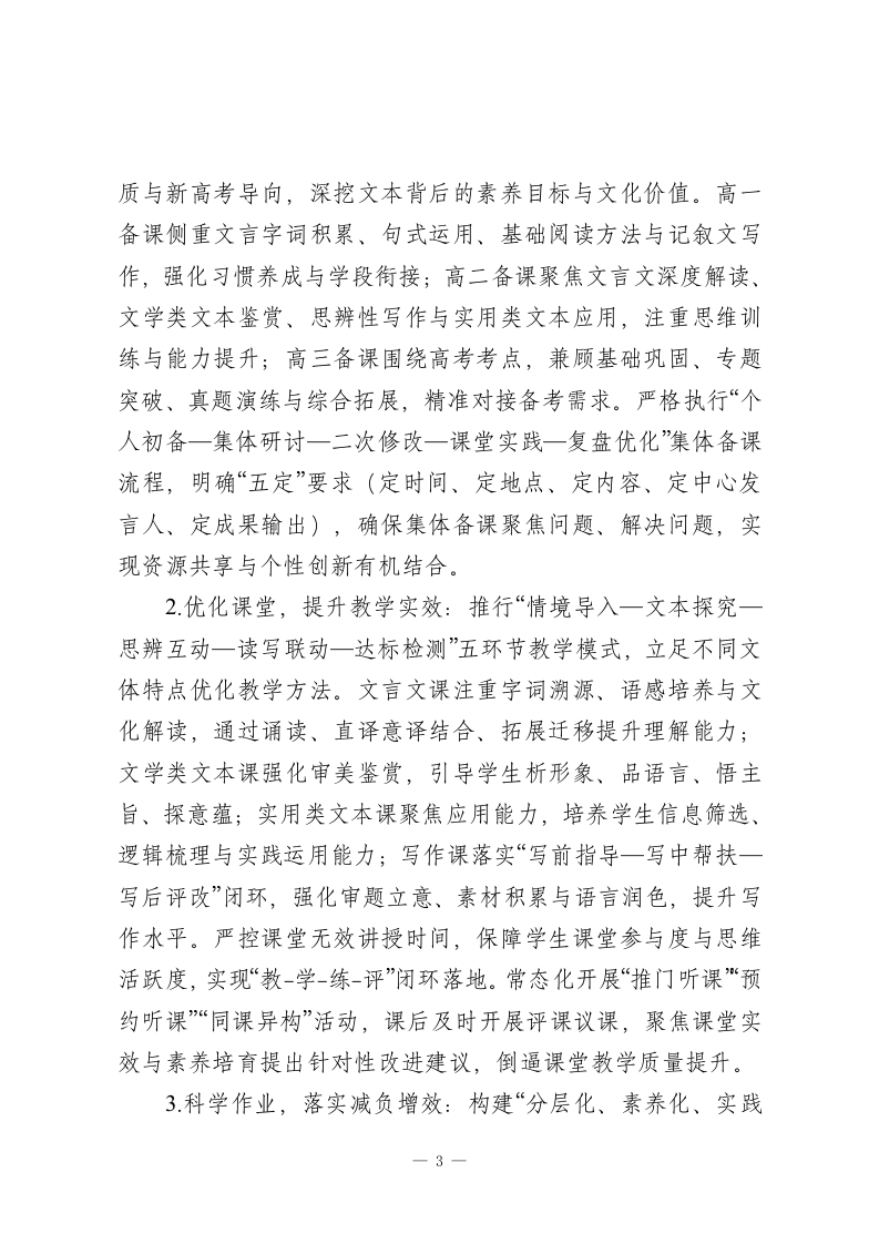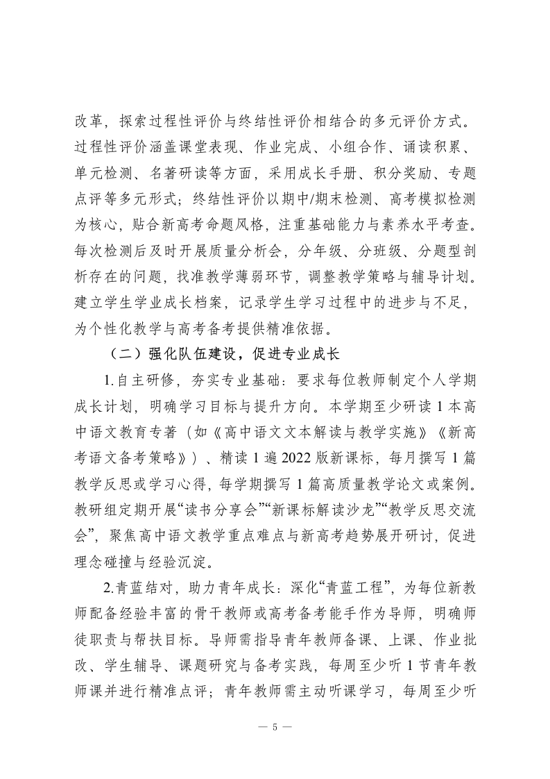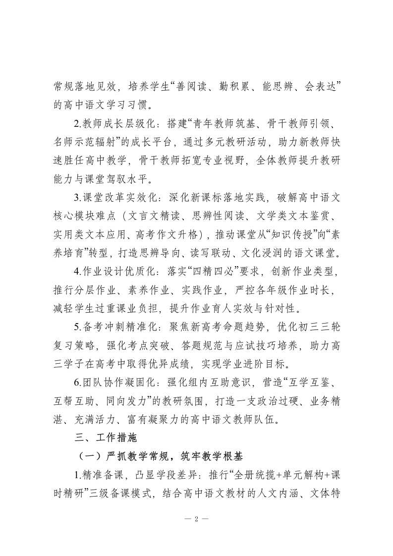 2025-2026学年春季第二学期高中语文教研组工作计划:深耕文本育素养,精研教学助攻坚本学期,本教研组以课堂教学改革为核心,以作业优化设计为突破,以师资队伍建设为支撑,以高考备考为重点,统筹推进常规落实、教研创新、特色培育等工作,推动教师专业能力迭代与学生语文核心素养(语言建构与运用、思维发展与提升、审美鉴赏与创造、文化传承与理解)双向提升,构建厚重务实、思辨高效的高中语文教学生态,为学生学业进阶与终身发展赋能。一、指导思想高中语文的学科属性与高中生认知发展规律,结合春季学期教学节奏与高考备考节点,以核心素养培育为核心目标,紧扣各年级教学重难点与新高考命题导向。坚持以课堂为第一阵地,以教研为重要抓手,摒弃形式主义、注重实效落地,深化“教-学-评一致性”改革,优化文本解读、读写融合、思辨探究的教学方法,强化组内协作与资源共建,引导学生在语言学习中感悟文化魅力、锤炼思辨能力、树立正确价值观,助力高三学子高效冲刺高考,推动教研组工作向高质量、特色化方向发展。二、工作目标1.常规管理精细化:细化备课、上课、作业、辅导、评价全流程要求,建立“督查-反馈-整改-复盘”闭环机制,确保教学1