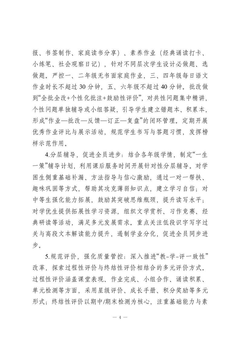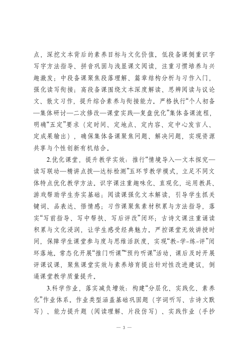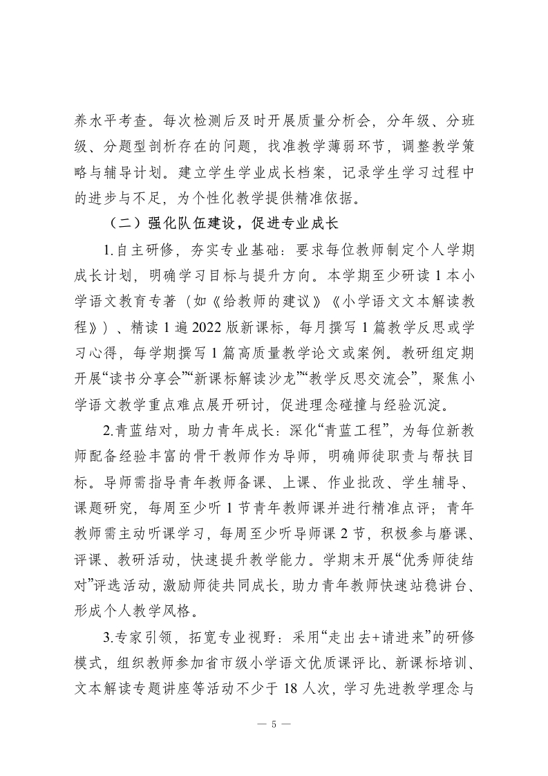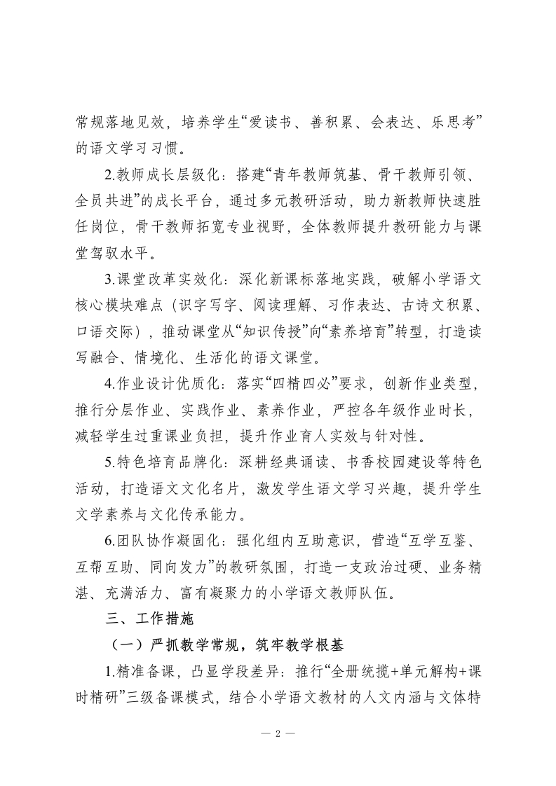 2025-2026学年春季第二学期小学语文教研组工作计划:文润童心传经典,研行致远育素养本教研组将紧扣“立德树人”根本任务,深度落实“双减”政策与学校整体教学部署,秉持“以文育人、素养为核、教研赋能、协同共进”的工作理念,以课堂教学改革为核心,以作业优化设计为突破,以师资队伍建设为支撑,统筹推进常规落实、教研创新、特色培育等工作,推动教师专业能力迭代与学生语文核心素养(语言建构与运用、思维发展与提升、审美鉴赏与创造、文化传承与理解)双向提升,构建厚重鲜活、务实高效的小学语文教学生态,为学生语文学习生涯筑牢根基。一、指导思想立足小学语文的学科属性与小学生身心发展规律,结合春季学期教学节奏,以核心素养培育为核心目标,紧扣各年级教学重难点。坚持以课堂为第一阵地,以教研为重要抓手,摒弃形式主义、注重实效落地,深化“教-学-评一致性”改革,优化读写融合、情境浸润的教学方法,强化组内协作与资源共建,引导学生在语言学习中感悟文化魅力、提升思维品质、树立正确价值观,推动教研组工作向更高质量、更具特色方向发展。二、工作目标1.常规管理精细化:细化备课、上课、作业、辅导、评价全流程要求,建立“督查-反馈-整改-复盘”闭环机制,确保教学1