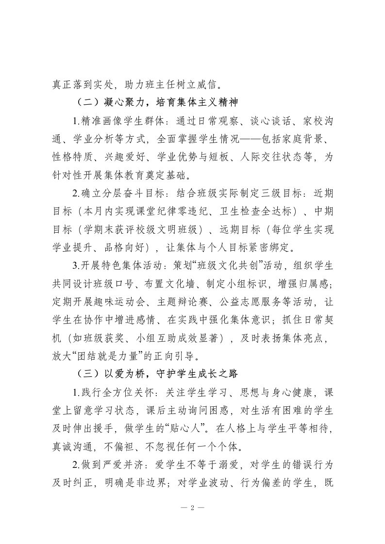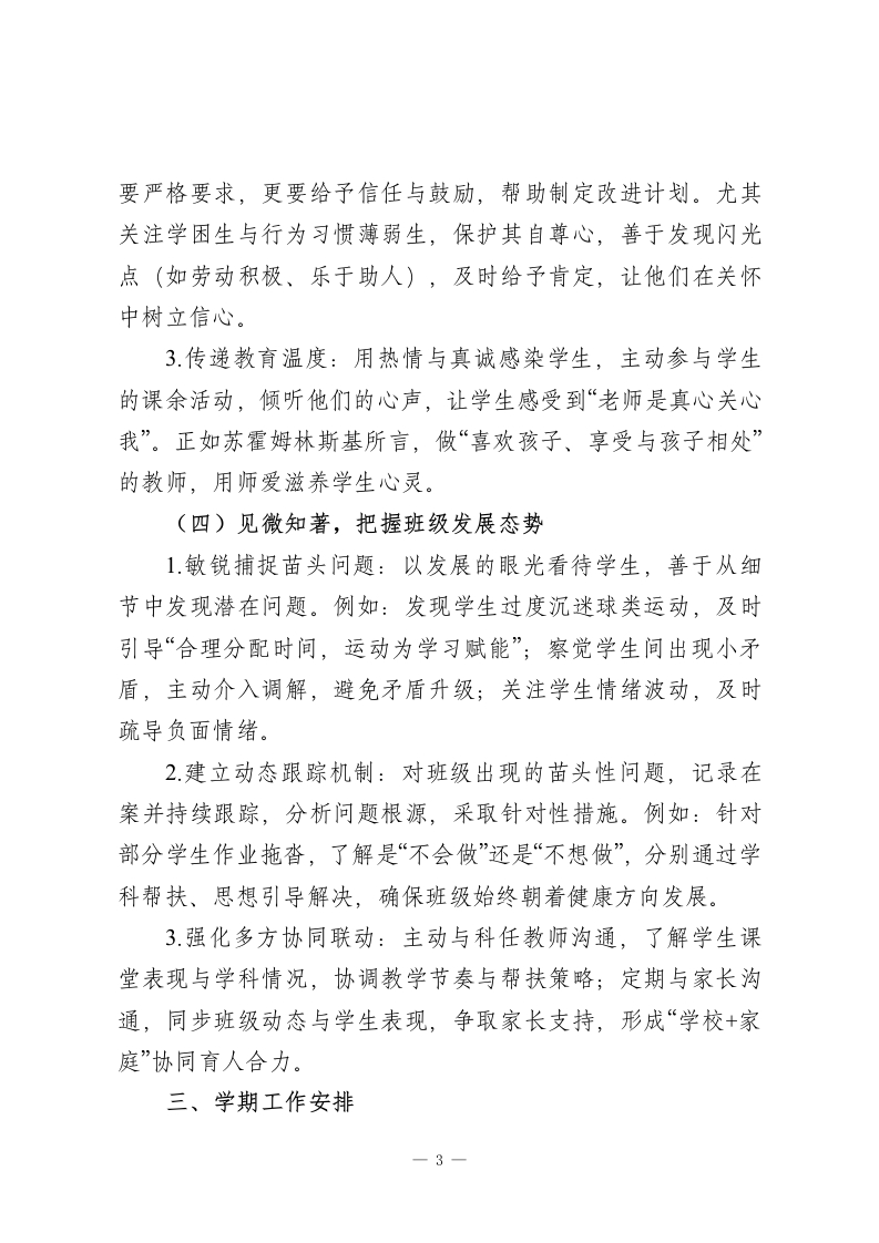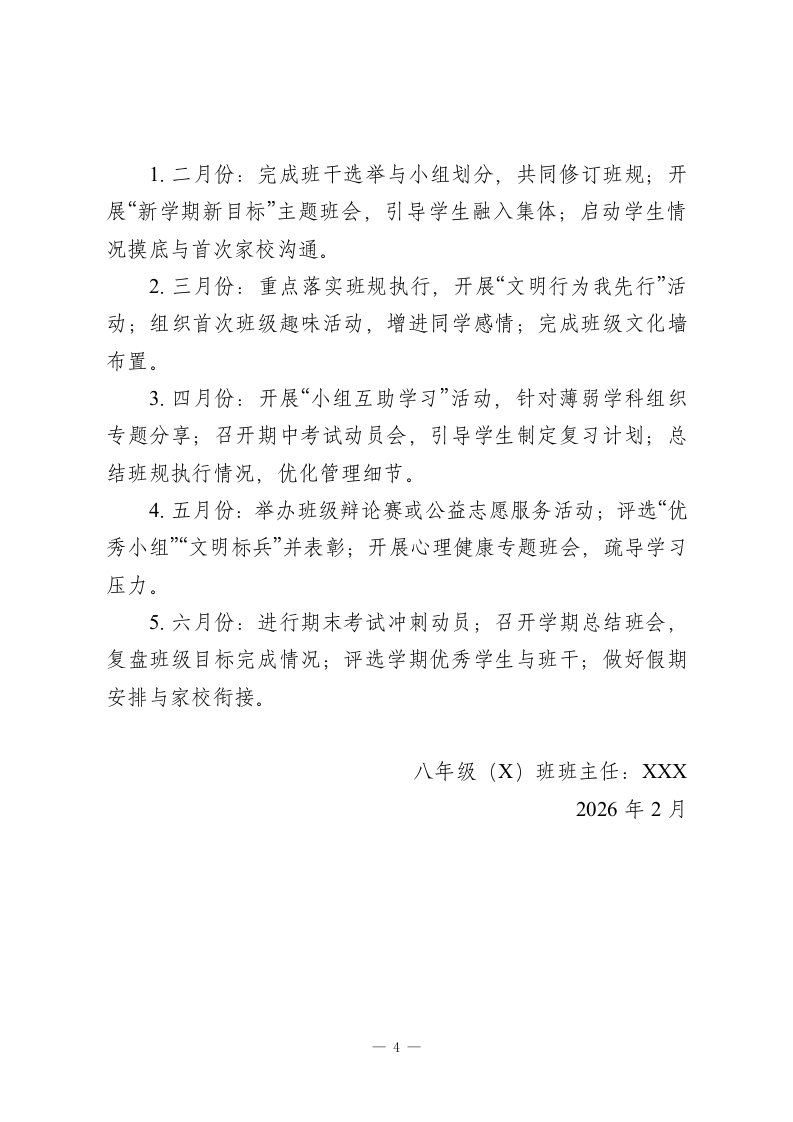 2025-2026学年第二学期八年级初二班主任工作计划:春启新程育新苗,心筑班风伴成长一、指导思想班主任工作以“爱为底色、规则为纲、成长为核”,立足八年级学生特点,通过精细化班级管理、沉浸式集体教育、个性化人文关怀,帮助学生夯实行为基础、凝聚集体力量、明晰成长方向,平稳度过转型期,在初中生涯中稳步前行。二、核心工作与实施措施(一)建章立制,筑牢班级管理根基1.优化班干与小组建设:通过民主选举与能力考察,选拔责任心强、有号召力的学生组建班委会,同步划分“互助学习小组”,明确班干与组长职责(如班长统筹协调、学习委员对接学科、组长负责小组纪律与学习帮扶)。2.定制班级专属公约:结合本班学情,组织全班同学共同修订班规,聚焦课堂纪律、卫生值日、作业提交、课间行为等核心场景,条款突出“具体可操作、奖惩分明”。例如:课堂发言先举手、卫生值日责任到岗、作业逾期需说明、课间不追逐打闹,让班规成为全班共同认可的行为准则。3强化规则落地执行:建立“每日督查+每周总结”机制,由班干记录班规执行情况,每周班会公示结果,对遵守规则的个人与小组予以表彰,对违规行为耐心引导、督促整改,让班规1