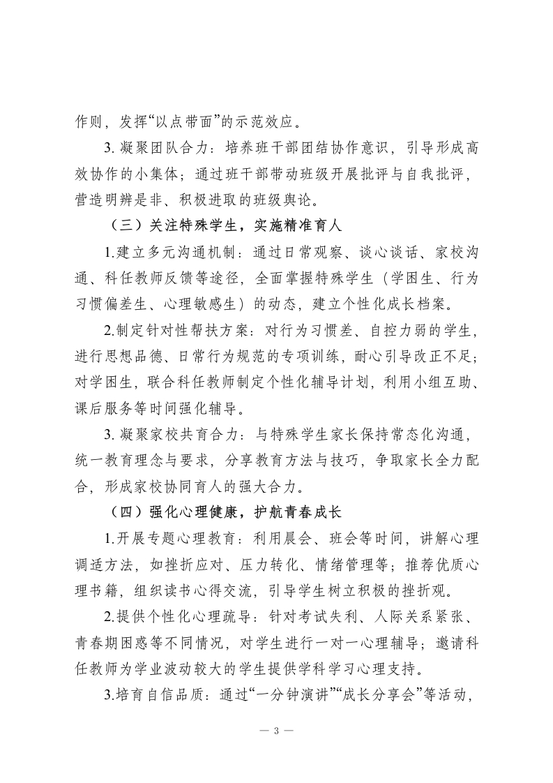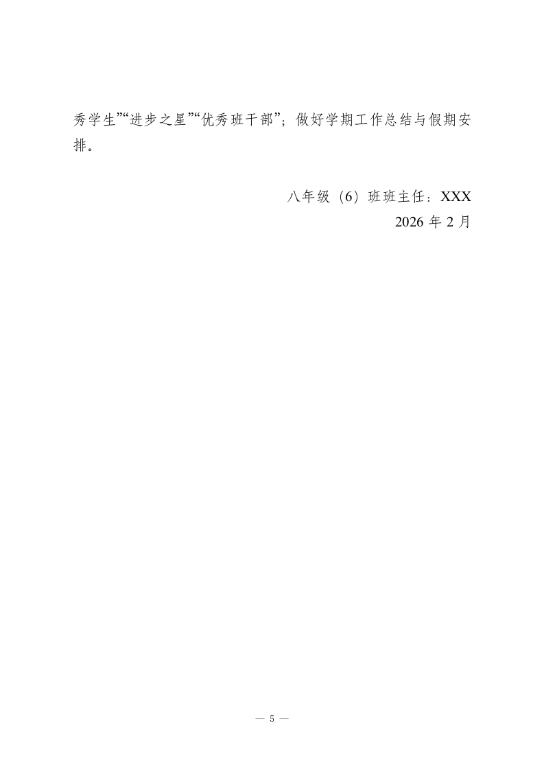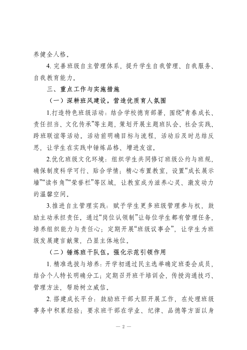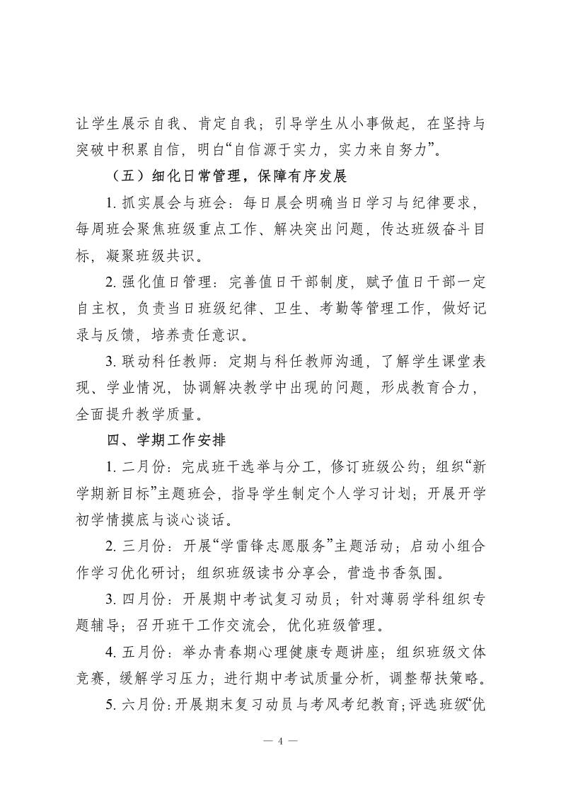 2025-2026学年第二学期八年级初二班主任工作计划:护航青春关键期,聚力成长新征程一、指导思想秉持“以人为本、和谐共生”的育人理念,以德育为核心,聚焦八年级学生身心发展关键期,强化班级团队建设与心理健康教育。在班级管理中倡导民主平等、协作进取的精神,深耕德育科研与典型案例研究,助力学生在学业提升、个性发展、素质培养中实现全面成长,打造有温度、有凝聚力、有战斗力的班集体。二、班级现状与工作目标(一)班级现状本班学生基础整体较好,学习热情尚可,但部分学生存在学业底子薄弱、适应能力不足等问题。本学期延续小组合作学习模式,需重点关注学生对该模式的深度适应,帮助学困生突破学习瓶颈,同时引导优等生拓展提升,避免两极分化。(二)工作目标1.筑牢班风根基,形成“团结互助、勤学善思、积极向上”的班级氛围,增强集体凝聚力与学生归属感。2.优化小组合作学习效能,帮助全体学生适应教学模式,实现学困生转化、中等生提升、优等生拔尖的分层目标。3.强化学生心理健康建设,提升情绪调控与抗压能力,培1