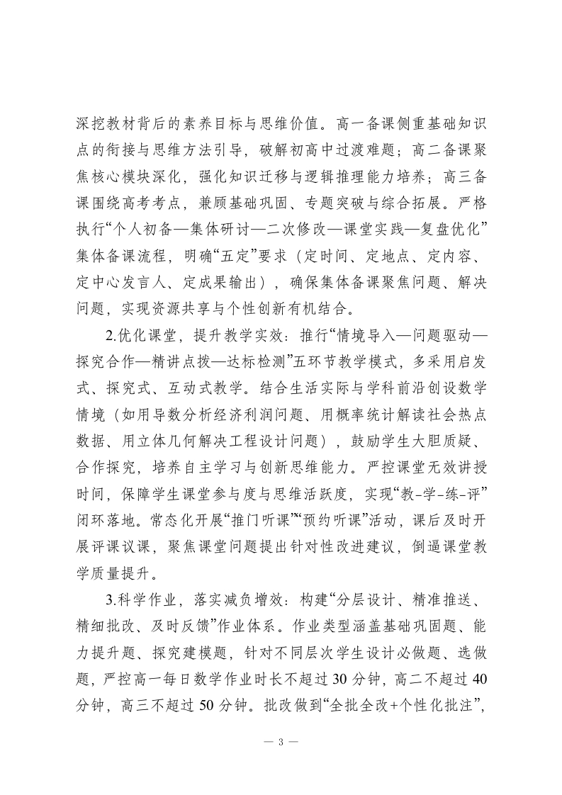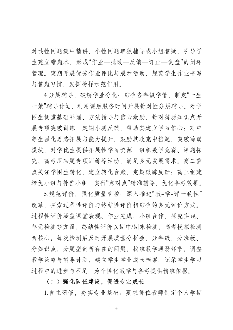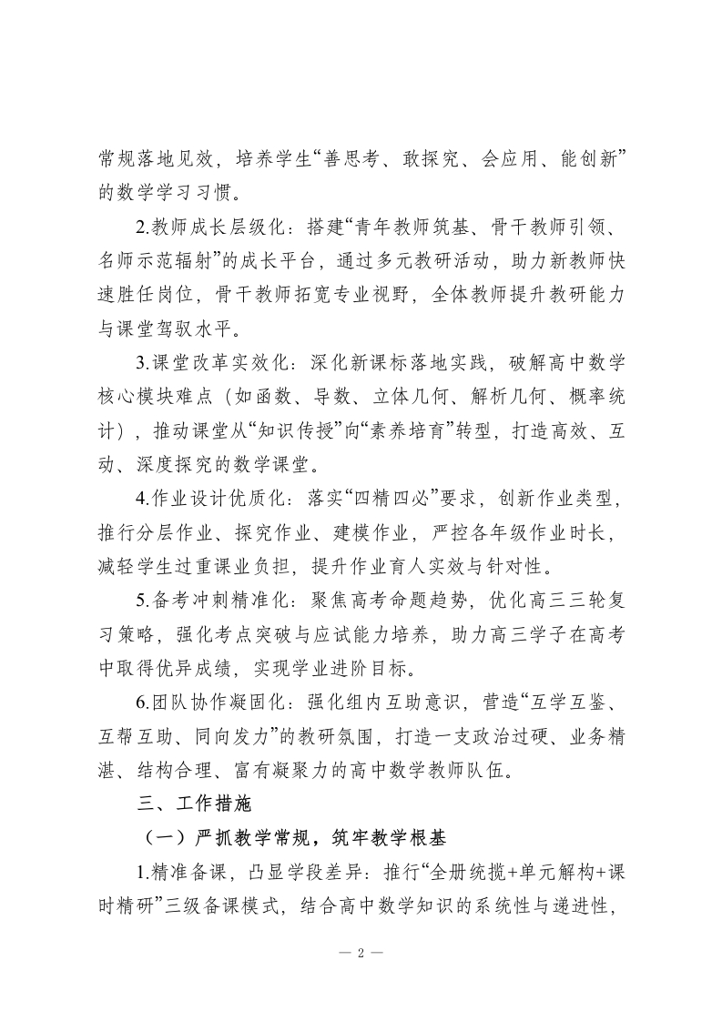 2025-2026学年第二学期高中数学教研组工作计划:深耕课堂提质效,聚焦素养育英才本学期,本教研组将秉持“素养导向、教研赋能、精准施策、协同共进”的工作理念,以课堂教学改革为核心,以作业优化设计为突破,以师资队伍建设为支撑,以高考备考为重点,统筹推进常规落实、教研创新、特色培育等工作,推动教师专业能力迭代与学生数学核心素养双向提升,构建高效务实、富有活力的高中数学教学生态,为学生学业发展与学校教育质量提升筑牢学科根基。一、指导思想高中数学学科的抽象性、逻辑性与应用性,以核心素养(数学抽象、逻辑推理、数学建模、直观想象、数学运算、数据分析)培育为核心目标,紧扣春季学期各年级教学重难点与高考备考节奏。坚持以课堂为第一阵地,以教研为重要抓手,摒弃形式主义、注重实效落地,深化“教-学-评一致性”改革,优化教学方法与备考策略,强化组内协作与资源共建,促进每位学生在数学学习中实现个性化成长,助力高三学子高效冲刺高考,推动教研组工作向更高质量、更具特色方向发展。二、工作目标1.常规管理精细化:细化备课、上课、作业、辅导、评价全流程要求,建立“督查-反馈-整改-复盘”闭环机制,确保教学1
