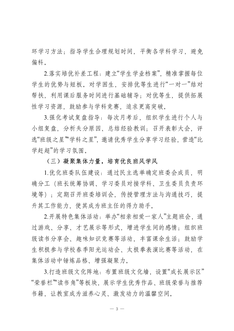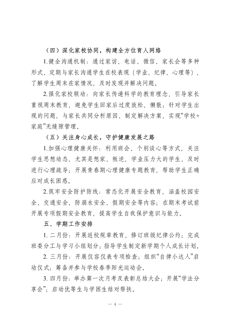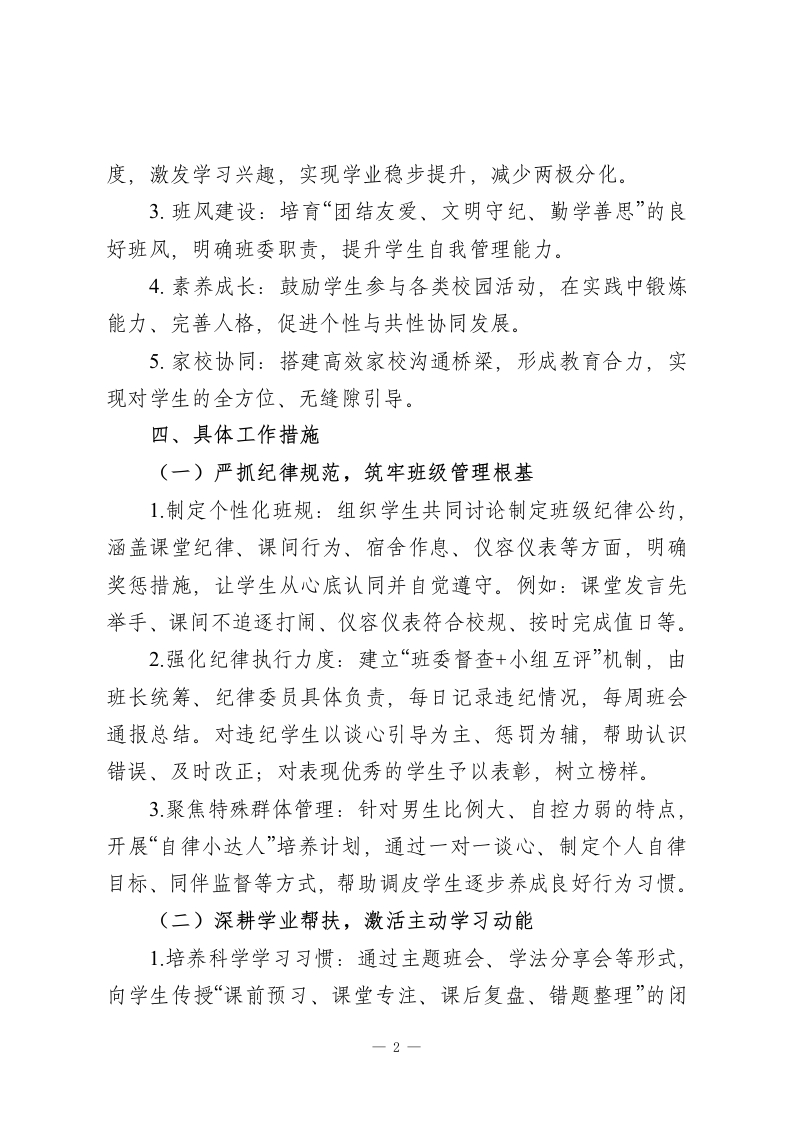 2025-2026学年第二学期七年级初一班主任工作计划一、指导思想本学期是七年级学生从小学适应期迈向初中稳定期的关键过渡阶段,学生身心发展、学业适应均处于重要拐点。班主任工作以“关爱为基、规范为纲、成长为核”,立足班级男女比例失衡、部分学生自控力弱等实际情况,通过精细化管理、个性化帮扶、多元化活动,帮助学生夯实行为基础、找准学习方法、凝聚集体力量,平稳度过过渡阶段,在初中生涯中筑牢成长根基。二、班级现状与核心问题本班现有学生51人,其中男生22人、女生29人,男女比例差距较大。学生正处于“服从与叛逆并存”的特殊阶段,价值观与世界观尚未完全成型,对家长依赖度较高,部分学生仍有想家情绪;学业上,科目增多导致部分学生学习方法混乱、压力较大,缺乏主动学习意识;行为上,男生大多贪玩调皮,自控能力较弱,学习积极性不足,给班级纪律管理带来一定挑战;班级整体凝聚力有待提升,学生间互助合作氛围需进一步培育。三、核心工作目标1.适应提升:帮助学生全面适应初中学习生活节奏,养成良好行为习惯与自理能力,提升综合素质。2.学业赋能:引导学生找到适配的学习方法,端正学习态一1