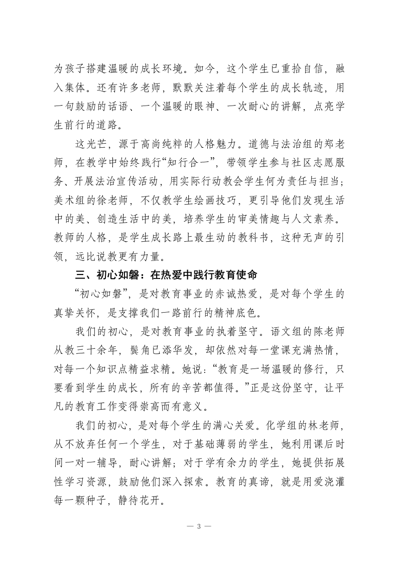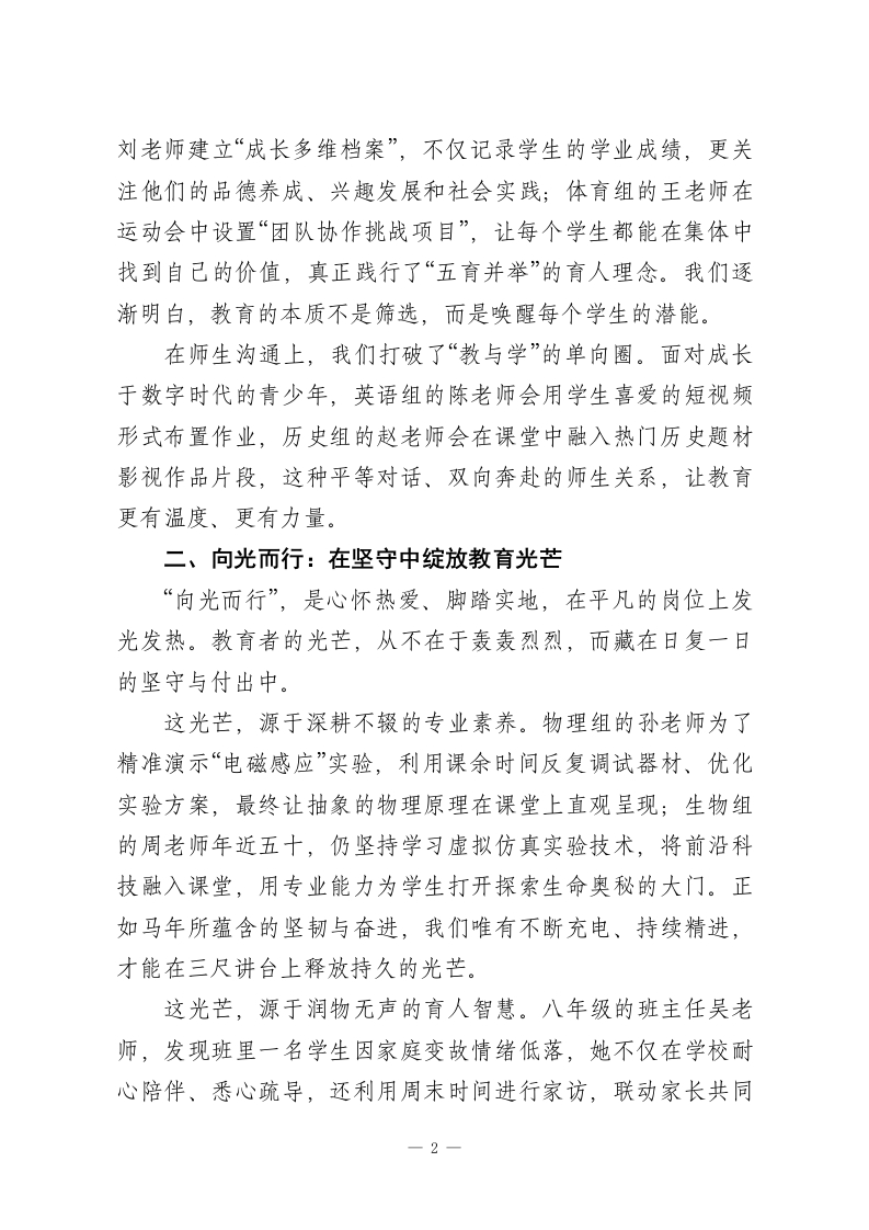 2025-2026学年秋季学期期末教师大会讲话稿:乘势破圈启新程,逐光而行育桃李亲爱的老师们:下午好!岁聿其莫,冬意渐浓,我们又一次站在了学期的终点。回望2025年秋季这一学期,课堂上的思维碰撞、校园里的温情陪伴、成长中的并肩前行,都已沉淀为彼此心中最珍贵的记忆。2025年,诸多热词勾勒着时代轮廓,我从中选取了三个与教育事业尤为契合的词一一破界、向光而行、初心如磐,与大家共勉。这三个词,既是对我们过往工作的生动写照,更是对未来教育之路的深情期许。一、破界:在突破中拓宽教育视野“破界”,是打破思维的桎梏、模式的局限、认知的边界,在教育的天地里探索更多可能。这一学期,我们欣喜地看到许多老师用行动诠释着“破界”的深意。在教学创新上,我们打破了“教材为纲”的单一圈。语文组的李老师讲授《红楼梦》选篇时,没有局限于文本分析,而是联动美术组开展“红楼服饰创意设计”,联合戏剧社编排微型课本剧,让经典文学以多元形式走进学生心灵;数学组的张老师则将编程思维融入函数教学,引导学生用代码绘制函数图像、解决实际应用问题,让抽象的数学知识变得可感可触。这种跨学科、多维度的教学尝试,让课堂焕发了新的生机。在育人维度上,我们打破了“分数至上”的评价圈。班主任1