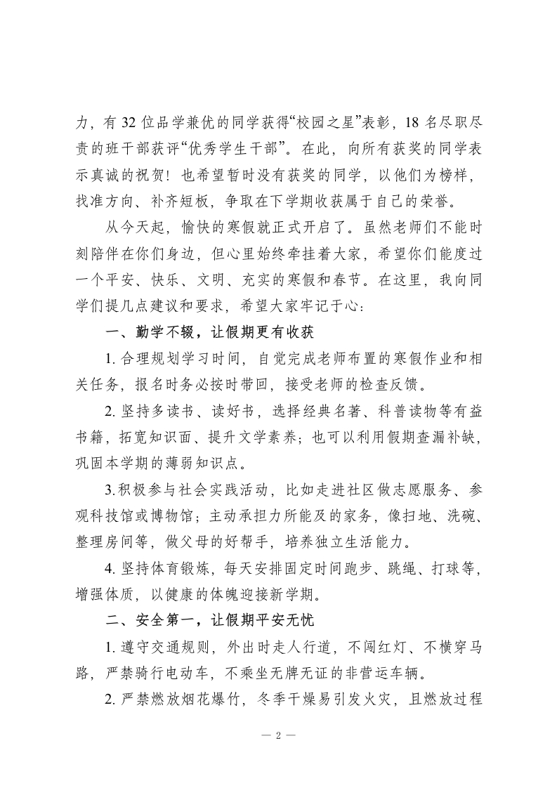 2025-2026学年秋季学期散学典礼校长讲话:寒假过得有意义,平平安安返校来各位亲爱的同学们:大家好!今天,我们迎来了2025-2026学年度第一学期的最后一天。回望这一学期,每一位同学都在成长路上稳步前行:有的在课本里收获了扎实的文化知识,有的在相处中学会了感恩与包容,有的在运动场上锤炼了强健的体魄,有的在集体活动中收获了真挚的友谊,还有的在挑战中变得更加勇敢自信。而这一切成长的背后,离不开老师们的默默付出一一他们爱生如子、尽心尽责,把满腔的爱倾注在教学中,照亮你们的前行之路,分享你们的喜怒哀乐,用专业与坚守陪伴大家一路成长。在此,我代表全体同学,向辛勤耕耘、无私奉献的全体老师致以最衷心的感谢!同时,也代表全体老师,向勤奋努力、天天向上的每一位同学,送上最热烈的祝贺!这一学期,校园里处处充满生机与活力:课堂上的读书声、活动中的欢笑声、运动场上的呐喊声,交织成最美的校园乐章。感谢每一位师生,是你们的共同努力让学校得到了社会和家长的认可;感谢同学们用文明的言行、良好的习惯,为校园增添了光彩。我们一起参与了丰富的教学活动,在知识的海洋里遨游;一起开展了各类主题班队会,在交流中养成良好行为;一起角逐各项竞赛,在拼搏中收获自信与喜悦。经过一学期的努