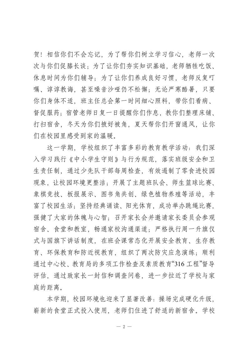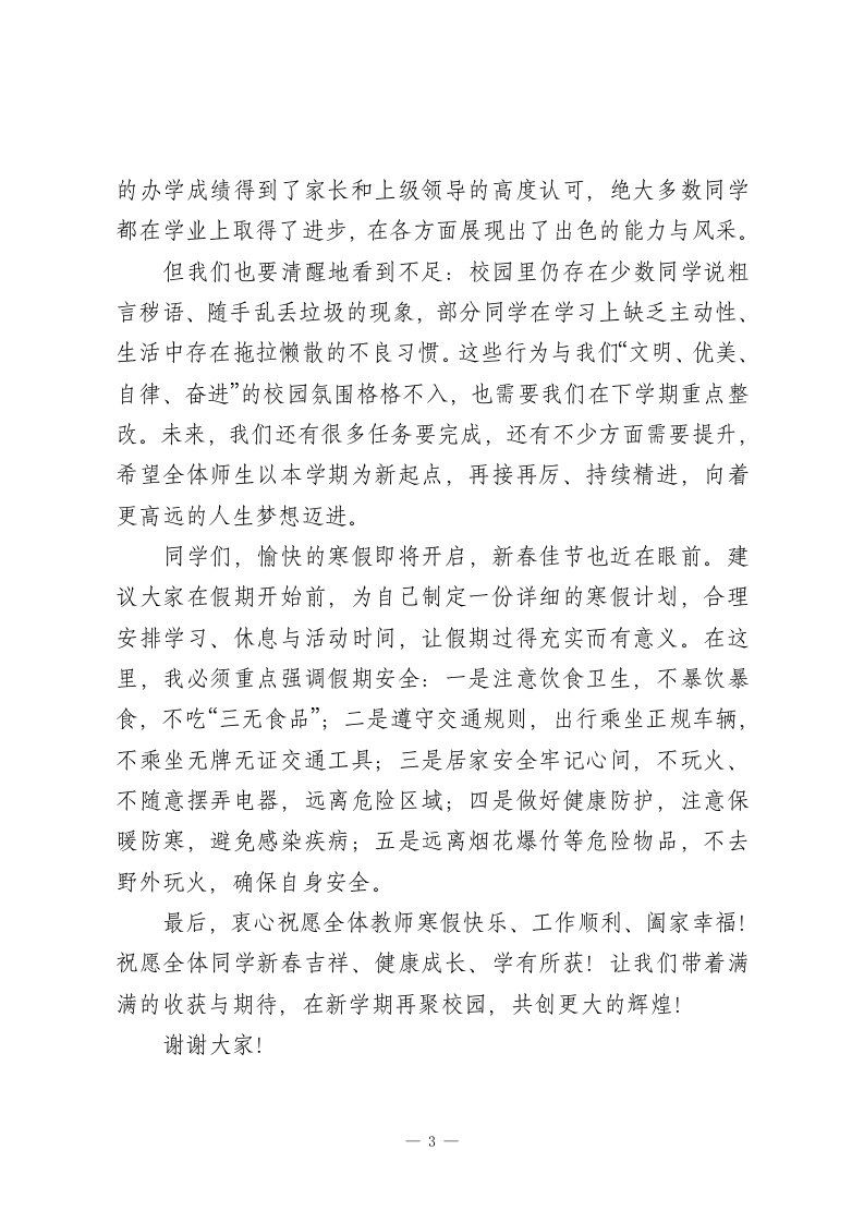 2025-2026学年秋季学期散学典礼校长讲话:盘点收获再出发同事们、同学们:大家上午好!时光飞逝,转眼间一学期的忙碌与成长已近尾声。沐浴着冬日的暖阳,我们带着一学期的耕耘硕果,即将迎来2026年的新春佳节。2025-2026学年度第一学期的教育教学工作,在全体师生的共同努力下,今天圆满画上句号。回顾这一学期,每一天都充满着奋斗的身影、思索的痕迹、收获的喜悦与成长的蜕变。清晨的教室里,书声琅琅唤醒校园;课间的走廊上,同学们文明游戏、安全互动;课堂上,大家专注倾听、积极思考、踊跃发言;课后,认真完成作业、书写工整规范;走出校园,同学们诚实守信、文明有礼、爱护公物,用实际行动展现着我校学子的良好风貌。在此,我要代表学校,向辛勤付出的全体老师们致以最诚挚的感谢!你们在安全管理上事无巨细,从日常巡查到防灾演练,全方位守护学生平安;在生活中无微不至,关心学生的饮食起居、身心健康,像家人一样温暖陪伴;在教学上兢兢业业,精心备课、耐心授课,为学生答疑解惑;在思想教育上苦口婆心,引导学生树立正确的价值观。你们不计个人得失,牺牲休息时间为学生补习、谈心,用奉献换来了学校的欣欣向荣。我也要代表全体老师,向奋发进取的同学们表示热烈的祝1