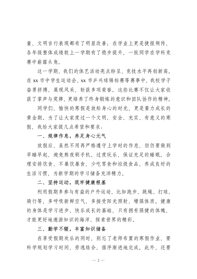 2025-2026学年秋季学期散学典礼校长讲话:让我们在充实的寒假中放松身心,精进技能,坚定信念,增强本领,丰富见闻尊敬的老师们、亲爱的同学们:大家上午好!四季轮回,时光流转。从今天下午起,大家期盼已久的寒假生活就要正式开启了,此刻我和大家一样,心中满是喜悦与期待。回望这一学期,学校始终以“立德树人”为根本,以提升教学质量为核心,朝着特色化、品牌化办学方向稳步迈进,在提升办学品位的道路上又留下了坚实的足迹。在此,我谨代表学校党支部、校委会,向辛勤耕耘、无私奉献的全体老师们致以最衷心的感谢!向奋发向上、砺志成才,取得优异成绩的同学们表示最热烈的祝贺!这一学期,我们持续改善办学条件,让校园更具温度与质感。8月,学校对知理楼进行了全面翻新装修,优化了教学环境;9月,完成了校园主干道刷黑工程,对主席台、教学楼通道口等区域进行了维修改造,并加装了高清电子显示屏,让校园信息传递更便捷。在优美环境的浸润下,同学们讲文明、懂礼仪的意识明显增强,环境育人的成效日益凸显。这一学期,我们大兴勤学之风,教育教学质量稳步提升。同学们在行为习惯养成上进步显著,课堂专注度、作业完成质1