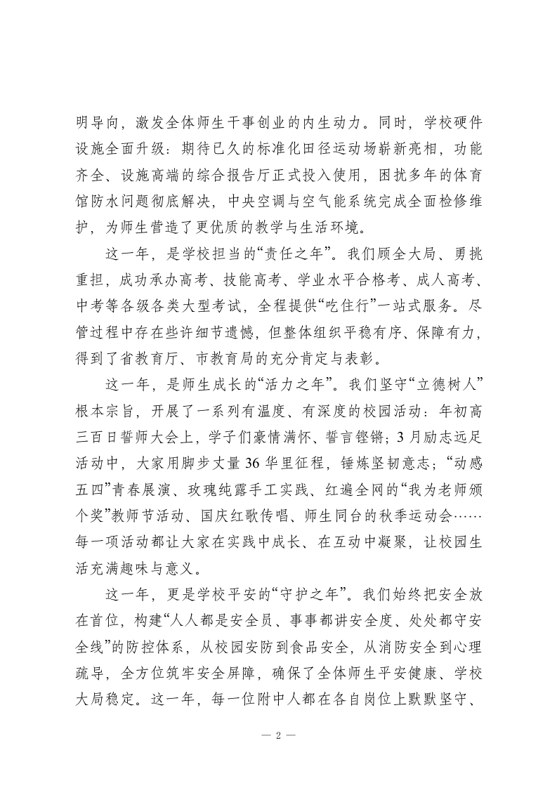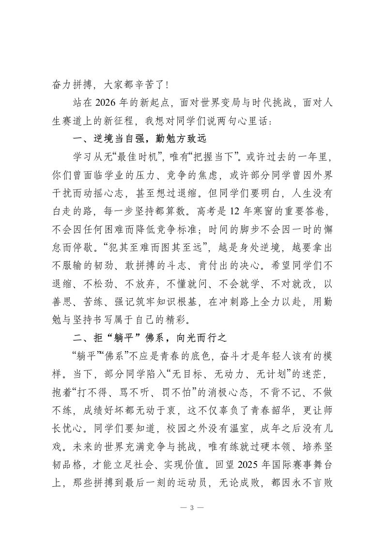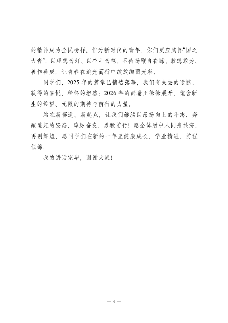 2025-2026学年秋季学期散学典礼校长讲话:逐梦新程承壮志,奋楫扬帆启华章亲爱的老师们、同学们:大家好!金蛇辞旧岁,瑞雪迎新春。值此辞旧迎新、岁律更新之际,我谨代表学校,向辛勤耕耘、默默奉献的全体教职员工,向勤学善思、奋勇争先的全体同学,致以最诚挚的新年问候和最美好的节日祝福!回望2025年,这是一段镌刻奋斗、满载收获的征程。我们全体附中人同心同德、勇毅前行,既经历了挑战的考验,更收获了成长的硕果,没有旁观者,皆是实干家。这一年,是学校发展的“提质之年”。我们始终坚守“质量立校”核心,全员聚焦课堂、深耕教学,在备课、授课、辅导、考试、批改、评价等各个环节精耕细作。2025届高考再传捷报,纯文化课一本上线率较上一年增长82%,本科上线人数增长率达45.6%,实现历史性突破;奥赛赛场捷报频传,物理学科302班李泽宇、化学学科401班张思涵斩获全国二等奖,生物学科503班刘一诺获全国三等奖,成为市直高中除重点名校外唯一有学生获国家级奥赛奖项的学校,这份荣誉实属不易、弥足珍贵。这一年,是学校改革的“创新之年”。我们打破传统管理模式,建立扁平化组织体系,让决策更高效、执行更有力;完成评价体系重大转型,树立“以实绩论英雄、以贡献论价值”的鲜1