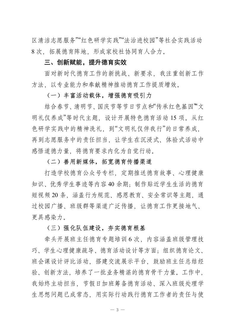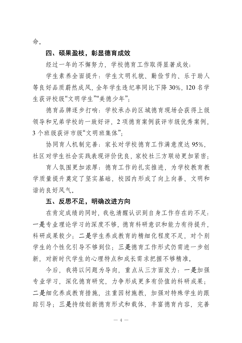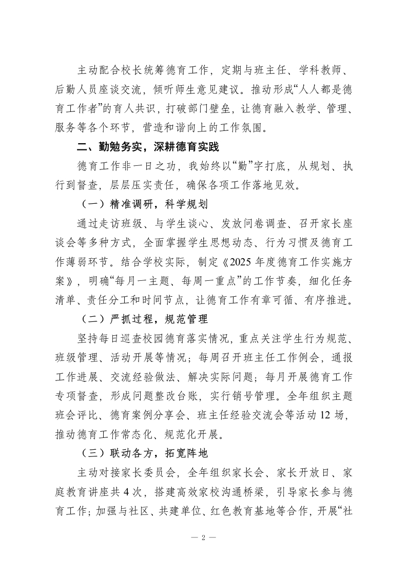 2025年度德育副校长个人工作总结:守德育初心,育时代新人2025年,我始终坚守“立德树人”根本任务,在校长的正确领导与全体同事的关心支持下,严格落实国家德育工作相关要求,以“创新模式、强化管理、压实责任”为核心思路,统筹推进学校德育各项工作。经过一年的深耕细作,学生思想道德素养稳步提升,德育工作取得阶段性成效。现将本年度履职情况总结如下:一、正己修身,筑牢德育根基作为德育副校长,我深知“学高为师,身正为范”的深刻内涵,始终将自身建设作为德育工作的前提。(一)强化理论武装,提升专业素养系统学习《中小学德育工作指南》《新时代中小学教师职业行为十项准则》等政策文件,主动参与省市各级德育工作研讨会、专题培训,及时跟进德育领域前沿理念与实践方法,不断提升政治站位和专业能力,确保德育工作方向不偏、标准不降。(二)坚持以身作则,树立良好榜样严格遵守学校各项规章制度,在廉洁自律、工作作风、言行举止上为师生做好表率。主动走进课堂听课评课,参与校园志愿服务、主题班会等活动,用实际行动传递正能量,以自身言行影响和带动师生。(三)注重团结协作,凝聚育人合力-1