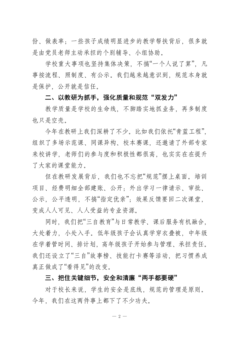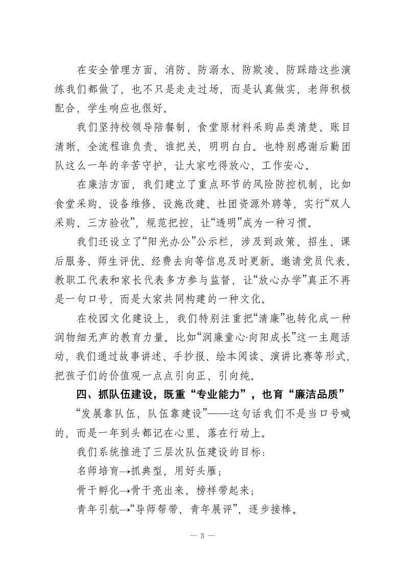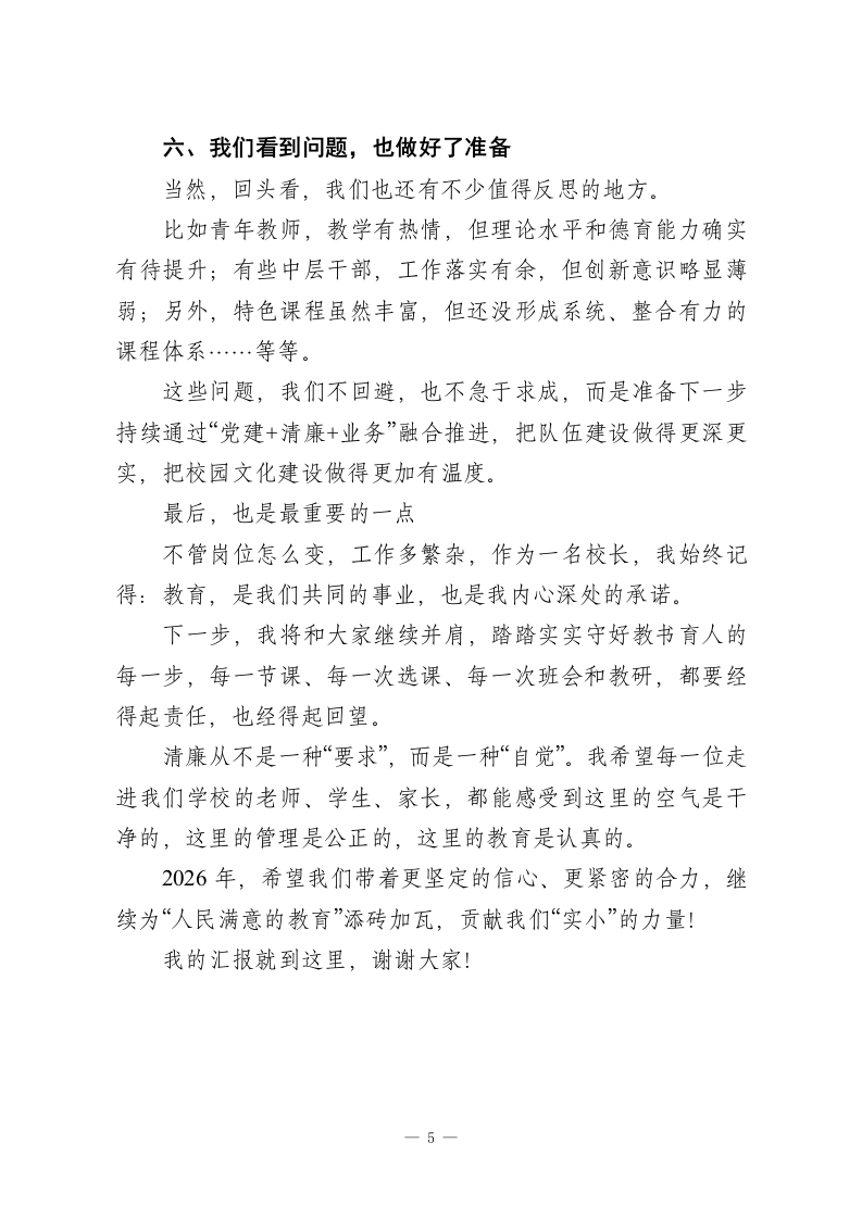 2025年度校长述职报告尊敬的各位领导、亲爱的各位老师:大家好!我是示范区XX镇第一小学党支部书记、校长XXX。今天,我怀着一份责任,也带着一份敬意,向大家汇报2025年度我在学校履职与廉洁工作的情况。这一年,我们全体教职工一起努力,始终围绕“为党育人、为国育才”的初心使命,把立德树人作为一切工作的起点和方向。我们坚持把“人”放在教育的中心,追求高质量发展,也坚持把“清廉”放在管理的底线,守住教育本该有的干净与纯粹。这一年的点滴努力与转变,都源于上级部门的悉心指导,也离不开集团总校的有力带动。现在,我从六个方面,把这一年来的一些工作做一个总结汇报。一、坚持党建引领,走好履职与清廉“两条主线”在工作中,我们始终把党建工作摆在学校发展的“总开关”位置一一育人方向在哪里、工作重心抓什么,党员走在前,支部走在前。我们带头抓好理论学习,年初认真组织学习了党的二十大精神,也定期开展警示教育、党纪党规学习,累计覆盖教职工120余人次。班子成员更是坚持“先学一步、多学一点”,用实际行动影响和带动大家。同时,我们把党建工作真正“落到教学一线”。比如组建“红色教学攻坚团队”,让党员教师在课改、教研、志愿服务中亮身1