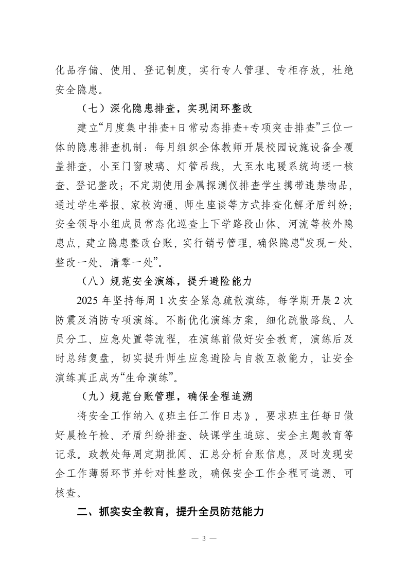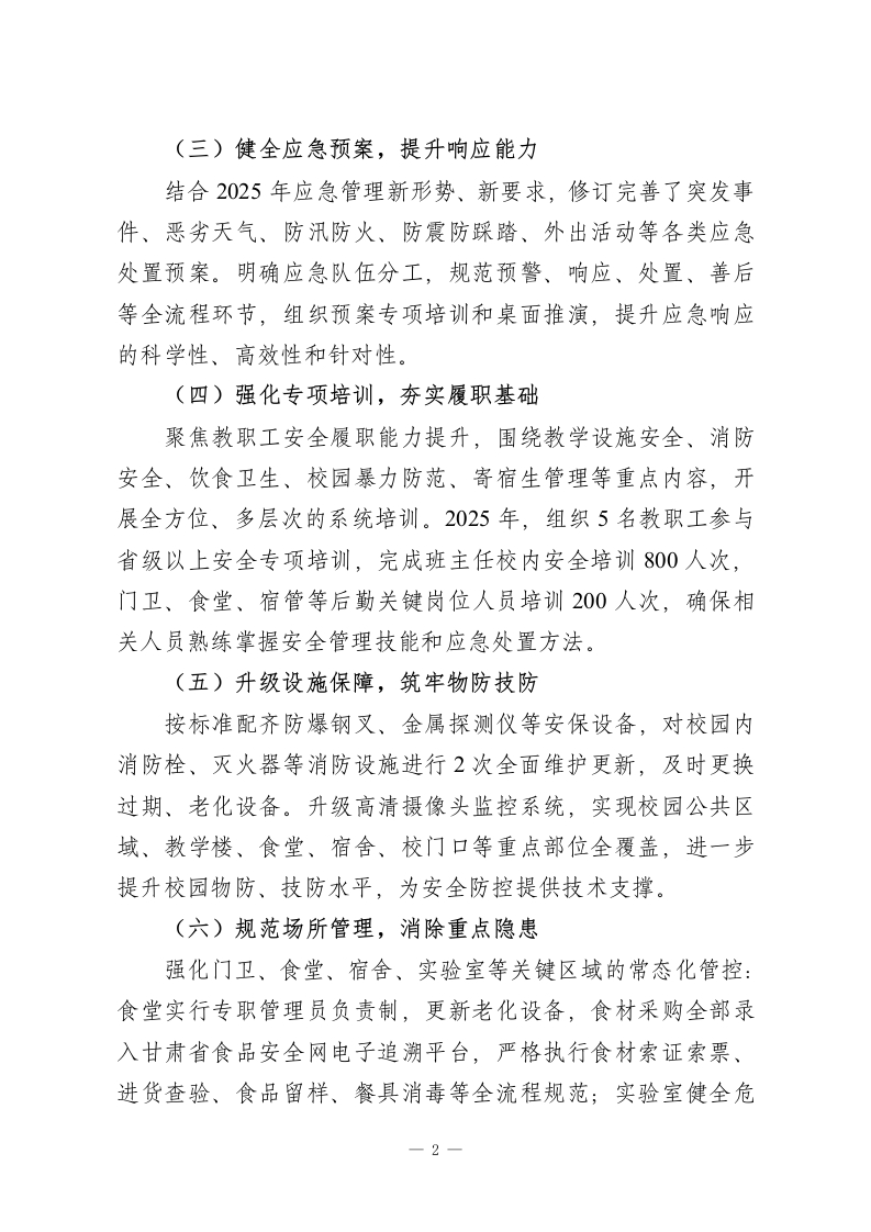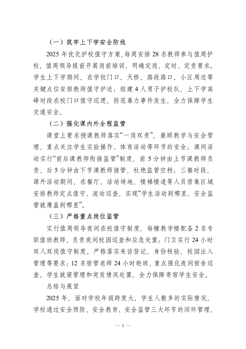 2025年度学校安全工作总结:预防、教育、监管三手抓2025年,学校始终将安全工作置于各项工作的核心位置,纳入常规重点日程,坚守“安全第一、预防为主、综合治理”的工作方针,聚焦安全预防、安全教育、安全监管三大关键环节,持续强化全校师生员工的安全防范意识与应急处置能力,全面提升校园安全管理规范化、精细化水平。现将本年度安全工作详细总结如下:一、抓实安全预防,筑牢全方位防护网络(一)完善制度体系,做到有章可循依据上级部门最新安全工作要求,结合学校实际情况,2025年进一步修订完善了教室、实验室、食堂、宿舍等重点场所的设备设施隐患排查制度,以及食品卫生、交通安全、门卫管理、学生请假登记等专项安全制度。形成覆盖校园全场景、各环节的安全管理规范体系,确保安全工作每一项流程都有章可循、每一项操作都有规可依。(二)压实层级责任,实现全员担责构建“全员参与、全域覆盖、全程追溯”的安全责任体系,与校内安全相关岗位人员层层签订《2025年度安全目标责任书》,明确各岗位的安全职责、工作标准和责任边界。建立“层层设岗、岗岗有人、人人有责、失职追责”的责任链条,确保安全检查不缺位、隐患整改不拖延,全力保障师生人身安全与学校财产安全。