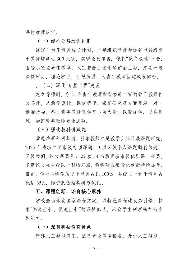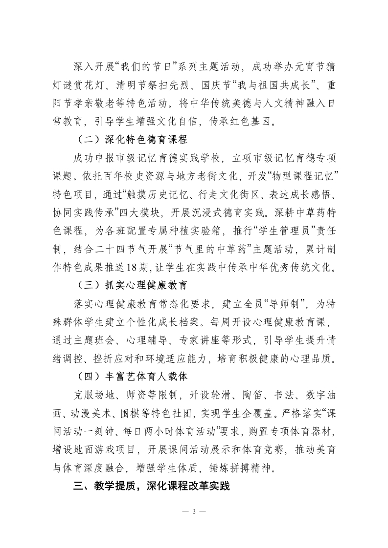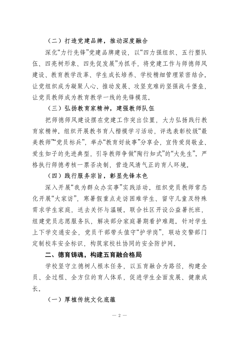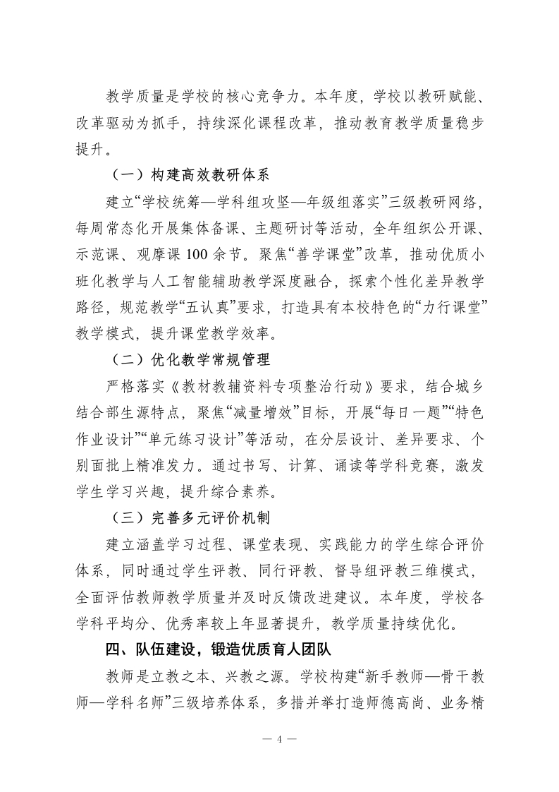 2025年度学校工作总结汇报及2026年工作计划:抓党建、育新人、提质量,各项工作有成效2025年是全面贯彻党的二十大精神的关键之年,是“十四五”规划收官的决胜之年,更是我校深耕教育改革、迈向高质量发展的攻坚之年。本年度,学校以习近平新时代中国特色社会主义思想为根本遵循,牢牢把握立德树人根本任务,紧扣区域教育发展部署,巩固“双创”建设成果,践行“大情怀育人”核心理念,构建起“文化育人、课程育人、实践育人”三位一体的教育新生态,重点推进八大核心工作板块,各项事业取得突破性进展,稳步向“家门口的好学校”目标迈进。现将全年工作详情汇报如下:一、党建引领,锚定发展航向党建是学校发展的“根”与“魂”。本年度,学校严格落实党组织领导的校长负责制,以高质量党建引领教育教学高质量发展,推动党建工作与办学治校深度融合、同频共振。(一)深化理论学习,凝聚思想共识持续推进习近平新时代中国特色社会主义思想学习教育,巩固拓展主题教育成果。通过理论学习中心组学习、主题党日活动、专题党课等多元形式,引导全体党员教师深刻领悟“两个确立”的决定性意义,增强“四个意识”、坚定“四个自信”、做到“两个维护”,确保党的教育方针在校园落地生根。