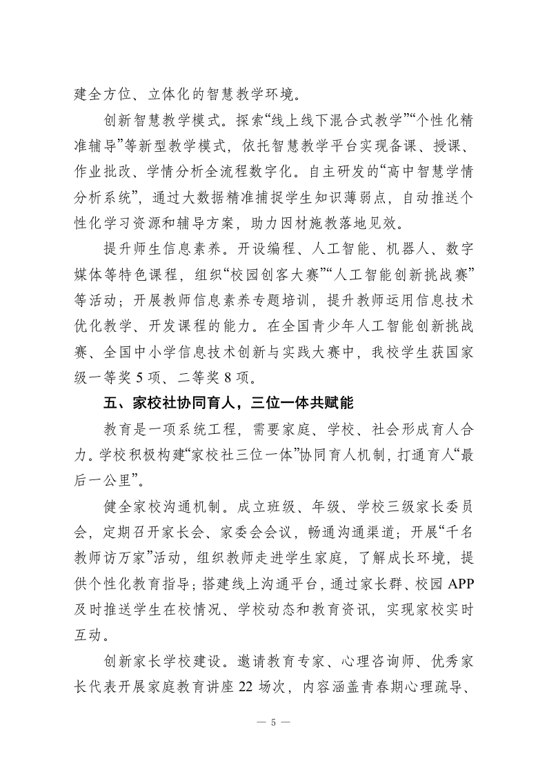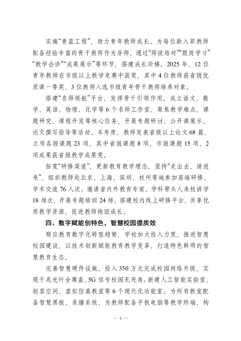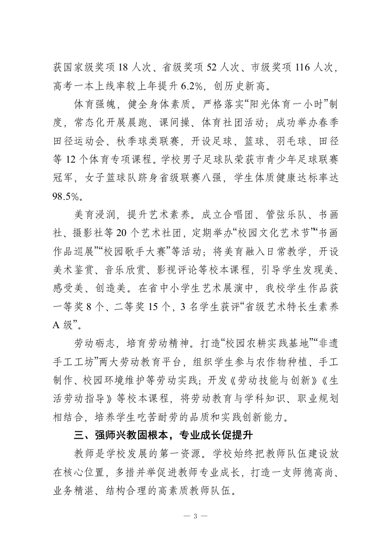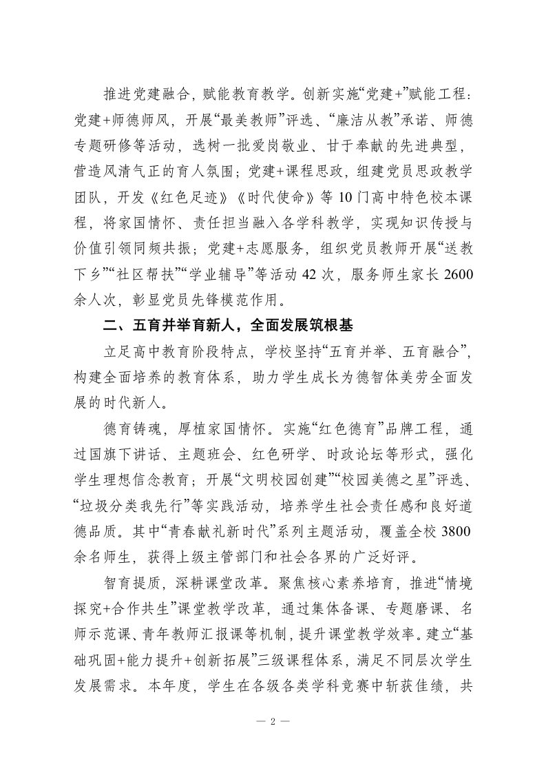 2025年高中学校领导班子述职报告:丹心铸魂育新人,笃行致远兴教育各位领导、老师们:大家好!时序更替,华章日新。冬日的校园暖意融融,2025年的奋斗征程已近尾声,2026年的崭新画卷正待铺展。教育是国之大计、党之大计,承载着立德树人的神圣使命。过去一年,学校领导班子始终坚守“为党育人、为国育才”初心,团结带领全校师生员工,以习近平新时代中国特色社会主义思想为指导,全面贯彻党的教育方针,在传承中守正、在创新中提质,推动学校各项事业高质量发展,交出了一份厚重提气的年度答卷。在此,我谨代表学校领导班子,向辛勤耕耘、无私奉献的全体教职工致以最崇高的敬意和最诚挚的感谢!现将2025年度工作情况汇报如下,请予评议。一、党建领航强根基,凝心铸魂聚合力旗帜引领方向,党建凝聚人心。学校党委始终把政治建设摆在首位,以高质量党建引领学校高质量发展。深化理论武装,筑牢思想根基。全年组织党委理论学习中心组学习16次、专题党课8堂、主题党日活动12场,组织党员教师深入学习党的二十大及二十届三中全会精神、《习近平谈治国理政》第四卷等重要内容,深刻领悟“两个确立”的决定性意义,增强“四个意识”、坚定“四个自信”、做到“两个维护”,推动党的创新理论入脑入心。一1