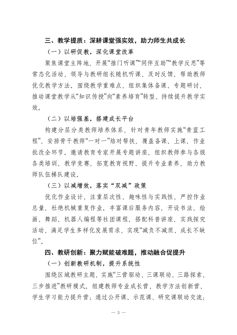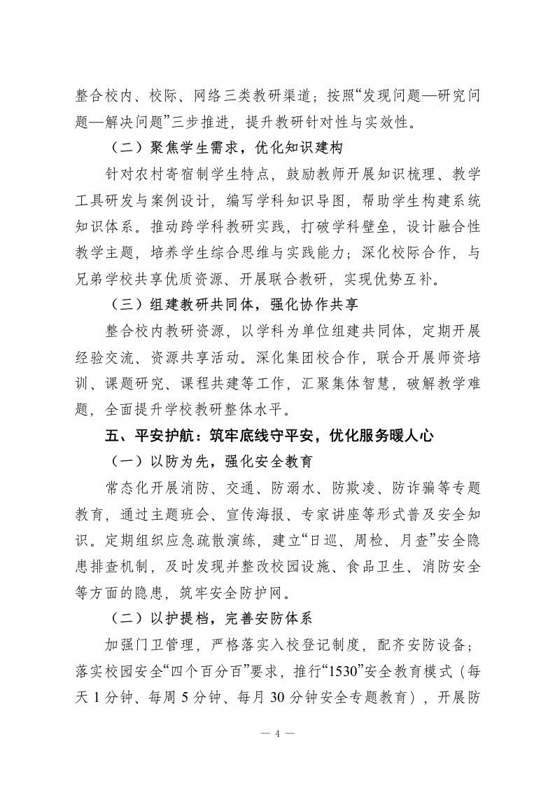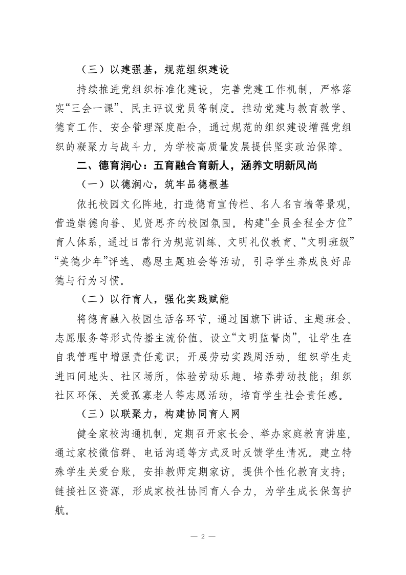 2025年校长述职报告:勇担当守初心,实干笃行促发展尊敬的各位领导、老师们:大家好!2025年,是教育事业高质量发展的攻坚之年,也是我校凝心聚力、守正创新的奋进之年。这一年,我们秉持“以生为本、以师为基”的办学理念,坚守“为党育人、为国育才”的初心使命,全体师生携手并肩、勇担使命,在党建引领、德育铸魂、教学提质、教研创新、安全护航等方面实干笃行,推动学校各项工作再上新台阶。现将本人2025年度履职情况汇报如下,请各位领导、老师批评指正。一、铸魂领航:党建引领强根基,凝聚发展新合力(一)以学铸魂,夯实政治素养组织党员教师系统学习党的创新理论、教育方针政策,常态化开展主题党日活动,结合教育教学实际开展专题研讨,以理论武装淬炼党性修养。邀请党校专家开展专题讲座,引导党员教师深刻领会“为党育人、为国育才”的根本使命,将思想政治教育贯穿教育教学全过程,助力学生树立正确的“三观”。(二)以行践诺,彰显先锋本色设立“党员示范岗“党员护学岗”,引导党员教师在教学改革、教研创新、学生帮扶等工作中走在前、作表率。党员教师带头上示范课、开展公开课,分享教学经验;主动与困难学生、留守儿童结对,提供学习辅导与心理关怀,用实际行动践行育人初心,带动全体教师共同进步。—1
