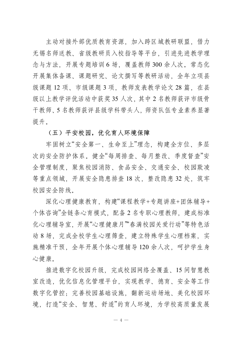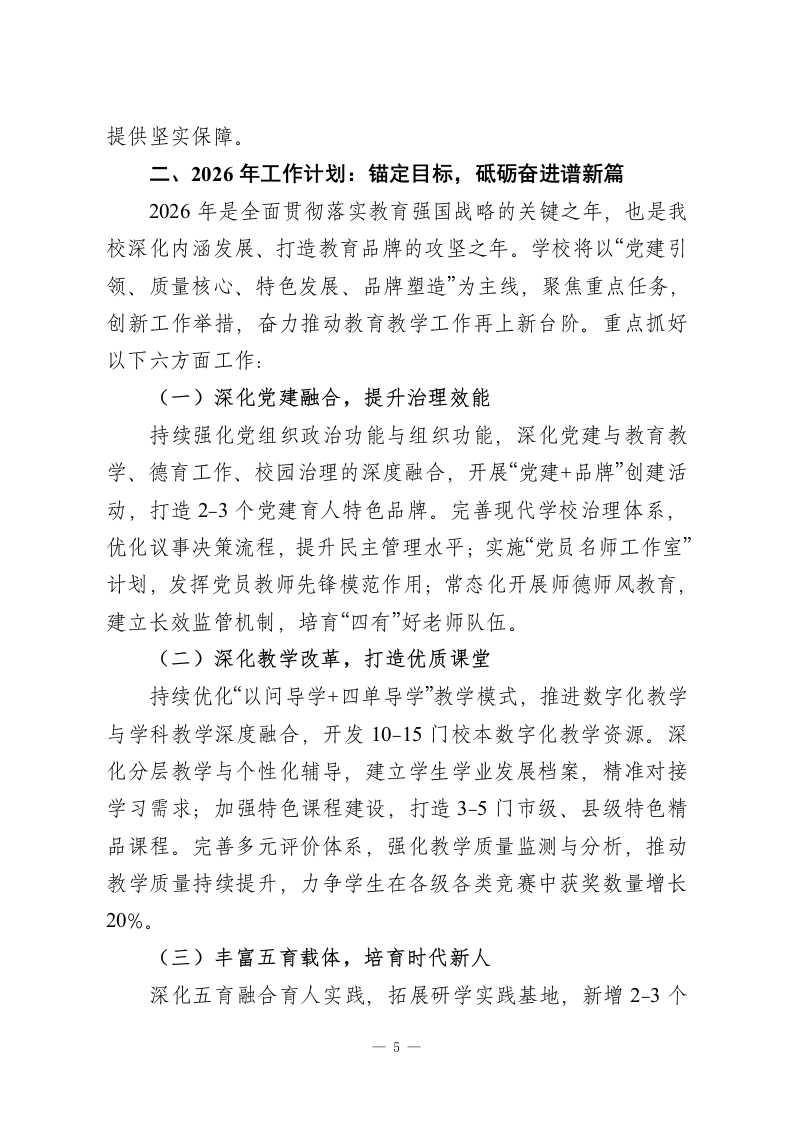 2025年学校工作回顾与2026年工作计划:2025年五方面出成效,2026年六件事再发力2025年,我校在上级教育行政部门的正确引领下,牢牢锚定“立德树人”根本方向,以党建为魂、质量为核、改革为翼、安全为基,系统推进党建引领、教学提质、德育铸魂、教研赋能、校园升级等重点工作,在内涵发展与特色建设的道路上稳步迈进,圆满完成年度各项目标任务,为办好人民满意的教育交出了扎实答卷。一、2025年工作回顾:守正创新,深耕细作结硕果(一)党建领航,筑牢育人政治根基坚持党建工作与办学治校深度融合,健全“党组织领导下的校长负责制”,修订学校章程与议事规则,规范“三重一大”决策程序,充分发挥教职工代表大会、家长委员会的民主参与和监督作用,构建“党建引领、行政主导、民主协同、社会参与”的现代学校治理体系。深化思想政治建设,搭建“理论学习中心组+专题党课+红色研学+线上课堂”四维学习平台,组织党员教师开展“学思想、强党性、重实践、建新功”主题教育活动12场,赴红色教育基地开展实践研学3次,实现理论学习与实践教育深度融合。实施“师德师风提升工程”,开展师德专题培训4场,签订师德师风承诺书,建立“负面清单”管理制度,将师德考核结果与评优评先、