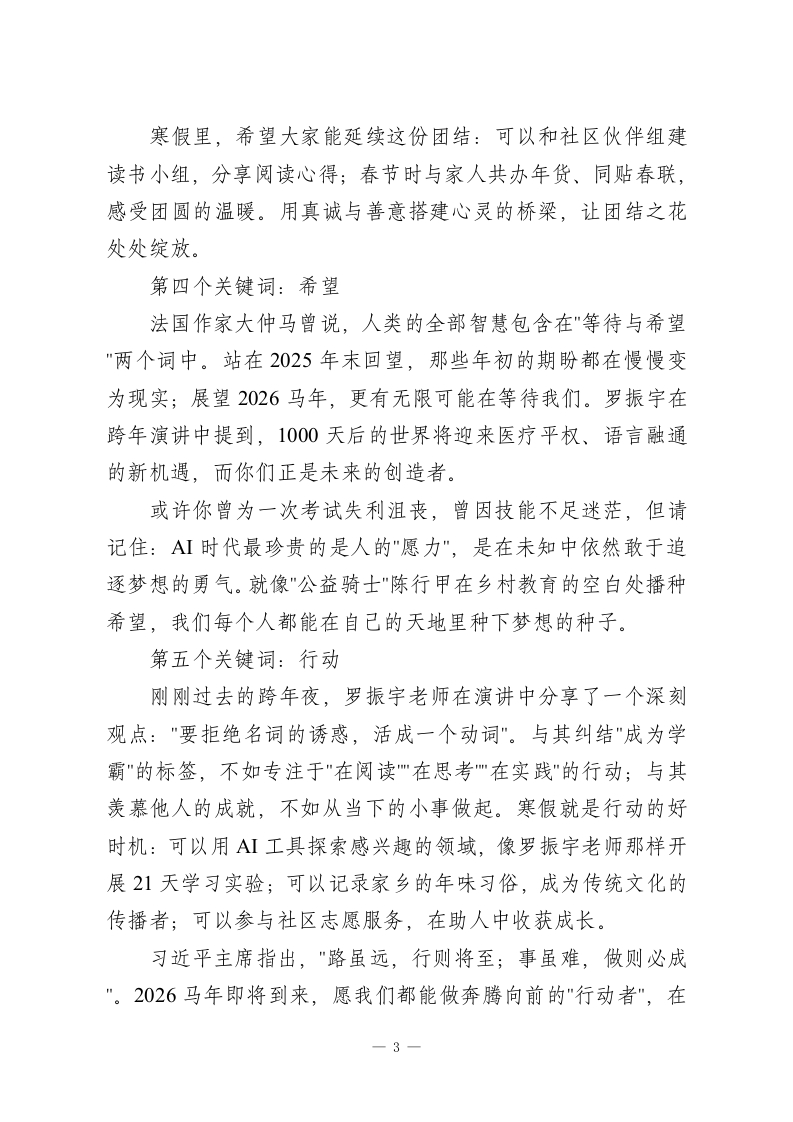 2025秋季学期寒假散学典礼,校长讲话:坚持,铭记,团结,希望,行动亲爱的老师们,同学们:大家好!从明天开始,愉快的寒假就要拉开序幕了,我的心情和你们一样,满溢着欢乐、期待与对新年的憧憬。回望2025这一年的校园时光,每一天都镌刻着同学们的奋斗足迹,每一刻都闪耀着师生们的智慧光芒。我们共同见证了科创节上机器人舞蹈的灵动,参与了传统文化周的非遗体验,在运动会上挥洒过热血汗水,在读书分享会中碰撞过思想火花。在全校师生的携手努力下,学校在课程创新、校园文化建设等方面收获了丰硕成果,老师们深耕讲台育桃李,同学们笃学不怠求新知,这无疑是一段值得铭记的成长旅程。放假是大家期盼已久的时刻。但我想问问同学们:放假意味着彻底放松目标,还是开启另一种成长?如果在寒假里迷失方向、虚度光阴,开学时难免会心生懊悔。今天,在2025年的最后一段校园相聚时光里,我想和大家分享五个关键词,愿与老师们、同学们共勉。第一个关键词:坚持坚持是历经时光沉淀的精神底色,无论是求学途中对知识的孜孜以求,还是人生路上对理想的矢志坚守,真正的坚持从来不是一时的意气风发,而是将认定之事贯彻到底的韧劲。成长路上,坚持从来不是轰轰烈烈的壮举,而是每天清晨的晨读、1