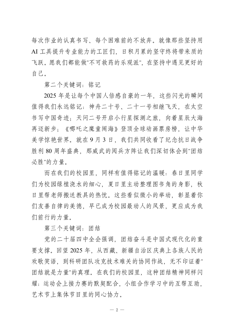 2025秋季学期寒假散学典礼,校长讲话:坚持,铭记,团结,希望,行动亲爱的老师们,同学们:大家好!从明天开始,愉快的寒假就要拉开序幕了,我的心情和你们一样,满溢着欢乐、期待与对新年的憧憬。回望2025这一年的校园时光,每一天都镌刻着同学们的奋斗足迹,每一刻都闪耀着师生们的智慧光芒。我们共同见证了科创节上机器人舞蹈的灵动,参与了传统文化周的非遗体验,在运动会上挥洒过热血汗水,在读书分享会中碰撞过思想火花。在全校师生的携手努力下,学校在课程创新、校园文化建设等方面收获了丰硕成果,老师们深耕讲台育桃李,同学们笃学不怠求新知,这无疑是一段值得铭记的成长旅程。放假是大家期盼已久的时刻。但我想问问同学们:放假意味着彻底放松目标,还是开启另一种成长?如果在寒假里迷失方向、虚度光阴,开学时难免会心生懊悔。今天,在2025年的最后一段校园相聚时光里,我想和大家分享五个关键词,愿与老师们、同学们共勉。第一个关键词:坚持坚持是历经时光沉淀的精神底色,无论是求学途中对知识的孜孜以求,还是人生路上对理想的矢志坚守,真正的坚持从来不是一时的意气风发,而是将认定之事贯彻到底的韧劲。成长路上,坚持从来不是轰轰烈烈的壮举,而是每天清晨的晨读、1
