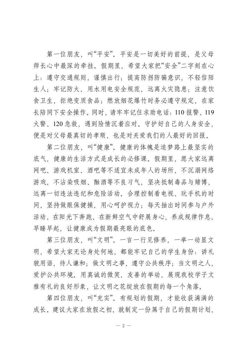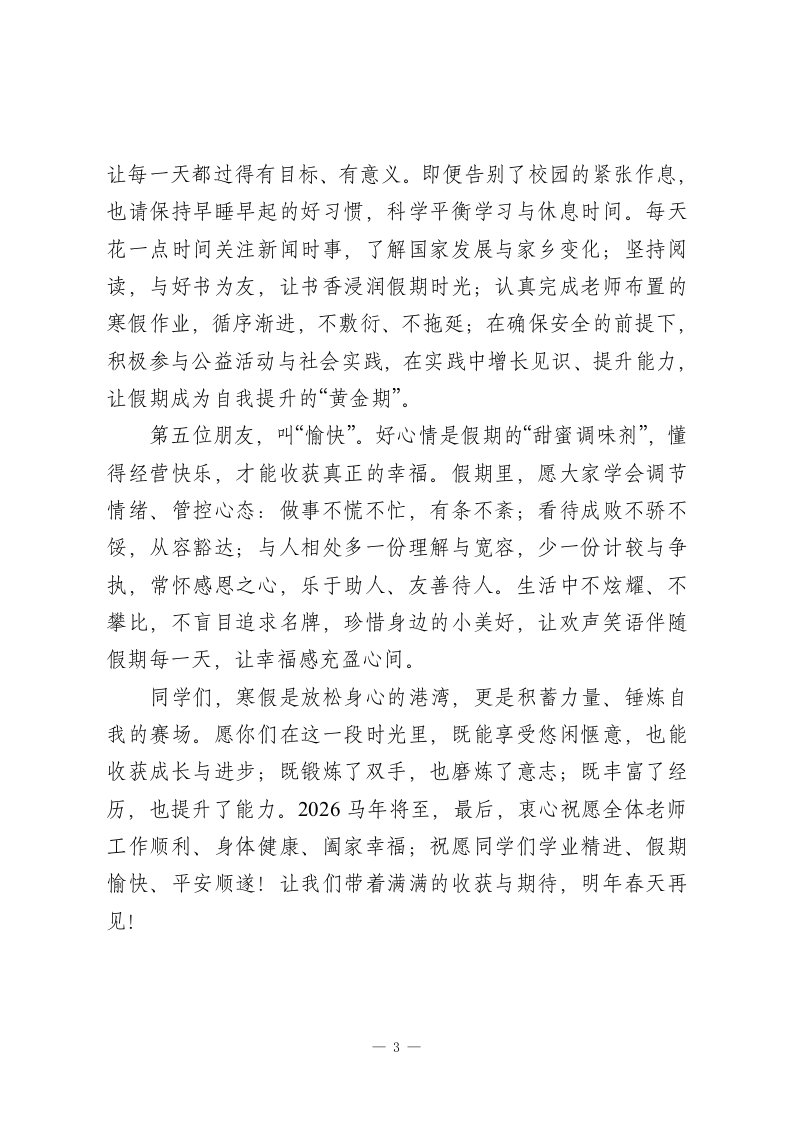 2025秋季学期寒假散学典礼,校长讲话:平安、健康、文明、充实、愉快敬爱的老师们、亲爱的同学们:大家好!时光荏苒,步履不停。转眼间,2025年秋季学期已悄然落幕,凛冽的腊月寒风,也挡不住我们对寒假的热切期盼。今天,我们齐聚这里,既是为过往一学期的成长画上圆满句号,也是为即将开启的假期征程送上真挚祝福。回望这一学期,总有太多温暖值得铭记:感谢每一位老师,以爱心与坚守浇灌孩子们的成长之路;感谢保安叔叔、门卫伯伯与清洁阿姨,用默默付出为校园筑牢安全防线、守护洁净环境;更感谢每一位家长,风雨无阻的接送、无微不至的陪伴,是孩子们最坚实的后盾。同学们,寒假的大门已然敞开,这不仅是一段放松休憩的时光,更是一段自主成长、丰富自我的新旅程一一你们或许会伴着父母的脚步探访亲友、饱览山河,或许会主动分担家务、体会劳动的乐趣,或许会投身公益志愿、传递温暖力量,亦或是沉浸书海、在知识世界里积蓄成长动能。无论选择何种方式,这段属于你们的时光,都将被学校与老师的祝福紧紧包裹!今天,我想代表全体老师,送给大家五位“假期好朋友”,它们浓缩成五个关键词,愿能伴随大家度过一段平安、健康、文明、充实又愉快的寒假:一1