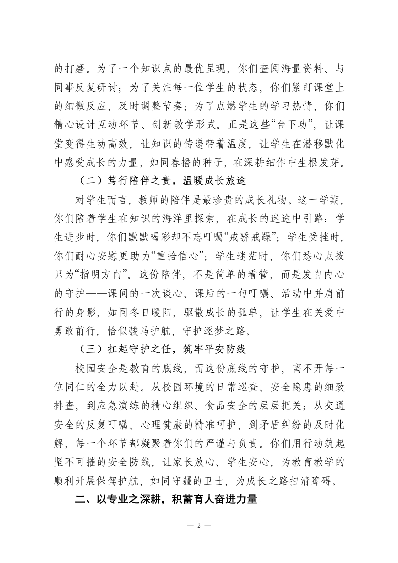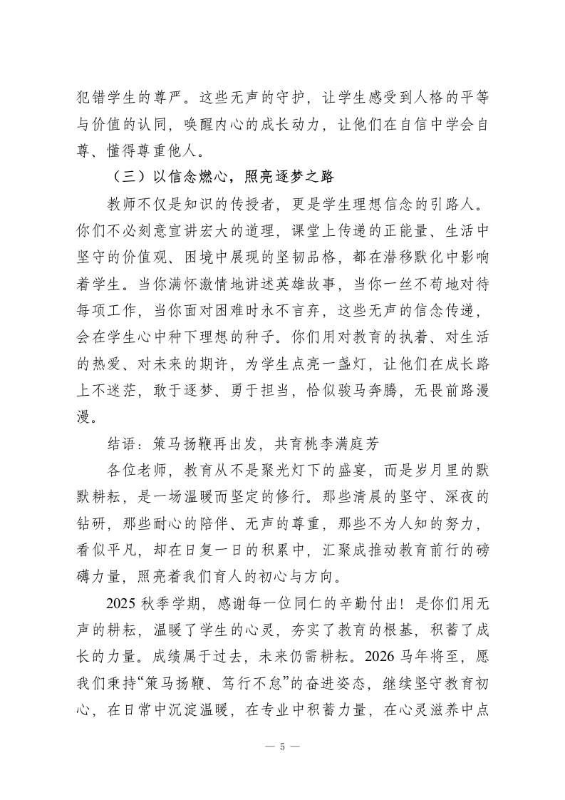 2025秋季学期期末教职工大会,校长讲话:以无声耕耘铸魂,驭奋进之姿逐光各位老师:大家好!2025秋季学期已徐徐收笔。今天,我们齐聚一堂,既是对这一学期教育耕耘的复盘与沉淀,更是向每一位躬身杏坛、笃行不怠的同仁,致以最诚挚的敬意与感恩。站在秋去冬来的节点回望,亮眼的成绩、难忘的瞬间固然值得铭记,但更让我们动容的,是成绩背后那些不事张扬的坚守、不求回报的付出。恰逢2026马年将至,“策马扬鞭”的奋进气息已悄然弥漫,今天,我想和大家分享的主题是:以无声耕耘铸魂,驭奋进之姿逐光。一、以日常之笃行,铺就教育温厚底色教育的温度,从不在惊天动地的壮举里,而藏在日复一日的琐碎与平凡中。这一学期,我们以匠心守初心,用无数个“微小”的坚持,串联起育人的全过程:是清晨的微光里,你们伫立教室门口的身影,等候着一张张稚嫩的脸庞;是深夜的灯火下,你们伏案打磨教案、批注作业的专注,藏着对每一个知识点的较真;是课堂上不厌其烦的讲解、课后耐心细致的答疑,是发现学生情绪波动时的轻声抚慰,是调解矛盾时的公正疏导。这些看似微不足道的日常,恰恰是教育最本真的模样,藏着我们对教育事业最纯粹的热爱,如同马群踏春的蹄印,踏实而坚定。(一)精耕课堂方寸,筑牢育人根基课堂是教育的主阵地,而优质课堂的背后,是无数看不见1