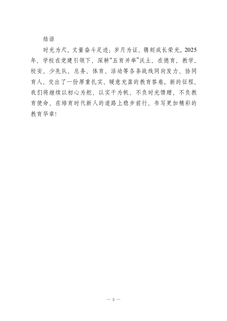 2025学校工作汇报:五育赋能成长路,时光见证育人功时光如笔,在勤耕不辍的岁月里镌刻成长;岁月如卷,在同心筑梦的征程中铺展华章。当2025年的步履悄然远去,回望XX学校的校园沃土,每一寸光阴都沉淀着奋斗的力量,每一处风景都闪耀着成长的荣光。这一年,我们以党建为魂、初心为舵、实干为帆,在“五育并举”的教育航道上笃定前行,书写了一段充实而璀璨的育人篇章。一、党支部:一旗领航,铸牢育人根魂铸魂育人,党建为基。2025年,XX学校党支部锚定标准化建设提质增效目标,深耕党建与育人深度融合之路。从“三会一课”固本强基、主题教育凝心聚气,到党员先锋岗亮身份、践使命,在教育一线树立标杆;从强化支部堡垒作用,为学校发展把舵定向,到推进党团队一体化育人,让红色薪火代代相传,我们始终坚守党建“根”与“魂”。党建引领化作凝聚合力、淬炼作风、厚植初心的坚实纽带,让红色基因浸润师生心田,以党建之光照亮育人新征程。二、德育:一言一行,涵养品德之美德润童心,向阳生长。我们秉持“立德树人,德育为先”的教育理念,2025年,学校德育处紧扣学校中心工作,扎实推进学生思想道德建设,同步强化教师德育素养培育与家校社协同育人机制构建。依托丰富多彩的主题教育活动,构建全员参与、全程渗透、全方位覆盖的德育育人体系,全力培育德智体美劳1