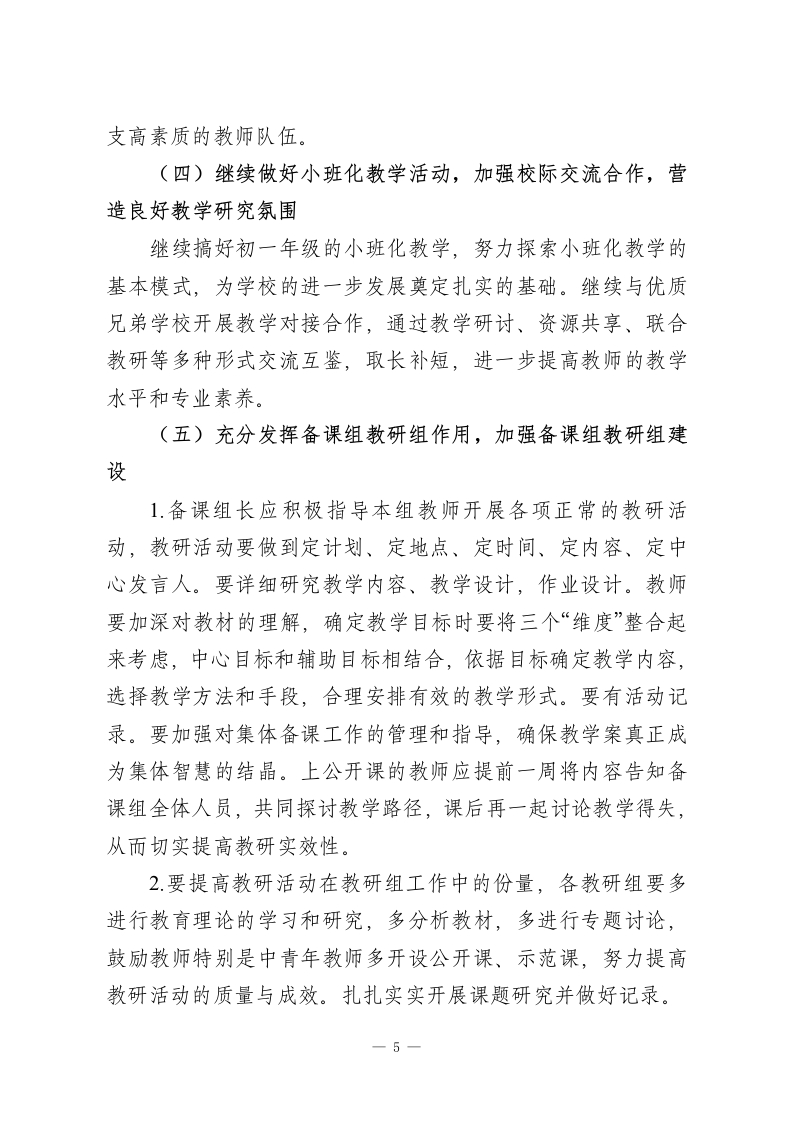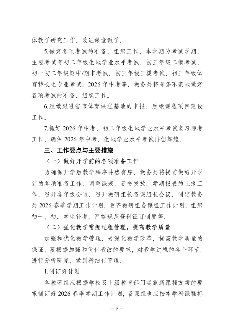 2026春季学期教务处工作计划(初中学校)附行事历一、指导思想以教育局2026春季学期工作要点为指针,以全面实施素质教育为宗旨,着眼于学生和学校的可持续发展,稳步推进高效课堂改革。根据教务处“管理、服务,指导、评价”的职能,以深化课改、备战2026年中考、优化教学、加强师资建设为工作重点,以提高教学质量为核心,以校本培训为抓手,以教研组、备课组建设为突破,把教务处建成学科教学的管理中心,教学质量的监控中心,教师专业化发展的引领中心,全面提高教学质量。二、工作目标1.深化“质量是生命”的意识,进一步提高办学质量和社会声誉。2.根据学校教学发展的规划,修订和完善新课程理念下的教学工作管理制度、教学工作考核制度,建立适合本校特点的教学管理制度,重点提高学生整体水平。3逐步执行课程计划,完善课程设置的结构,按照国家要求,开满课,上好每一科,加强教学过程的监督和管理,突出质量意识,聚焦课堂教学,切实提高课堂效益,全面提高教学质量。在初一年级加开足球活动课。4.加强教研组、备课组建设,规范教研组、备课组的活动,尤其加大教师常规工作的督导和检查力度,切实提高备课组集1
