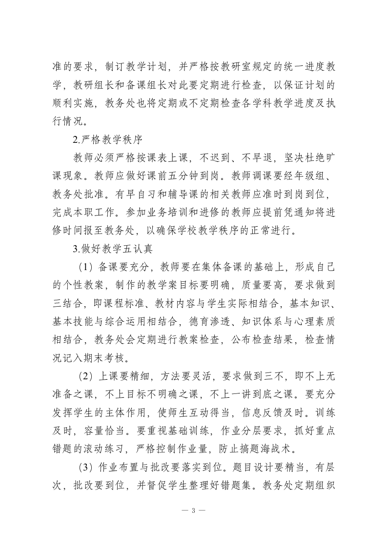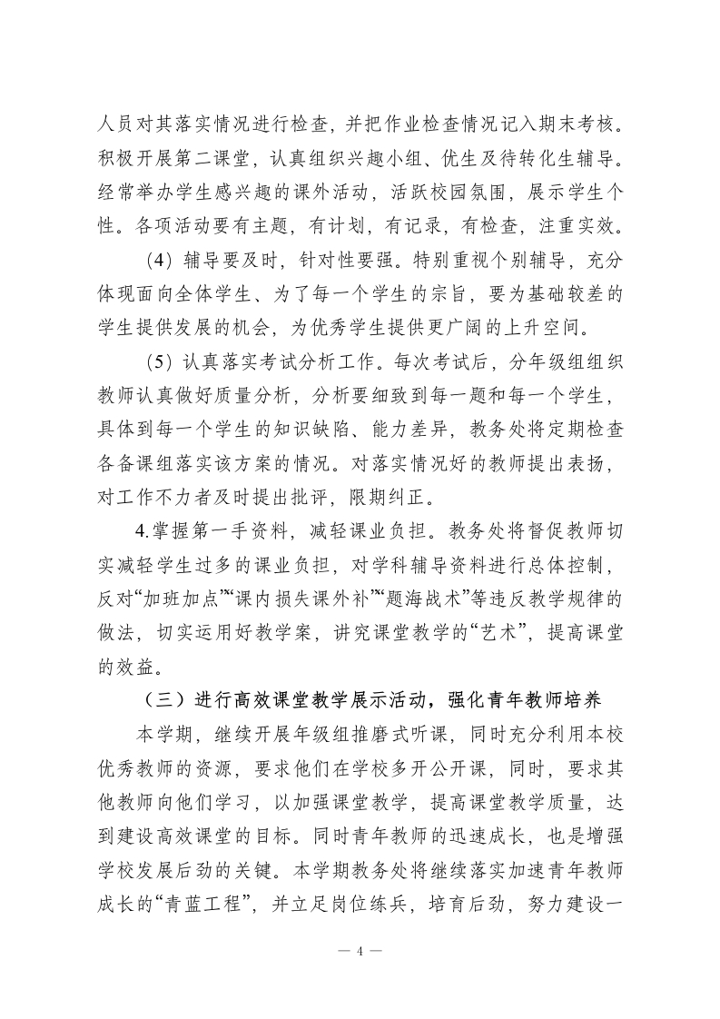 2026春季学期教务处工作计划(初中学校)附行事历一、指导思想以教育局2026春季学期工作要点为指针,以全面实施素质教育为宗旨,着眼于学生和学校的可持续发展,稳步推进高效课堂改革。根据教务处“管理、服务,指导、评价”的职能,以深化课改、备战2026年中考、优化教学、加强师资建设为工作重点,以提高教学质量为核心,以校本培训为抓手,以教研组、备课组建设为突破,把教务处建成学科教学的管理中心,教学质量的监控中心,教师专业化发展的引领中心,全面提高教学质量。二、工作目标1.深化“质量是生命”的意识,进一步提高办学质量和社会声誉。2.根据学校教学发展的规划,修订和完善新课程理念下的教学工作管理制度、教学工作考核制度,建立适合本校特点的教学管理制度,重点提高学生整体水平。3逐步执行课程计划,完善课程设置的结构,按照国家要求,开满课,上好每一科,加强教学过程的监督和管理,突出质量意识,聚焦课堂教学,切实提高课堂效益,全面提高教学质量。在初一年级加开足球活动课。4.加强教研组、备课组建设,规范教研组、备课组的活动,尤其加大教师常规工作的督导和检查力度,切实提高备课组集1