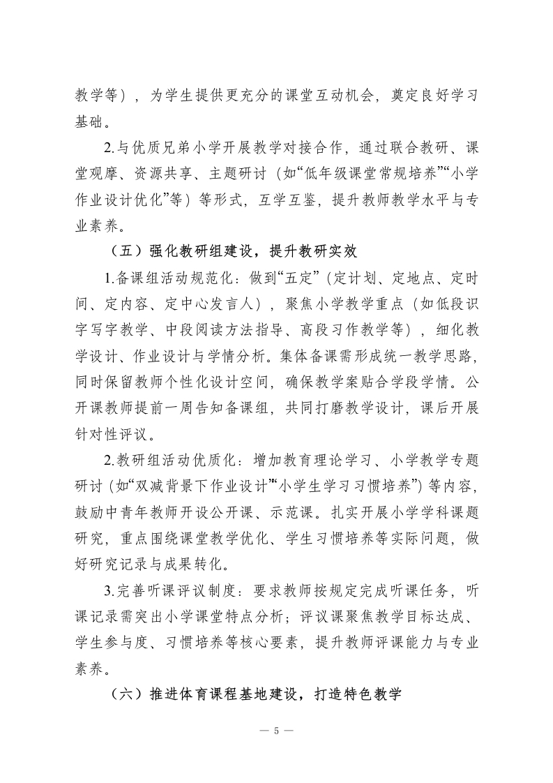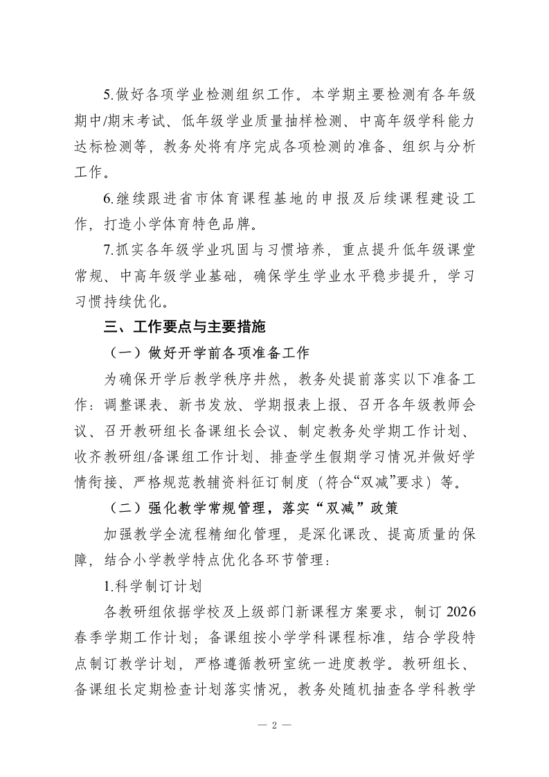 2026春季学期教务处工作计划(小学学校)一、指导思想以教育局2026春季学期工作要点为指针,以全面实施素质教育为宗旨,着眼于小学生身心发展规律和学校可持续发展,稳步推进高效课堂改革。根据教务处“管理、服务,指导、评价”的职能,以深化课改、优化教学、加强师资建设、落实“双减”政策为工作重点,以提高教学质量为核心,以校本培训为抓手,以教研组、备课组建设为突破,把教务处建成学科教学的管理中心,教学质量的监控中心,教师专业化发展的引领中心,全面提升教学质量与学生综合素养。二、工作目标1.深化“质量是生命”的意识,进一步提高办学质量和社会声誉,聚焦学生核心素养培育。2.根据学校教学发展规划,修订和完善新课程理念下的教学工作管理制度、教学考核制度,建立适合小学特点的教学管理体系,重点提升学生学业基础与学习习惯。3.严格执行国家课程计划,完善课程设置,开满国家规定课程,上好每一门学科,加强教学过程监督管理,聚焦课堂教学实效,全面提高教学质量。在一年级加开足球趣味活动课,丰富低年级体育教学形式。4加强教研组、备课组建设,规范教研活动流程,加大教师常规工作督导力度,强化集体备课实效,优化小学课堂教学模式。一1