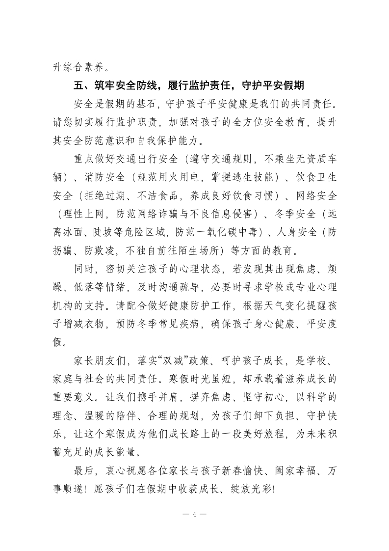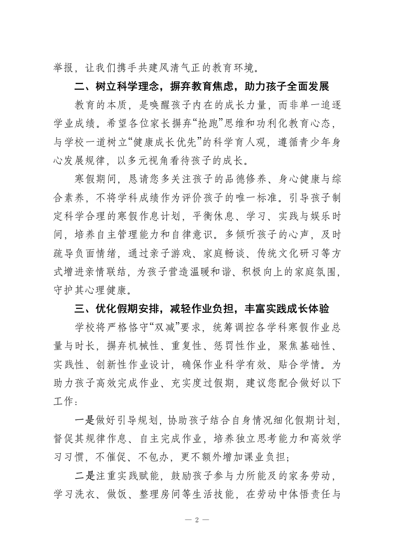 2026年寒假落实“双减”致全体家长的倡议书尊敬的各位家长朋友:您好!冬意渐浓,岁末临近,本学期的教育教学工作已圆满收官。首先,学校谨向一直以来理解、支持并携手我们推进各项工作的各位家长,致以最诚挚的感谢!寒假在即,这既是孩子们休整身心、滋养成长的美好时光,也是增进亲子情感、拓宽成长视野的黄金契机。为持续深入贯彻国家“双减”(减轻义务教育阶段学生作业负担和校外培训负担)政策要求,让孩子们度过一个安全、充实、愉悦且有意义的假期,我们特此发出如下倡议,恳请您与学校同心同向,共护孩子健康成长一、坚守政策底线,抵制违规培训,共建清朗教育生态“双减”政策的核心,是让教育回归本真,为孩子卸下过重课业负担,让成长回归自然节奏。国家明确规定,寒暑假、法定节假日及休息日,严禁任何校外培训机构开展义务教育阶段学科类培训。这类违规培训不仅违背青少年身心成长规律,加重孩子学业与心理双重压力,还可能存在师资资质不齐、教学质量无保障、资金安全隐患等问题,严重扰乱正常教育秩序。在此,恳请各位家长明辨政策边界,坚决抵制各类违规学科类培训。无论是“一对一”私教、小班化辅导、住家托管式教学等线下隐形变异形式,还是依托线上平台开展的隐蔽性学科培训,均请自觉拒绝,不盲目跟风、不被虚假宣传误导。若发现此类违规行为,欢迎及时向学校或当地教育、市场监管部门—1