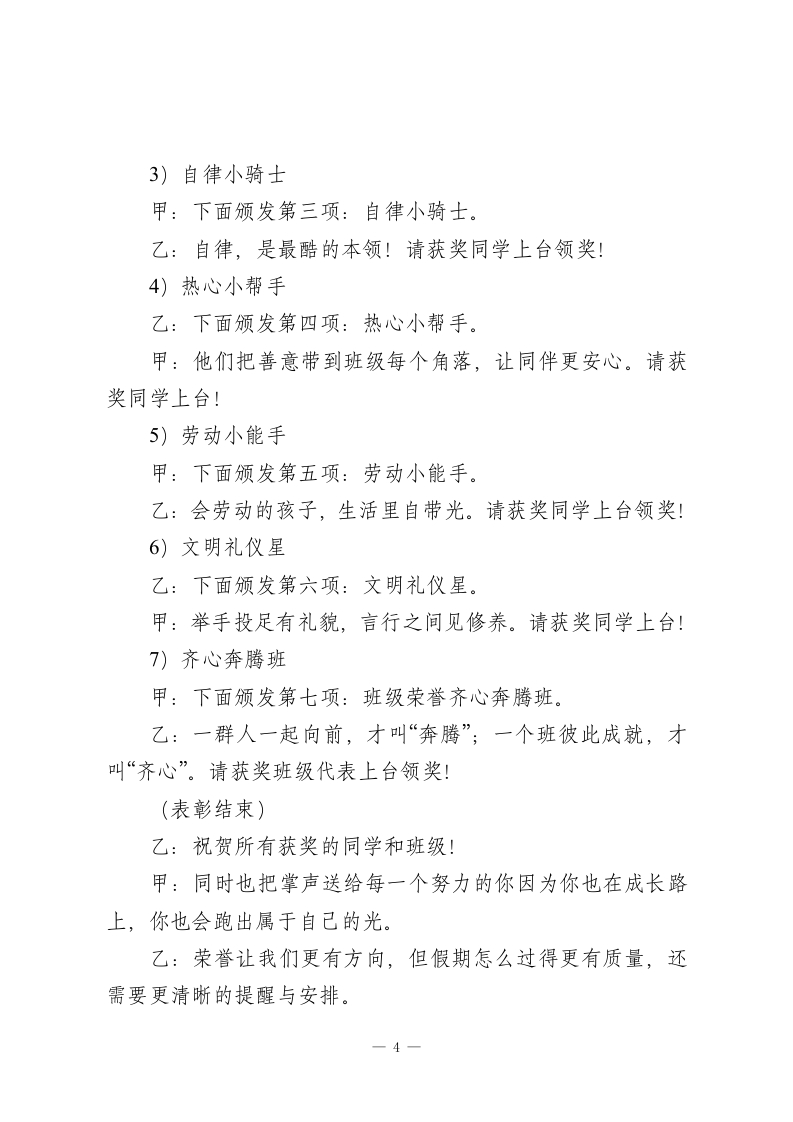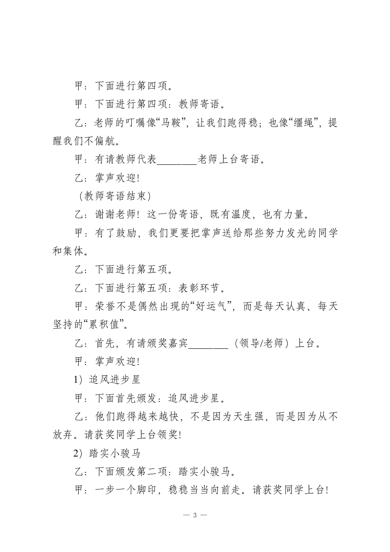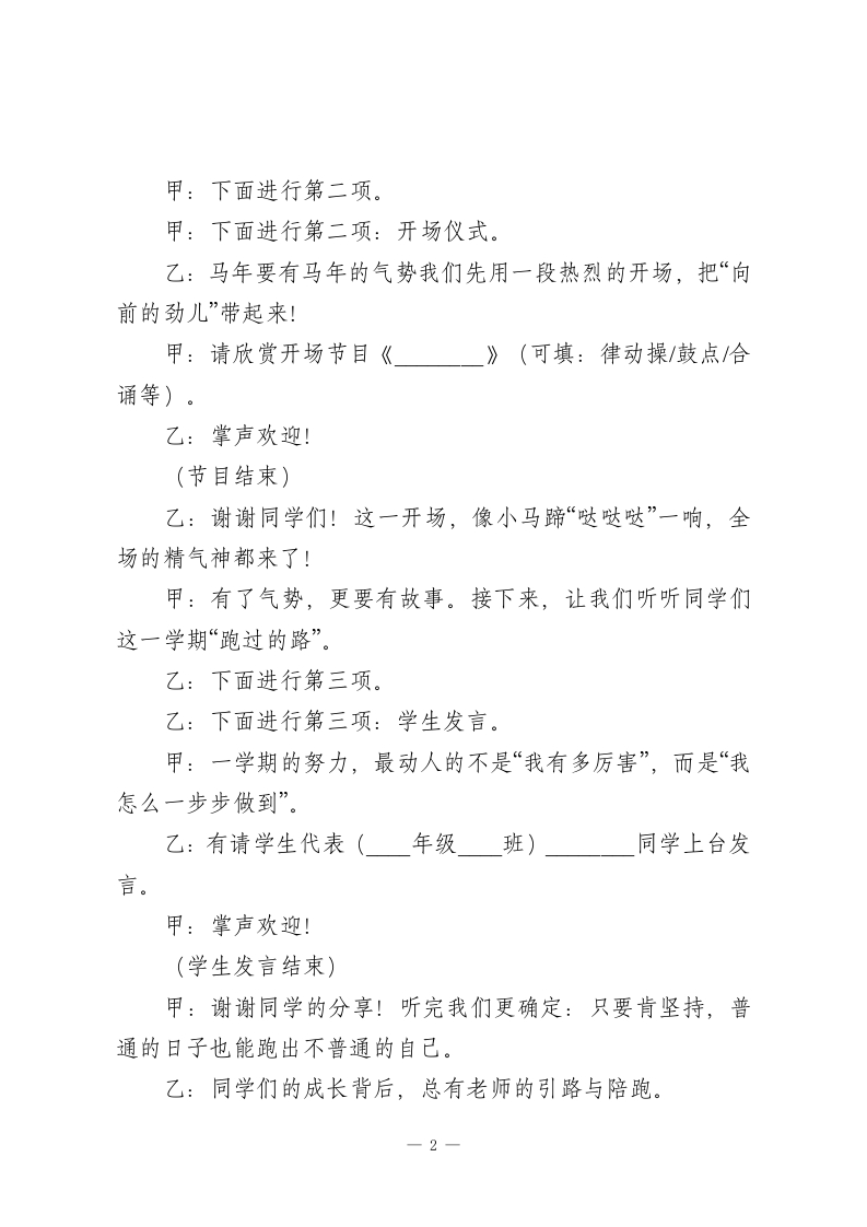 2026年寒假散学典礼主持词骐骥驰骋,势不可挡甲:尊敬的各位领导、老师们!乙:亲爱的同学们!大家上午好!甲:一学期像一条跑道,有汗水、有掌声,也有悄悄变强的自己。乙:今天,我们把这一学期的收获好好“打包”,把马年的祝福认真“点亮”。甲:本次散学典礼主题是骐骥驰骋,势不可挡!乙:愿每位同学都能带着“奔跑、向前、坚持”的力量,快乐迎新年,安全过寒假!甲:我宣布2026年寒假散学典礼合:现在开始!乙:下面进行第一项:马年签到“奔跑足迹墙”能量集结。甲:同学们刚刚已经在足迹墙上留下了自己的“马蹄印”,也写下了本学期最自豪的成长关键词。乙:有的写“坚持”,有的写“勇敢”,还有的写“我越来越自律”。甲:这面墙要告诉我们:成长不是一下子变厉害,而是每天向前一小步。乙:当我们把这一学期的足迹踩稳了,接下来,就要把典礼的气氛点燃起来!一1