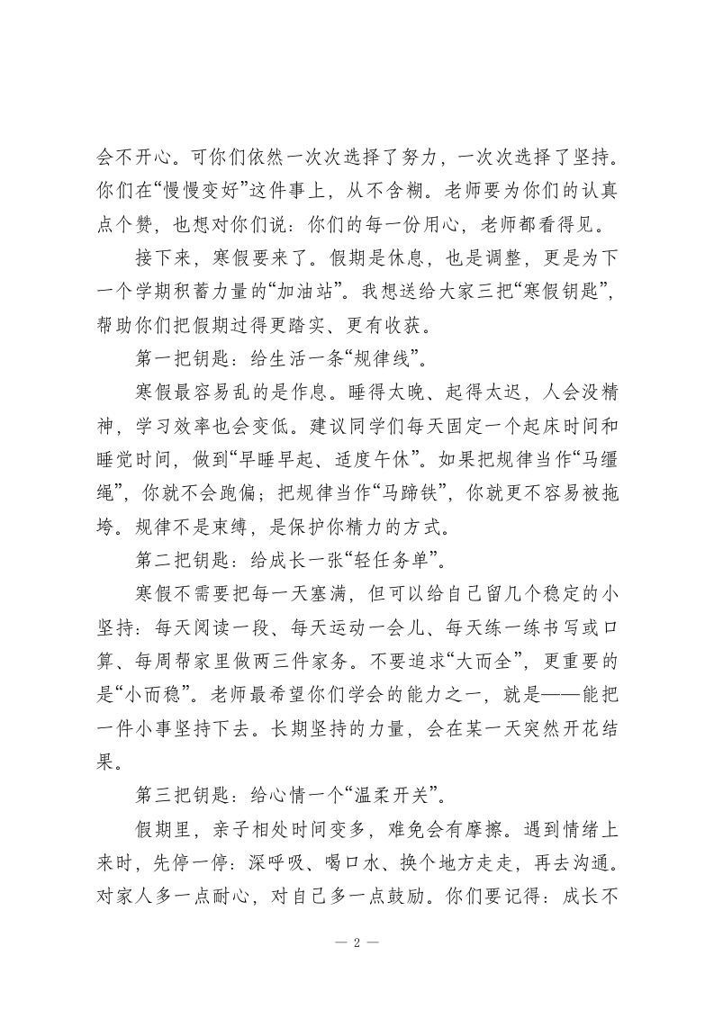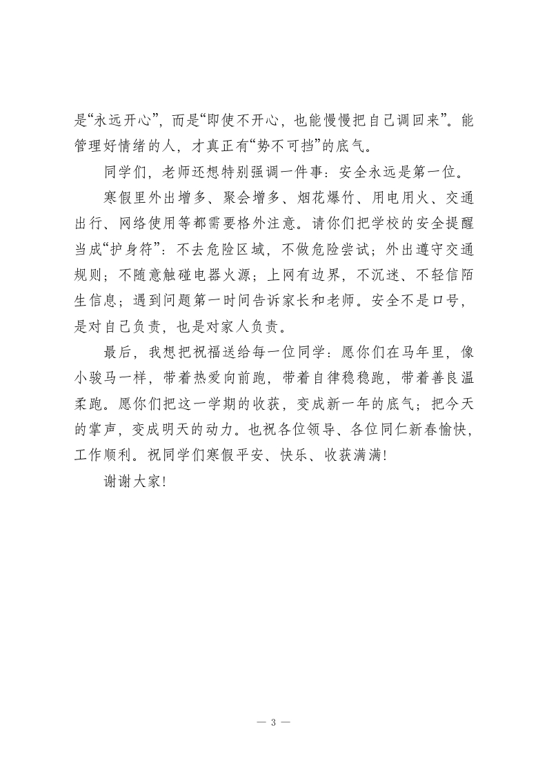 2026年散学典礼教师讲话稿骐骥驰骋,势不可挡尊敬的各位领导、各位同仁,亲爱的同学们:大家上午好!很荣幸在今天这场充满仪式感的散学典礼上,代表老师们说几句话。站在这里,我心里有很多画面:教室里你们专注的眼神、操场上你们奔跑的身影、活动中你们大胆的尝试,还有一次次跌倒后又站起来的倔强。一个学期结束了,我们把“成绩单”收好,把“经历”装进心里,也把“下一段路”轻轻打开。今天的主题是“骐骥驰骋,势不可挡”。在老师的眼里,真正的“势不可挡”并不是谁跑得最快,而是谁能在日复一日中把正确的事坚持下去;不是谁从来不犯错,而是谁能在犯错后愿意调整、愿意重来;不是谁永远顺利,而是谁在遇到难题时仍然保持耐心和勇气。你们这一学期的成长,很多时候就体现在这些“不起眼却很关键”的瞬间里:按时交作业、认真听讲、主动举手、遇到同学需要帮助时伸出手、在课堂上敢于表达、在比赛中懂得合作…这些细碎的进步,像一颗颗种子,已经在你们身上悄悄发芽。作为老师,我也想借今天的机会说一句:这一学期,辛苦你们了。学习从来不是轻松的事,小学阶段更像“打底子的工程有的同学背单词背到想放弃,有的同学计算题反复错得很懊恼,有的同学写作业写得手酸,有的同学在班级相处中也会委屈、1