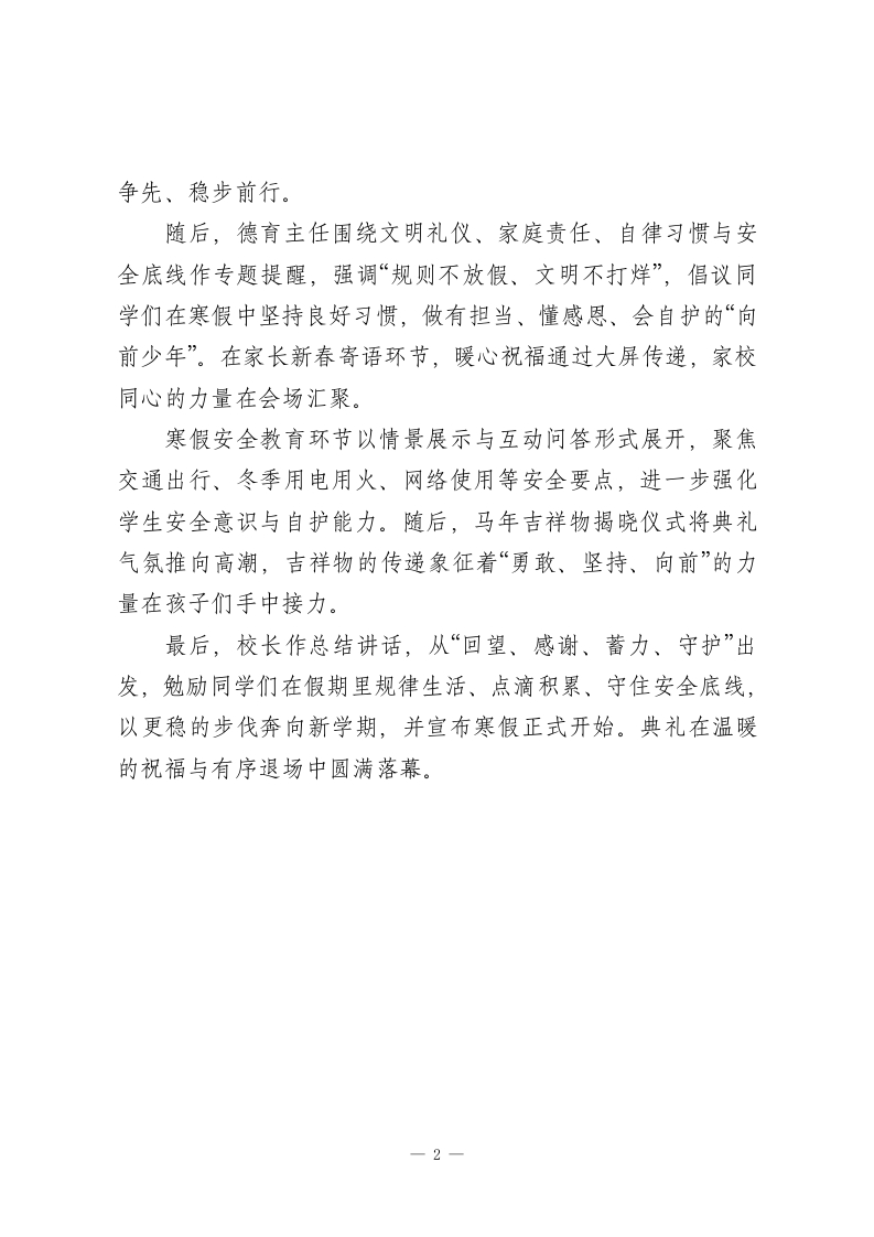 2026年散学典礼新闻稿骐骥驰骋,势不可挡为全面梳理本学期教育教学与学生成长足迹,营造温暖而有仪式感的学期“收官时刻”,1月X日上午,我校在学校报告厅举行2026年寒假散学典礼。典礼以“骐骥驰骋,势不可挡”为主题,全体师生齐聚一堂,共同回望成长、致敬努力、拥抱新春。活动伊始,同学们在“奔跑足迹墙”前签到打卡,写下本学期最自豪的成长关键词,一枚枚“马蹄印”串联起孩子们的奋斗轨迹,也为典礼注入浓浓的仪式感。随后,开场节目热烈登场,青春的律动与欢快的节奏点燃现场氛围,展现了同学们蓬勃向上的精神风貌。在成长分享环节,学生代表从学习习惯、班级生活与自我突破等方面讲述本学期收获,用真挚朴实的语言传递“向前奔跑”的信心与勇气。教师代表送出假期寄语,围绕规律作息、持续阅读、健康运动等关键词,引导同学们在轻松中不失节奏,在休息中积蓄力量。典礼的高光时刻,是表彰环节。学校对本学期表现突出的个人与集体进行集中表彰,设置“追风进步星”“踏实小骏马”“自律小骑士“热心小帮手“劳动小能手“文明礼仪星“齐心奔腾班”等荣誉。获奖同学在掌声中登台领奖,并将“荣耀印记”贴回足迹墙,榜样力量在现场流动,激励更多同学在新的一年里奋勇1