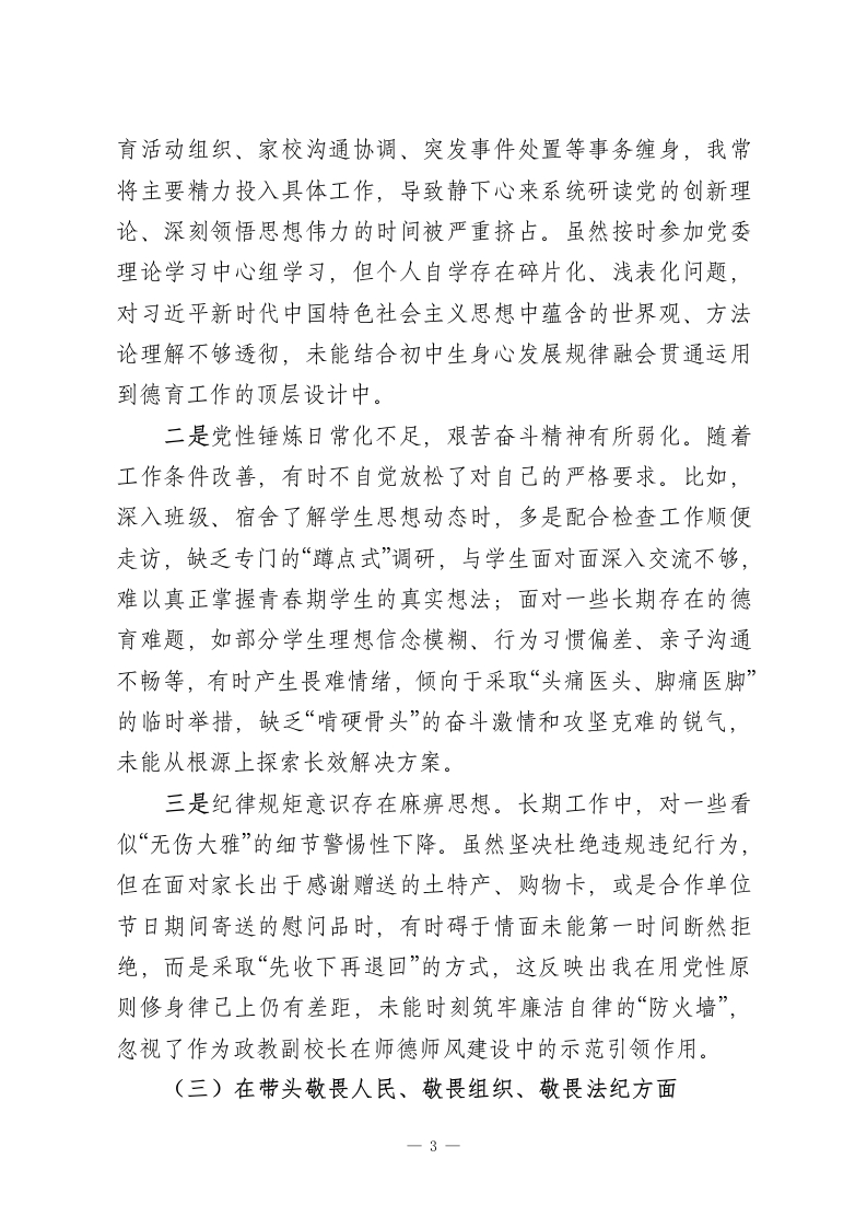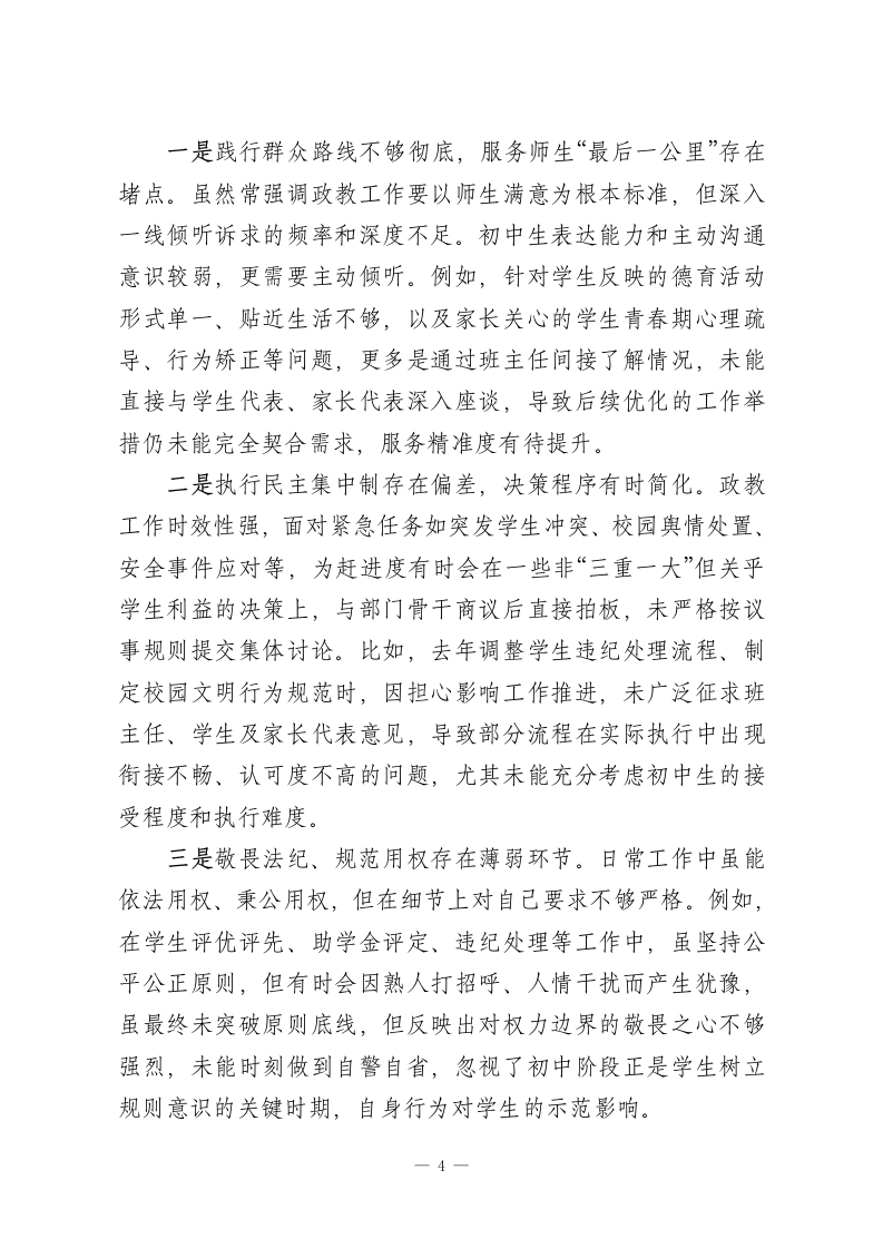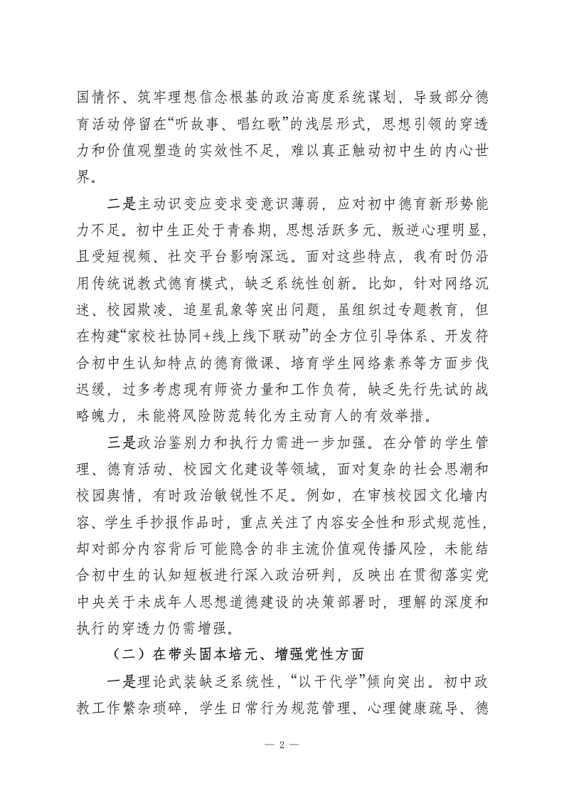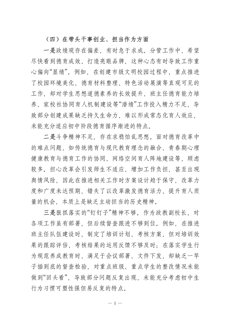 XX初中政教副校长2025年度民主生活会个人对照检查材料(五个带头)根据学校党委关于召开2025年度民主生活会的统一部署,我紧扣会议主题,深入学习领会习近平新时代中国特色社会主义思想、党的二十届三中、四中全会精神,以及习近平总书记关于基础教育、未成年人思想道德建设的重要讲话和重要指示批示精神,结合深入贯彻中央八项规定精神学习教育,扎实开展党性分析与自我剖析。通过广泛征求师生代表、家长委员及同事意见,深入开展谈心谈话,全面查摆自身在思想、政治、作风、能力、廉洁等方面的差距与不足。现将个人对照检查情况报告如下。一、存在的主要问题对照本次民主生活会“五个带头”重点查摆内容,我坚持把自己摆进去、把职责摆进去、把工作摆进去,结合初中阶段学生身心发展特点和政教工作实际,深入检视梳理,发现仍存在以下亟待解决的问题。(一)在带头强化政治忠诚、提高政治能力方面一是理论学习与初中政教工作实践融合不深,“学用脱节”问题明显。在将“两个确立”的决定性意义转化为推动初中未成年人思想道德建设的具体行动上,思考深度和谋划精度不足。例如,在推进“红色基因进校园”系列活动时,更多聚焦活动流程设计、参与覆盖面等表面指标,却未充分对标党中央关于“立德树人”根本任务在初中阶段的具体要求,未能从培养青少年家1