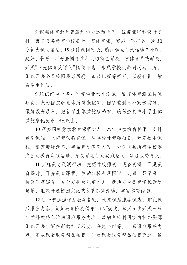 XX县教育局2026年基础教育工作要点2026年是全县教育十五五规划开局之年,全县基础教育将以“双振兴”为契机,围绕义务教育优质均衡创建和全局年度教育重点工作,深入贯彻落实国家和省市教育工作会议精神,持续优化城乡学校布局,规范办学行为,加大五育融合推进力度,促进学校健康发展、学生全面发展,城乡教育优质发展。1.深入推进习近平新时代中国特色社会主义思想和社会主义核心价值观进校园。落实大中小思政课一体化建设,鼓励学校依托德育精品课、德育案例评选,挖掘课程思政元素,开展思政课程研究,上好思政课;依托红色研学、“新时代好少年”学习宣传、学雷锋志愿服务、校园雷锋评选、“红石榴杯”征文演讲、“传承红色基因”系列德育主题活动开展思政实践活动,加强未成年人思想道德建设,筑牢思想根基。2.举办全县初中、小学第二届班主任论坛,组织开展“中国信保”全县中小学骨干班主任培训,举办中小学班主任基本功大赛,推动名班主任工作室建设,发挥市级名班主任工作室辐射带动作用,提高班主任管班、治班的能力和水平。评选“三好学生”“优秀学生干部”“先进班集体”,做好市级评优推荐上报。3.开展书香校园建设,倡导教师共读一本书、学生共读课标推荐读本活动,通过开展经典诵读、亲子共读、校园读书创作、等活动,引导师生多读书、读好书。评选书香校园、书香班级、读书标兵、阅读推广人、浓郁书香校园氛围,丰盈师生精神家园。