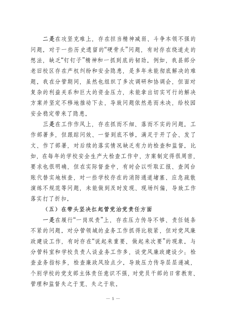 XX县教育体育局副局长2025年度民主生活会个人对照检查材料根据县委关于召开2025年度民主生活会的统一部署,本人紧扣会议主题,深入学习了习近平新时代中国特色社会主义思想、党的二十届三中、四中全会精神以及习近平总书记系列重要讲话和指示批示精神。通过深入开展中央八项规定精神学习教育,并结合谈心谈话、征求意见等多种形式,我进行了深刻的党性分析和自我剖析,现将个人对照检查情况报告如下。一、存在的主要问题(一)在带头强化政治忠诚、提高政治能力方面一是在政治判断上,存在站位不高、看齐不快的问题。对“两个确立”决定性意义的领悟,有时还停留在理论认同层面,转化为政治行动的敏锐性和果决性尚有欠缺。例如,在推进我县创建“全国体教融合示范县”工作中,初期我更多地从提升本地体育竞技水平和学生身体素质的业务角度去思考和部署,对这一举措在服务国家人才强国战略、筑牢青少年理想信念根基方面的深远政治意涵,领会不够及时和深刻,导致在向上级部门汇报工作进展时,未能充分展现出我县教育体育工作服务国家大局的政治站位。二是在政治领悟上,存在学用脱节、转化不力的问题。对党中央的大政方针和省、市、县委的工作要求,虽然能够做到坚决拥护和及时传达,但在结合分管领域实际、创造性地抓好贯彻落实上,思考得不够深入。去年,市里下发了关于加强中1
