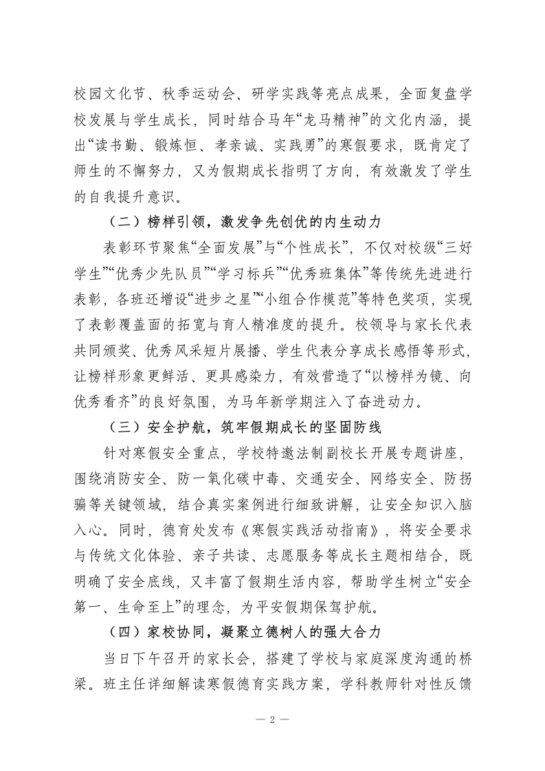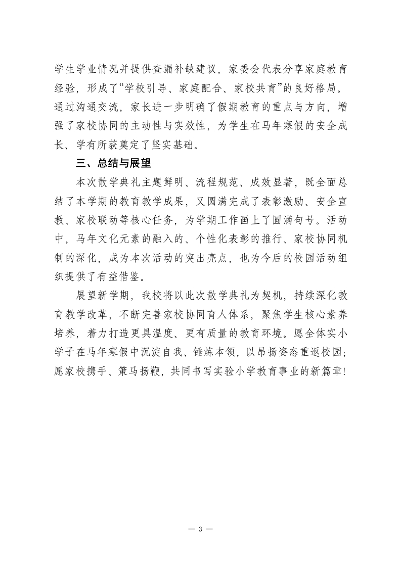 策马扬鞭承佳绩,家校协同启新程实验小学2025-2026学年第一学期散学典礼活动总结为全面总结本学期教育教学工作,表彰先进树立榜样,筑牢寒假安全防线,搭建家校协同育人桥梁,我校于2026年1月23日成功举办“策马扬鞭承秋实,蓄力启新赴春程”2025-2026学年第一学期散学典礼。活动覆盖全体师生及家长代表,通过庄重仪式、多元环节、精准部署,实现了“总结成长、表彰激励、安全护航、家校联动”的核心目标,现将活动总结如下:一、活动概况本次散学典礼以“马年启新、蓄力成长”为核心主线,分为校级集中典礼与班级特色活动两大板块,同步衔接下午家长会。校级典礼涵盖升旗仪式、校长致辞、先进表彰、安全讲座四大环节,班级活动聚焦学期复盘、个性化颁奖、寒假规划交流,家长会围绕学业反馈、德育实践、家庭教育指导展开。全程流程紧凑有序、氛围庄重温馨,既彰显了学校的育人理念,又贴合马年新春的节日氛围,得到了师生及家长的广泛认可。二、主要成效(一)仪式赋能,厚植家国情怀与成长意识典礼以庄严的升旗仪式开篇,国旗班学子的规范表现、全体师生的肃立致敬,强化了爱国主义教育的仪式感,让学子在庄重氛围中体悟责任与担当。校长致辞立足本学期教学提质、