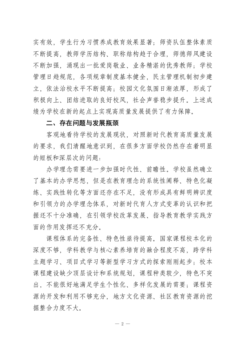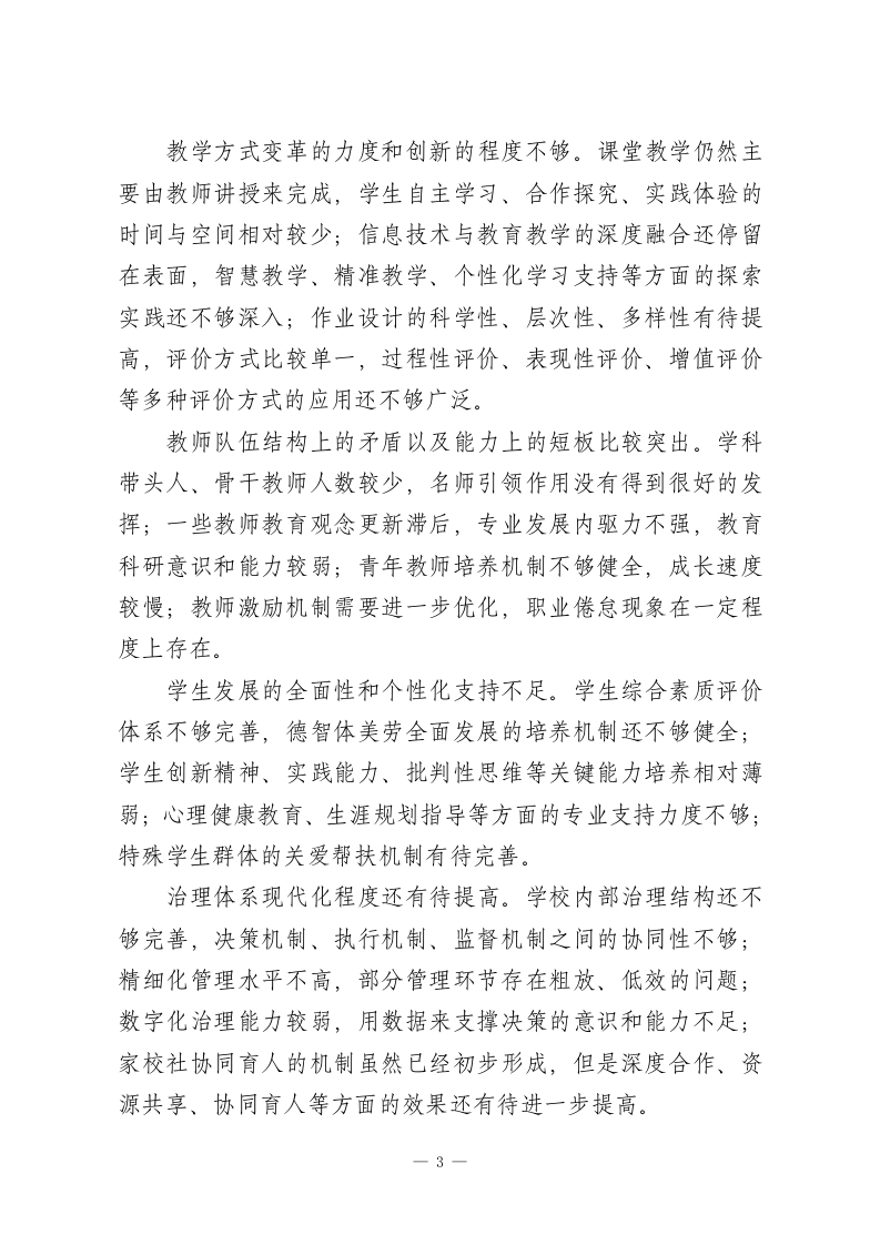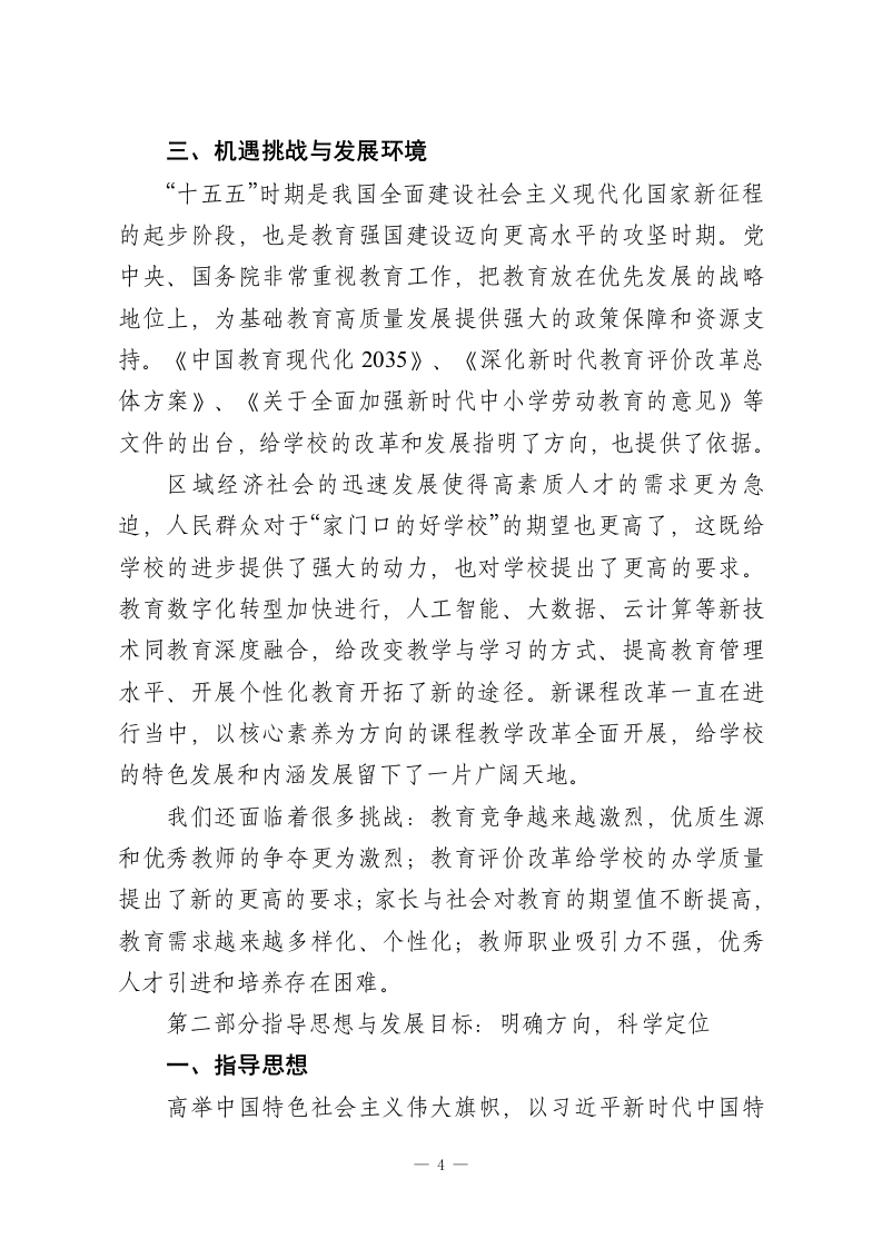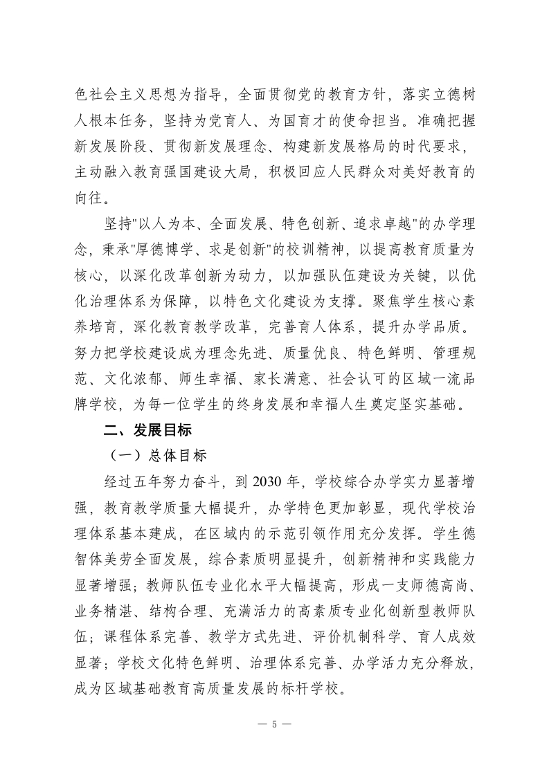 初级中学“十五五”发展规划(2026-2030年)正值“十四五”规划收官、“十五五”规划即将全面铺开、教育强国建设向纵深推进的重要历史时刻,我校处于承前启后的关键位置,深入学习和贯彻党的教育方针,准确抓住新时代教育改革发展的战略机遇与时代要求。面对人民群众对于优质教育资源的渴望,面对区域经济社会发展对于创新人才的急切需要,面对教育现代化过程中所遇到的机会和困难,学校要从更高的角度来规划发展,用更加扎实的办法来推动改革,用更大的力气来提高质量。本规划立足于学校的实际情况,参照先进的办学理念,以内涵建设为主线,坚持问题导向和目标引领相结合的原则,对未来的五年(2026-2030)学校的改革与发展做出系统的规划,绘制出一幅清晰的蓝图,为建设特色鲜明、质量一流、得到社会认可的现代化品牌学校提供坚实的保障,也为培养德智体美劳全面发展社会主义建设者和接班人打下基础。第一部分发展基础与形势分析:审视现状、洞察未来一、发展基础与优势积淀经过多年的努力和发展,学校在办学条件、教育质量、师资队伍、校园文化等方面都取得了很大的进步,积累了丰富的经验,打下了坚实的基础。办学条件明显改善,教学楼、实验楼、图书馆、运动场等基础设施日益完善,功能教室配置基本齐全,教育信息化水平稳步提高;教育教学质量稳中有进,学生学业水平测试成绩在区域内保持中等偏上水平,德育工作扎1