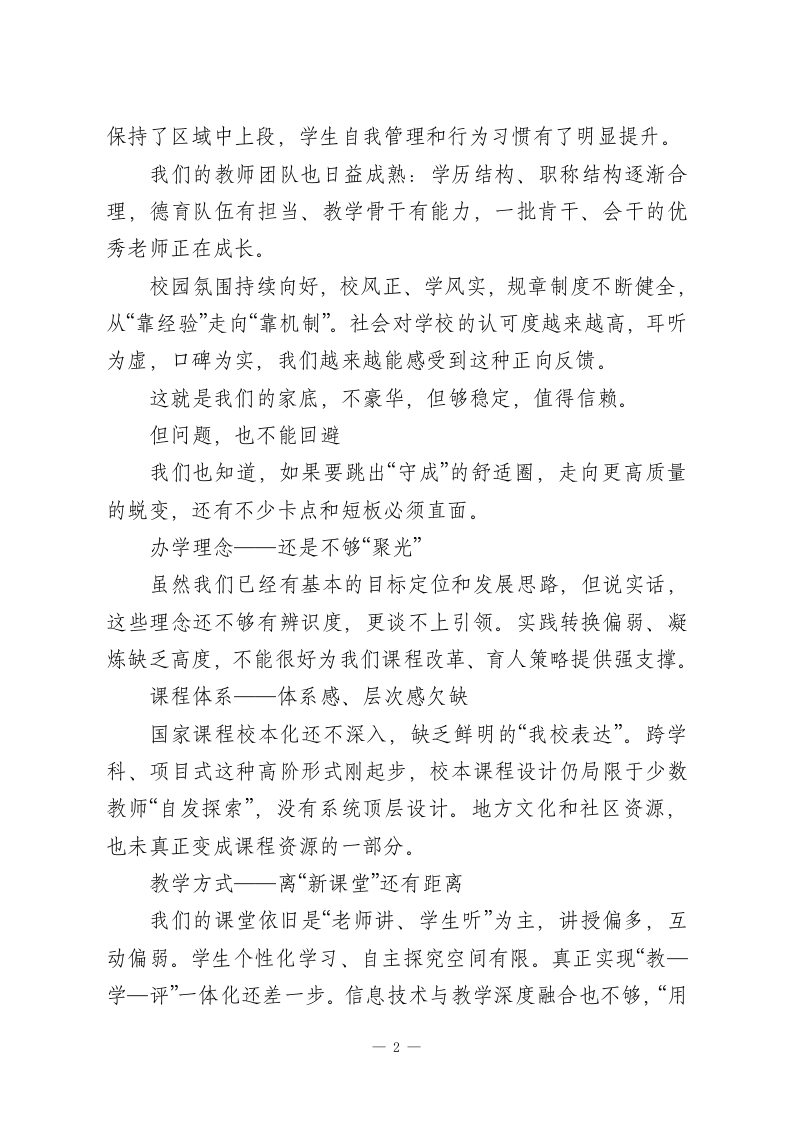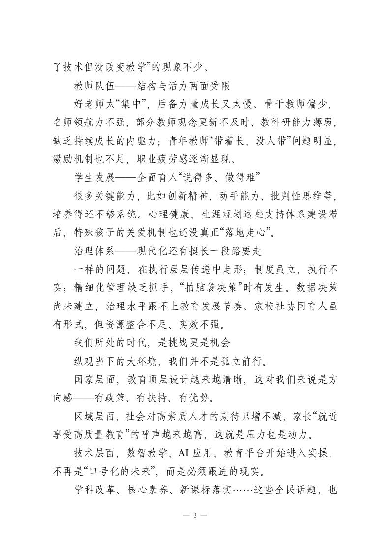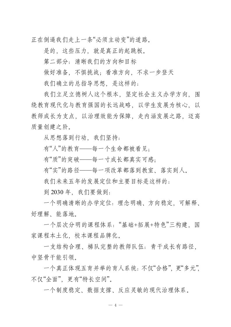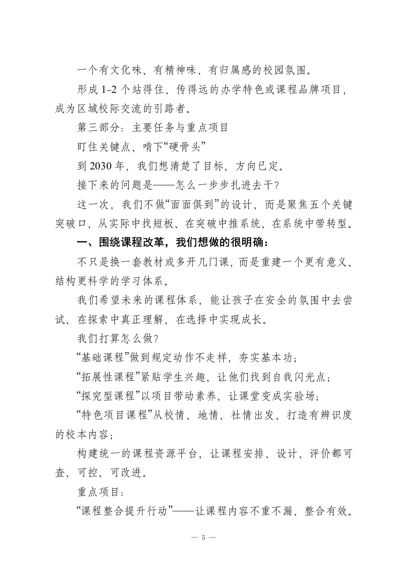 初中“十五五”发展规划(2026-2030年)眼下正值“十四五”步入尾声,“十五五”又即将全面展开,而我们的教育,正在迎来一个从“基础普及”到“质量提升”、从“数量扩张”到“内涵发展”的关键阶段。站在这样的历史节点上,我们学校也处于一个承前启后的重要转折点。我们既要总结过去的经验和成绩,更要抬头看看未来一一人民群众对更好教育的期望、区域社会对创新人才的急切需求、教育现代化进程中的各种“新可能”和“老问题”都已摆在我们面前。接下来的五年,我们怎么干?往哪走?能走多远?这份“十五五发展规划”就是我们给的回应。这不是一张愿景蓝图,更是一次脚踏实地的行动设计。我们立足自己的实际,也参考了先进的经验,但最重要的,是回到那个初心:我们要办一所有个性、有品质、有温度的学校;我们要为每一个孩子的全面成长打下更扎实的基础。第一部分:我们成长的底子和要去破解的“卡点”咬不动的问题、提不上去的质量、迈不开步的结构,这些我们都看见了我们的基础,其实不算差几年来学校“硬件”条件整体在上升。教室、实验楼、运动场、图书馆一个个空间完善起来,用起来也越来越顺手。信息化建设也没落下,智慧教室、部分教学工具已经投入使用。教育教学方面,我们趟出了一条“稳中靠前”的路子。成绩1