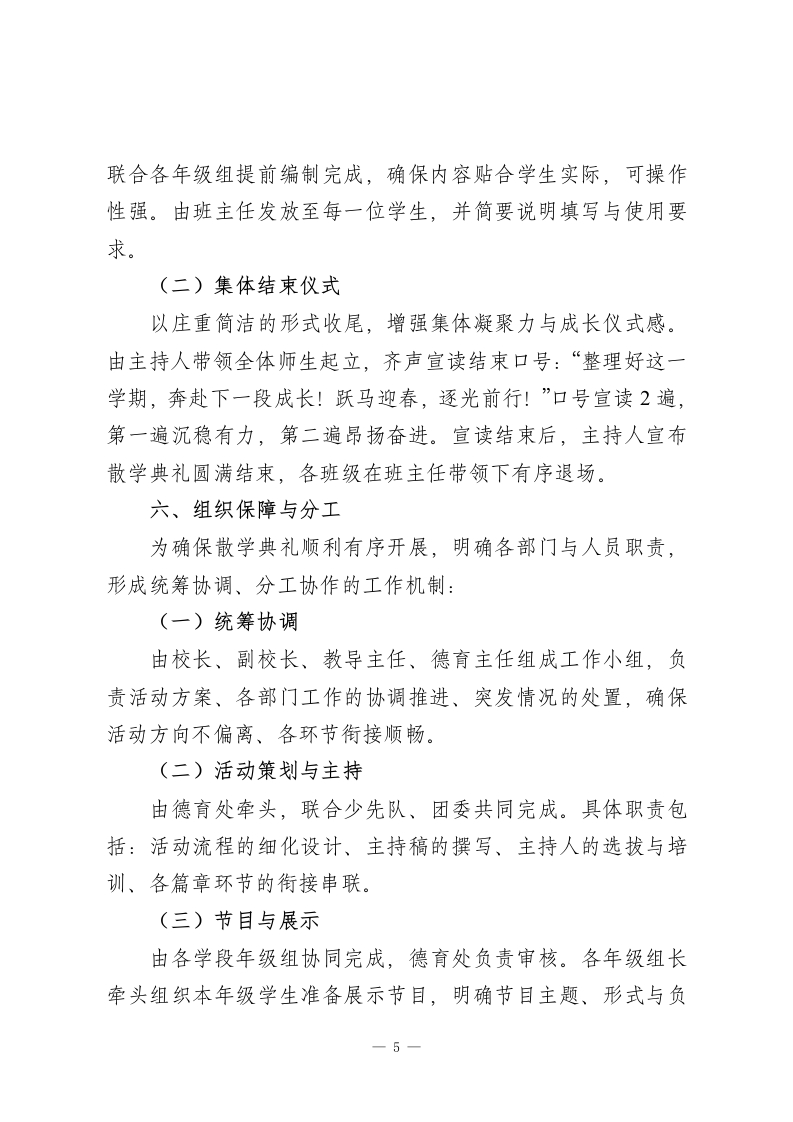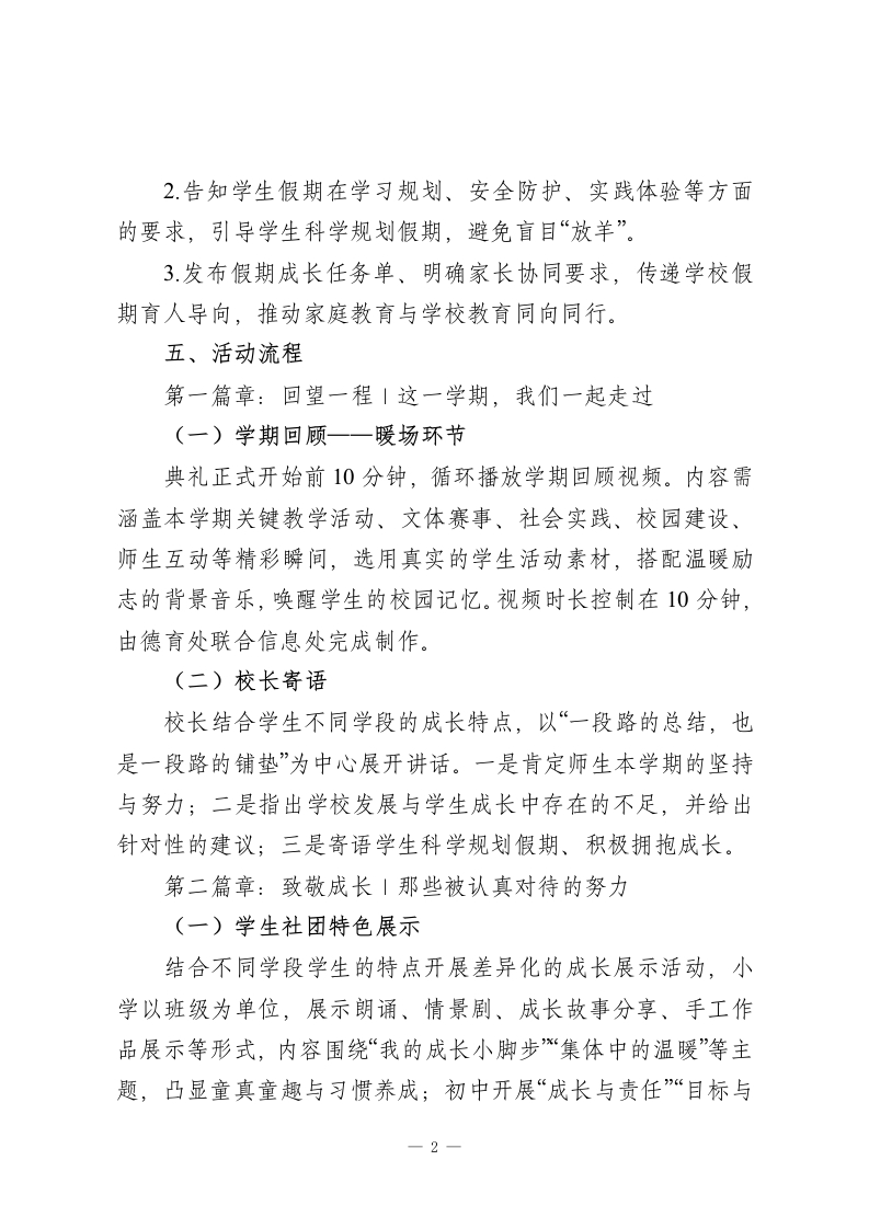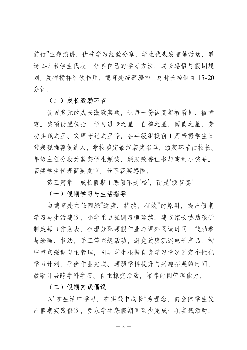 冬深一程跃马迎春一页已读一章将启学校2026马年寒假散学典礼方案一、活动背景在“收官”与“出发”之间,我们需要给学生一次完整的暂别。一学期的学习生活即将画上句号,寒假既是学生调整身心、拓展视野的重要时段,也是学校开展假期教育指导、落实安全教育和成长引导的重要节点。学校通过一次有温度、有指向、有力量的散学典礼,帮助学生回望一程、整理一程、期待一程,以更加良好的状态迈向寒假生活。二、活动主题冬深一程跃马迎春一页已读一章将启。既饱含对全体师生过去一学期辛勤付出与不懈努力的肯定与致敬,也寄托着对新一年成长节奏的温和唤醒,鼓励师生以昂扬姿态迎接新春、奔赴新程。三、活动时间与地点活动时间:2026年1月19日上午9:00-11:00活动地点:学校报告厅参与对象:全体师生、部分学生家长四、活动目标本次散学典礼以“有用、有感、有记忆点”为目标:1.通过学期回顾与多元化的成长激励,帮助学生客观梳理本学期的成长收获,清晰认知自身不足。-1
