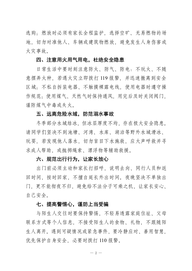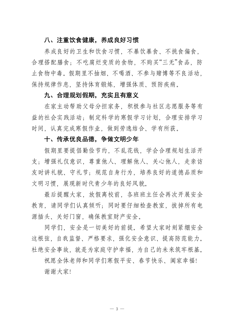分管安全副校长闭学式讲话:把安全记心中,平安过寒假老师们、同学们:大家好!寒假已至,春节临近。为了让全体师生度过一个平安、快乐、文明、祥和的假期,今天我重点和大家强调假期安全事项。安全无小事,责任大于天,希望大家认真倾听、严格遵守,真正做到“安全第一,从自已做起;安全第一,从小事做起”。一、绷紧安全之弦,筑牢思想防线大家要牢固树立“安全第一”的理念,深刻认识安全的重要意义。关注安全就是关爱生命,我们要把“我要安全、我懂安全”刻在心里,时时讲安全、事事讲安全、人人讲安全,让安全意识成为日常习惯,确保假期里每个人都能平平安安。二、严守交通规则,平安出行无忧春节是走亲访友的高峰期,也是交通安全事故的多发期。请同学们务必遵守交通法规:外出时走人行道、过人行横道,不闯红灯、不横穿马路;乘车时选择有营运资质、车况良好的车辆,坚决不坐无牌无照、超载拥挤的车。若不慎发生交通事故,要第一时间通知家长,并及时拨打120抢救伤员、122报警求助。三、规范燃放烟花,防范安全风险年关将至,烟花爆竹开始大量上市,部分“三无”劣质产品存在极大安全隐患。购买时务必在家长陪同下,到正规经销点一1