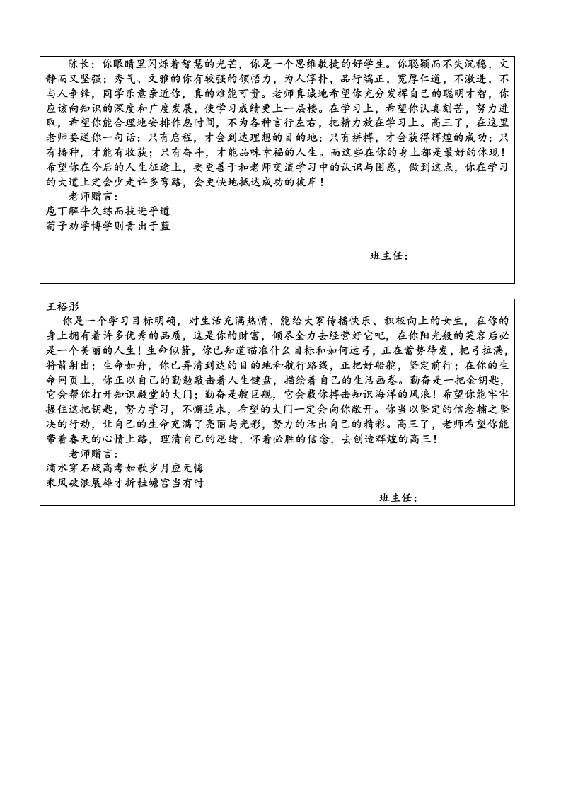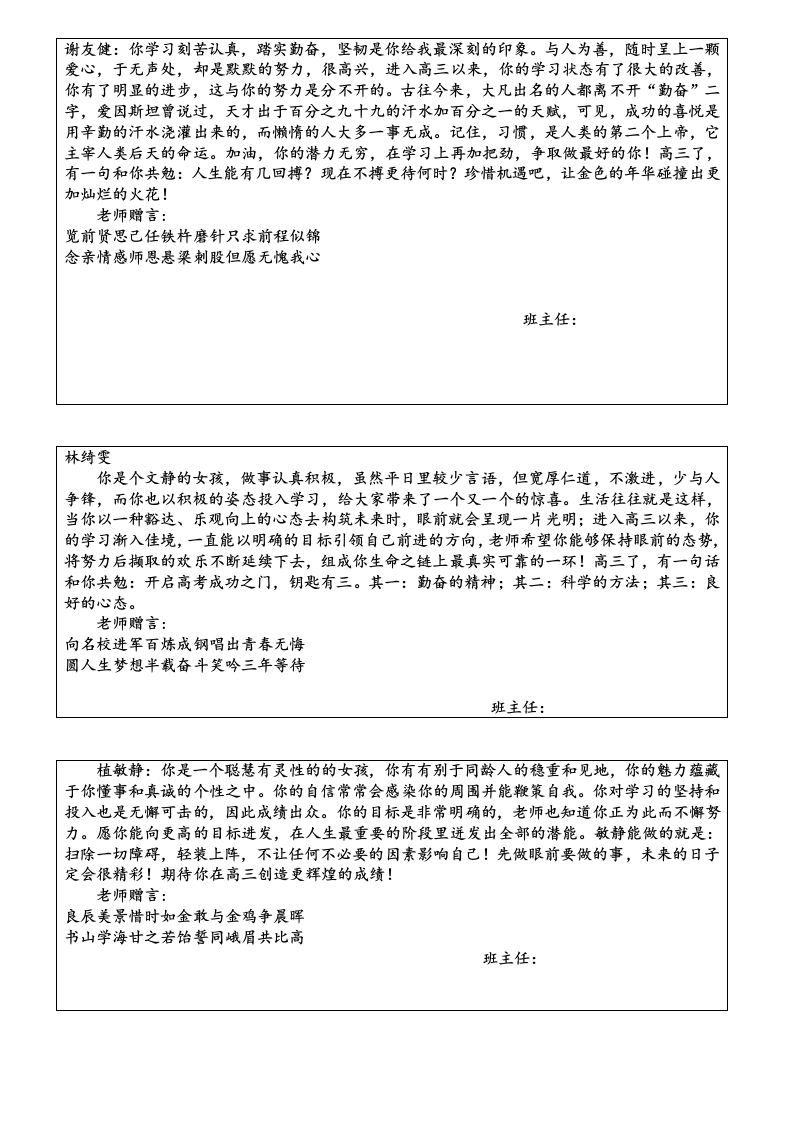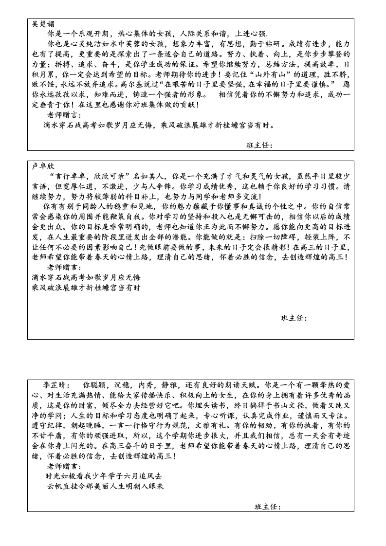 梁风萍:你外表睿智,潜质深厚,会是个很有出息的孩子。你用踏实的学习态度、谦虚的求学精神、不甘平庸、锐意进取的生活作风向我们诠释了你是一个优秀的学生,这个学期你经过艰难的磨合历程,你继续收获可喜的成绩。优秀是一种习惯,这句话就是对你最好的诠释。高质量地上好每一天的课,高效率地完成当天的作业,绝对遵守纪律,绝对服从老师的指挥,谦虚谨慎,从不骄傲自满,孜孜以求,对梦想坚定与狂热,正是这些优秀的品性使你远远走在了别人的前头。当然在学习上永远没有最好,只有更好,在求知之路上,在追求分数上永远没有巅峰。希望你一如既往,更加努力奋斗,最大限度地发掘自己的潜力,实现最高质量的人生梦想。同时老师也希望你的星星之火能够在班级四处撒播,点燃更多的理想和希望,使之成为燎原之势。让我们携手并进共铸辉煌。老师赠言:拼十年寒窗挑灯苦读不畏难携双亲期盼背水勇战定夺魁班主任:陈学妍你一直努力,而且是在真诚的努力着,你的勤奋有目共睹,但你还没彻底改掉一些不良习惯,你要注意克服浮躁情绪,坚定、踏实,提高效率,记住学习要持之以恒,一分耕耘一分收获。今天的成绩就是你今后在社会上生存的资本。学习中出现波动是正常,只要我们执着地去作一件事,那么从长远看,胜利必将属于你。请你珍惜自己所拥有的一切,并大胆地去开拓进取,你将会发现生活就该如此阳光灿烂!我们知道,你强烈向往大学,大学那闪光的招牌正照耀着你的眼睛,但理想是美丽的,现实却是残酷的,在荆棘丛生的风雨途中,险象环生、困难重重,只有坚韧不拨的人,只有顽强毅力的人,只有耐得住寂寞并且有着良好心理素质的人才能最终到达希望的巅峰。老师赠言:一年之计春为早;千秋大业志当先。班主任:陆聪尊敬老师、热爱集体、心地善良、乐观大方、积极向上…这些优点会使你活得比别人快乐。你专心地学习,努力地追求,在宁静的校园里做着纯净的学问。你愿坐冷板凳,心无旁鹜,一头扎进书山题海,用极虔诚的心灵坚定地编织和设计属于自己的梦想。你的心灵是阳光的,你的心态是乐观的,你总是用可爱的笑脸面对生活的每一天,执着地追求、顽强地进取,在通往理想的道路上奋然前行。虽然你有时候会感受到了失败,体会到了痛苦,那是一种付出和回报难成正比的失落与悲哀,但你永远保持战斗的姿态,愈挫愈勇,大有与天地比高低的信心和勇气。巴尔扎克说,所有坚韧不拨的努力迟早都会得到回报,摒弃侥幸之念,必取百炼成钢:厚积分秒之功,始得一鸣惊人。愿你永远保持这样高贵的姿态,当蓝色蛹经过艰难的蜕变后,一定是只美丽的金蝴蝶。老师赠言:效苏秦之刺股折桂还需苦战学陶侃之惜时付出必有回报班主任: