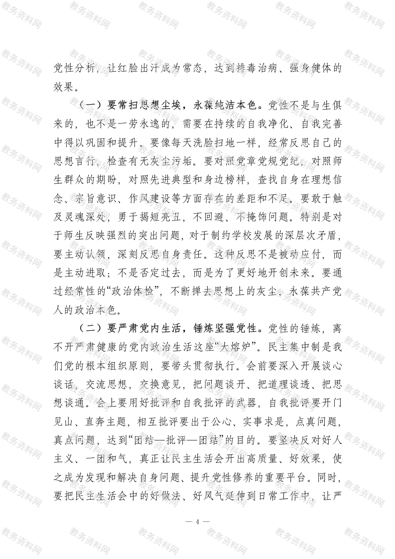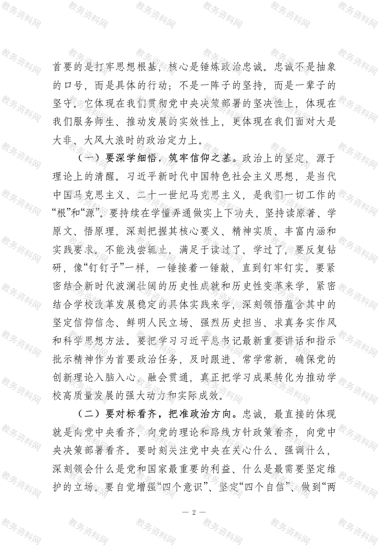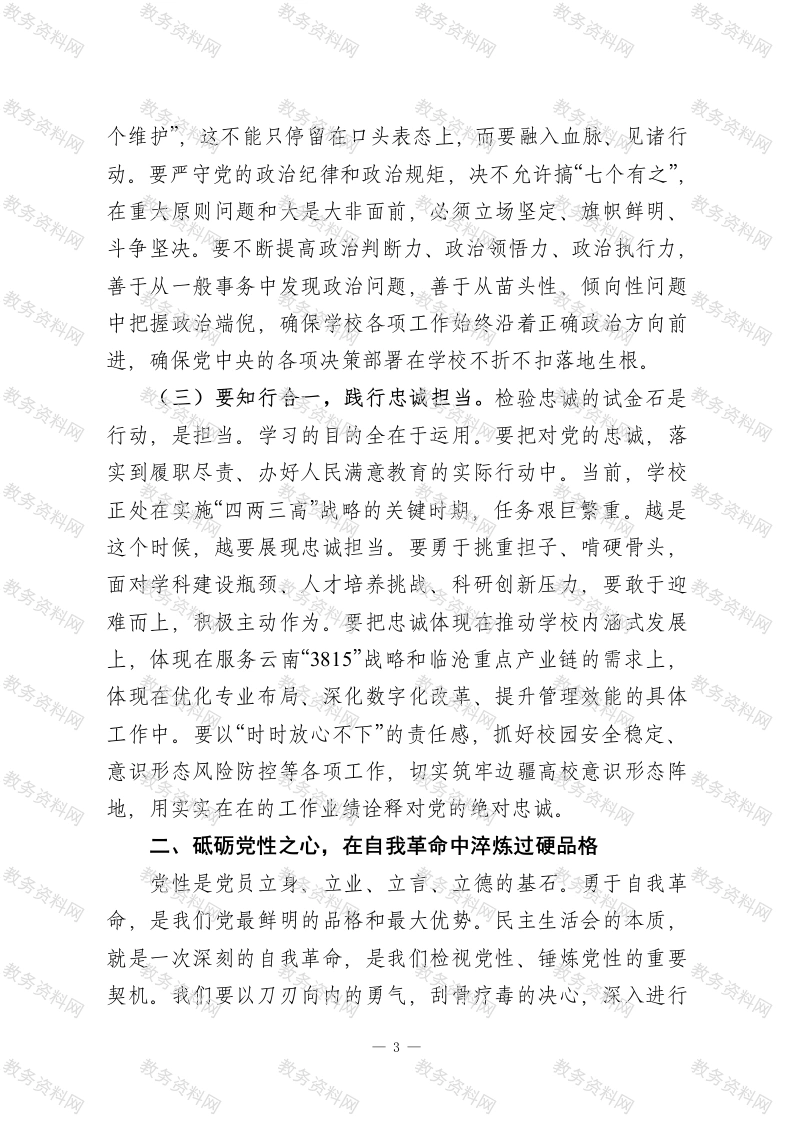 高校党委书记在2025年度党委领导班子民主生活会会前集体学习暨理论中心组集中学习会上的讲话同志们:今天,我们利用一天时间,举行2025年度党委领导班子民主生活会会前集体学习暨党委理论学习中心组2026年第一次集中学习。这次学习,主题鲜明、内容重要、意义特殊。主要目的是深入学习领会习近平总书记在中共中央政治局民主生活会上的重要讲话精神,全面贯彻落实党的二十届四中全会精神,进一步统一思想、深化认识,为接下来高质量开好校党委领导班子民主生活会打牢坚实的思想基础。刚才,我们传达学习了习近平总书记充满力量、温暖人心的二○二六年新年贺词,班子成员紧扣会议主题,围绕“政治忠诚”、“党性修养”、“自我革命”、“作风建设常态化长效化”等核心内容,结合分管领域和工作实际,逐一作了深入、坦诚的交流发言。大家谈认识、摆问题、剖根源、明方向,体现了对党忠诚的政治态度和求真务实的工作作风,达到了预期效果。这既是一次扎实的理论学习,也是一次深刻的党性锻炼,更是一次触及灵魂的思想预热。下面,结合大家的学习交流和我个人的思考,我讲四个方面的意见,与同志们共同探讨、共促共进。一、铸牢忠诚之魂,在固本培元中把稳思想之舵思想是行动的先导,理论是实践的指南。开好民主生活会,